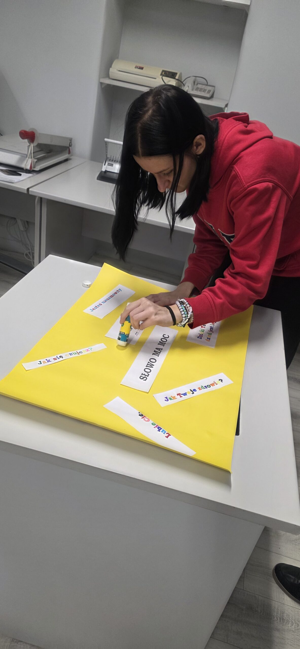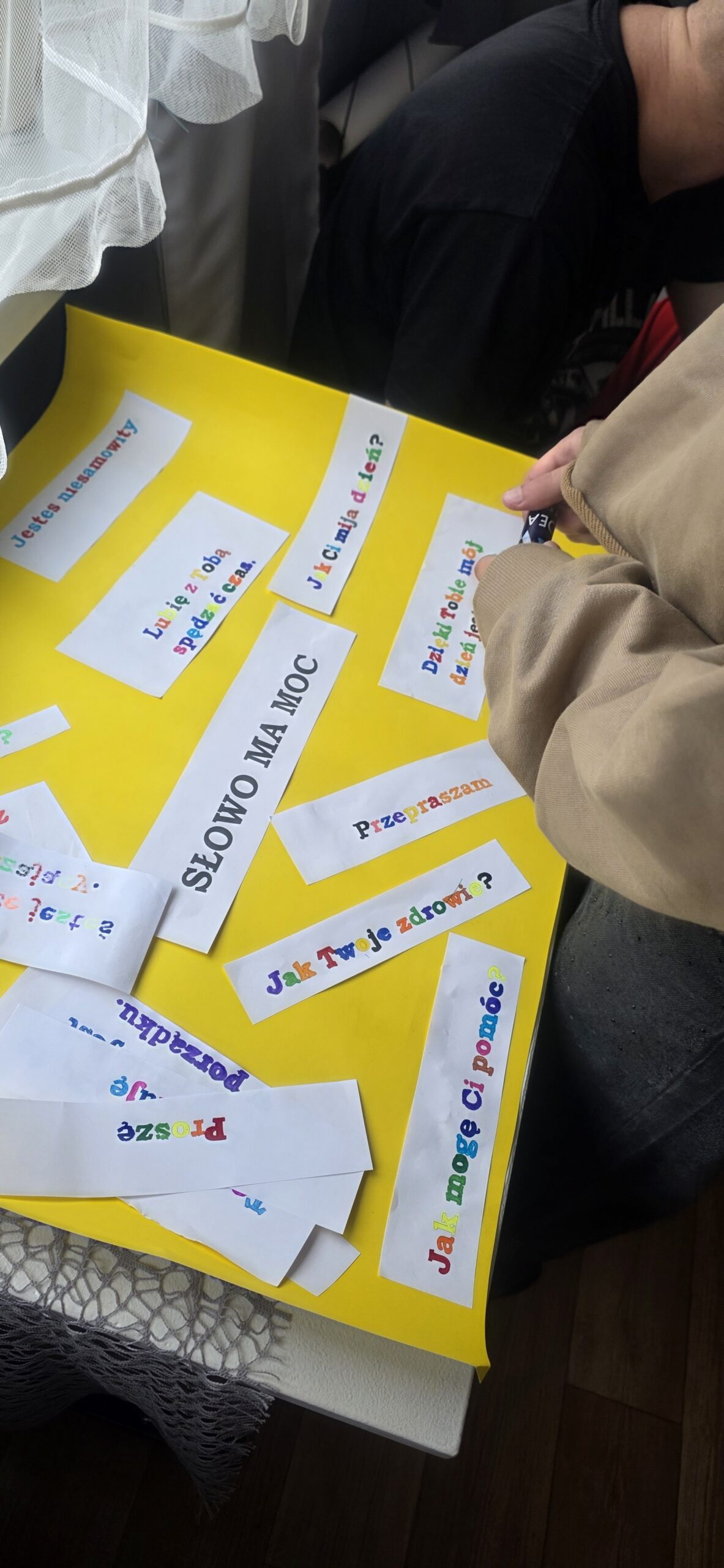 Kolejnym elementem realizacji programu było tworzenie plakatów promujących dobre słowo i kulturalne zachowanie. Uczniowie w grupach przygotowali prace plastyczne zawierające hasła zachęcające do uprzejmości, empatii i życzliwości w codziennej komunikacji.