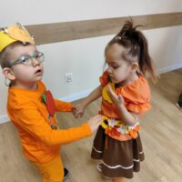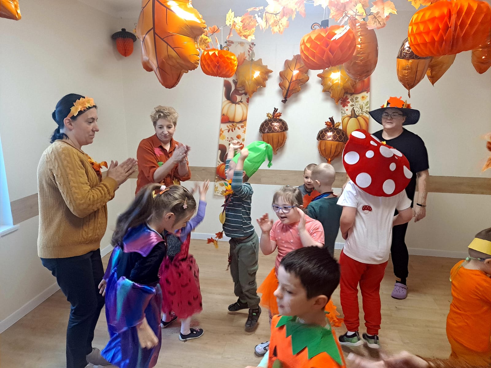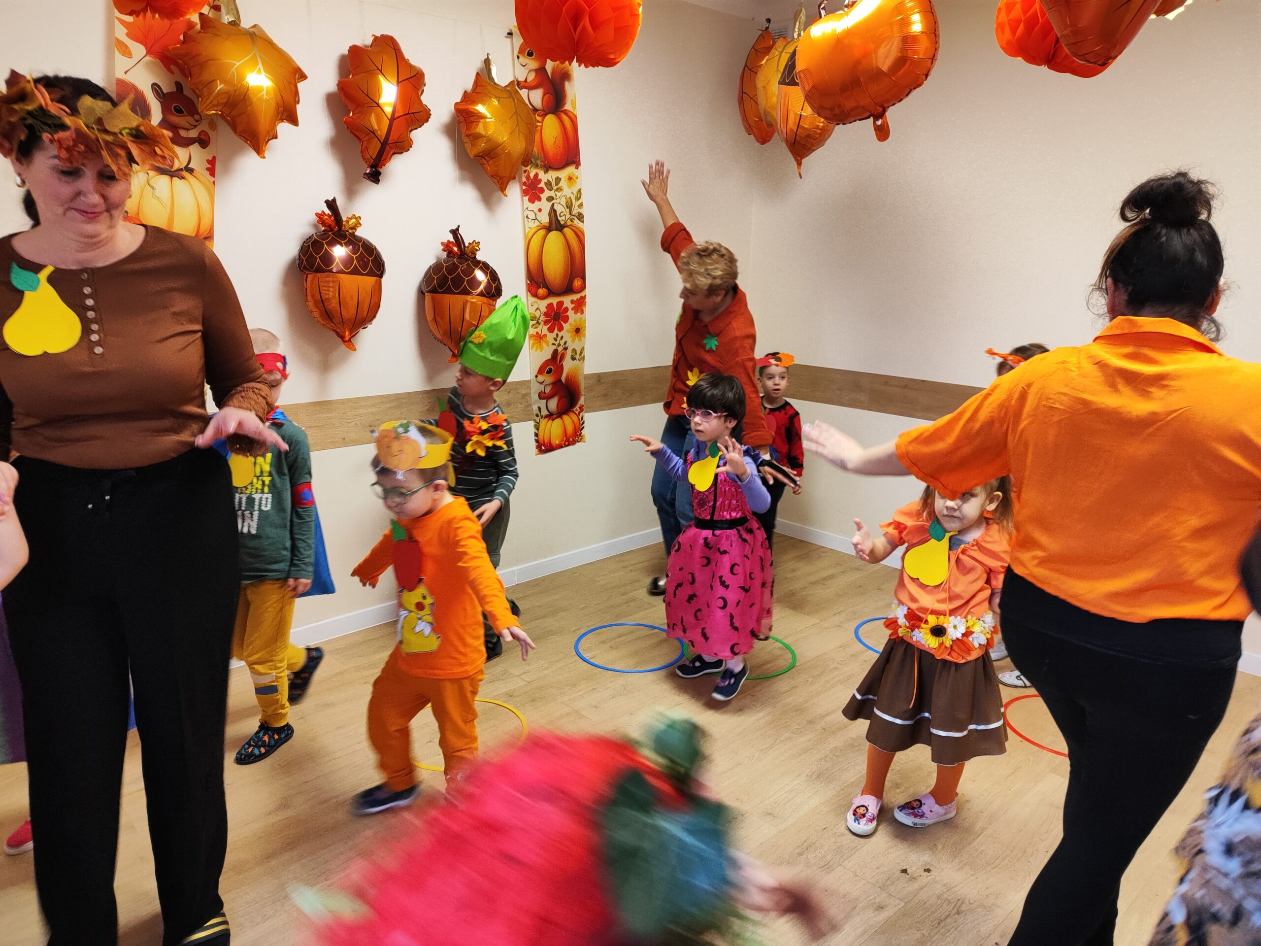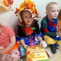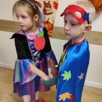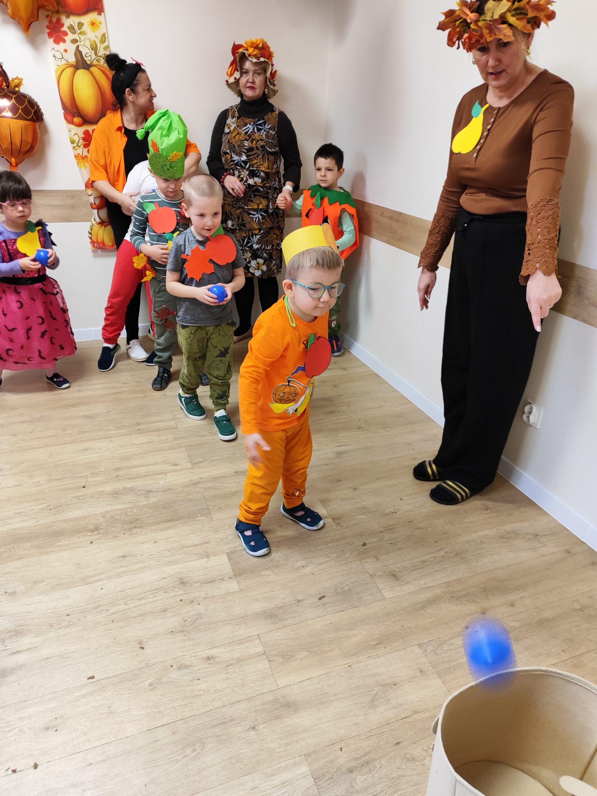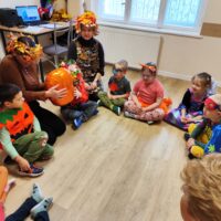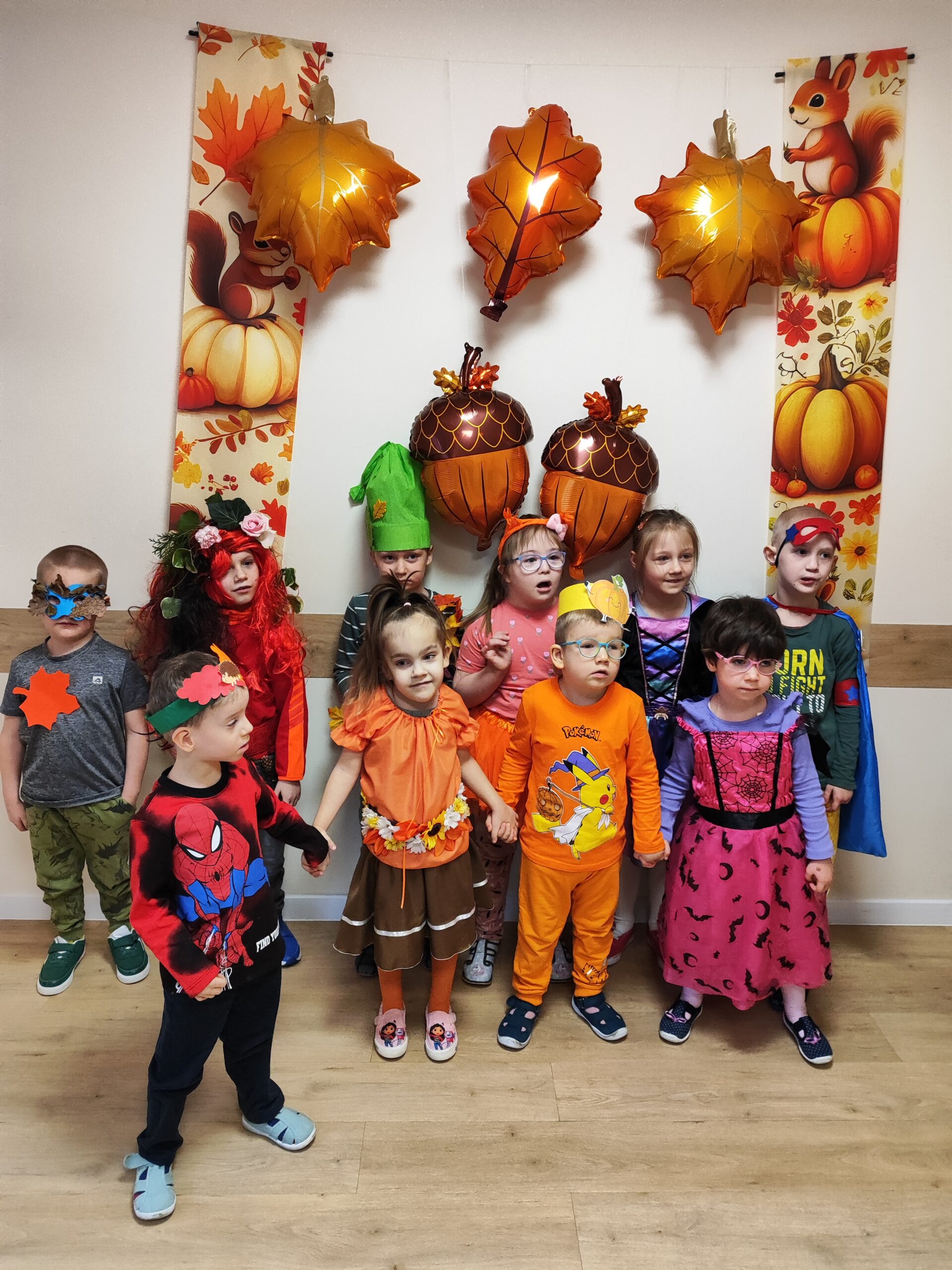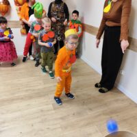 17 listopada w naszym przedszkolu odbył się Bal Jesieni. Na początku wszystkie dzieci jesiennym wierszem powitała Pani Jesień, zapraszając do wspólnej i radosnej zabawy. Dzieci ubrane w piękne kolorowe jesienne stroje bawiły się przy muzyce i jesiennych piosenkach. Rozwiązywały tematyczne zagadki i uczestniczyły w zabawach muzyczno – ruchowych. W rytm muzyki „Podaj dynię” przekazywały sobie duży balon w kształcie dyni, tańczyły w parach do piosenki „Małe czerwone jabłuszko”. Dzieci ćwiczyły również swoją celność i szybkość podczas rzutów do kosza oraz skoków do kolorowych obręczy.