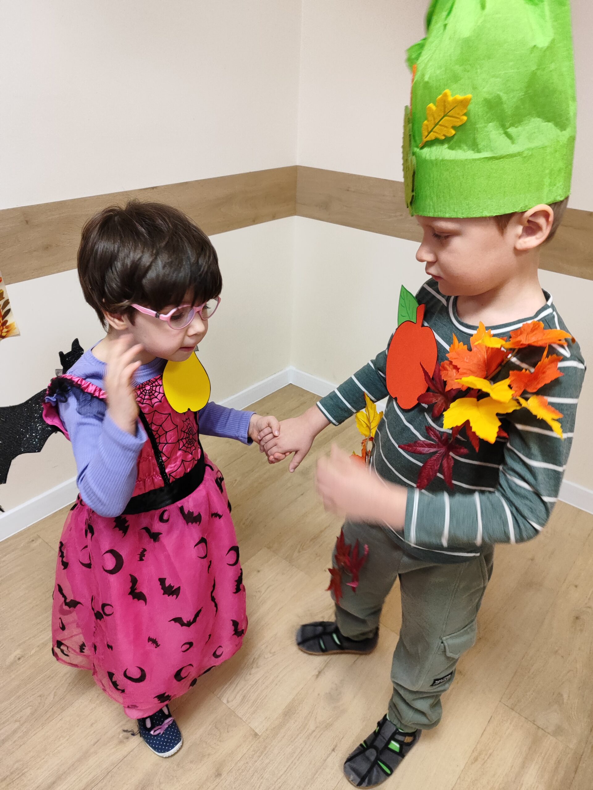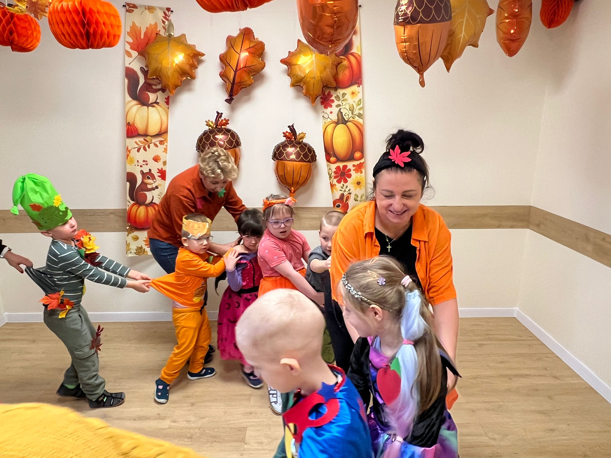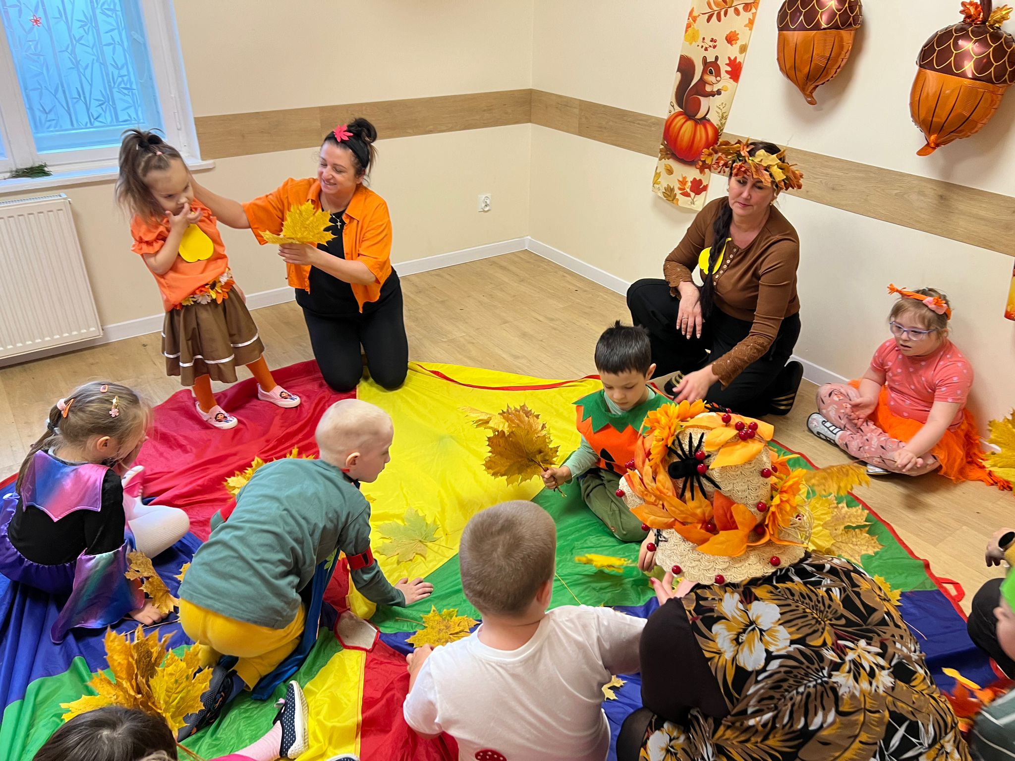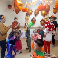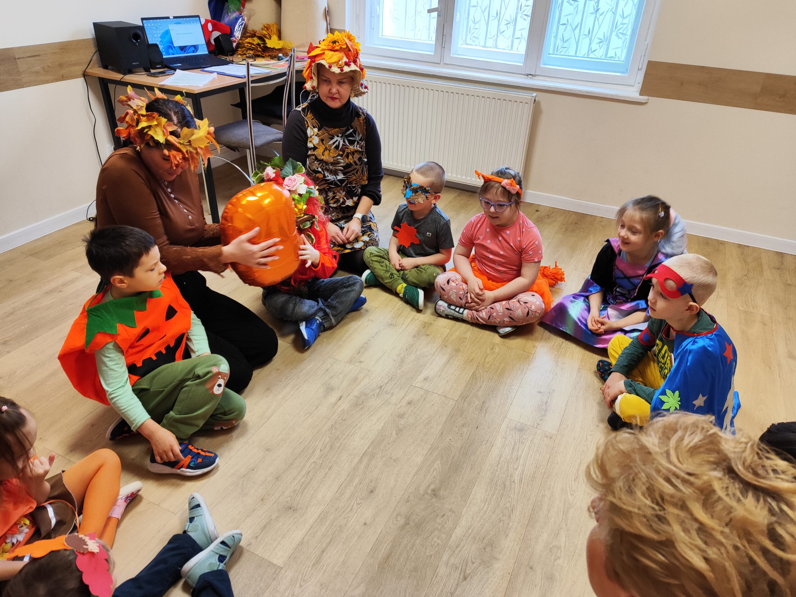 17 listopada w naszym przedszkolu odbył się Bal Jesieni. Na początku wszystkie dzieci jesiennym wierszem powitała Pani Jesień, zapraszając do wspólnej i radosnej zabawy. Dzieci ubrane w piękne kolorowe jesienne stroje bawiły się przy muzyce i jesiennych piosenkach. Rozwiązywały tematyczne zagadki i uczestniczyły w zabawach muzyczno – ruchowych. W rytm muzyki „Podaj dynię” przekazywały sobie duży balon w kształcie dyni, tańczyły w parach do piosenki „Małe czerwone jabłuszko”. Dzieci ćwiczyły również swoją celność i szybkość podczas rzutów do kosza oraz skoków do kolorowych obręczy.