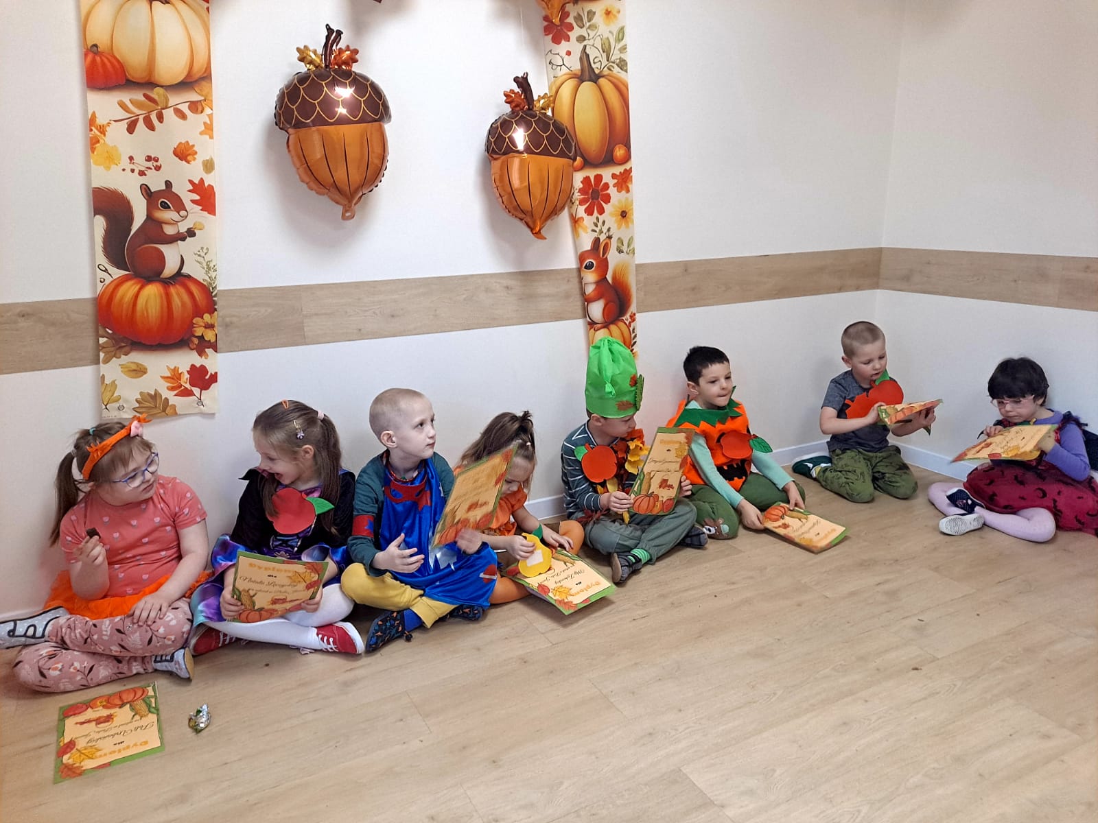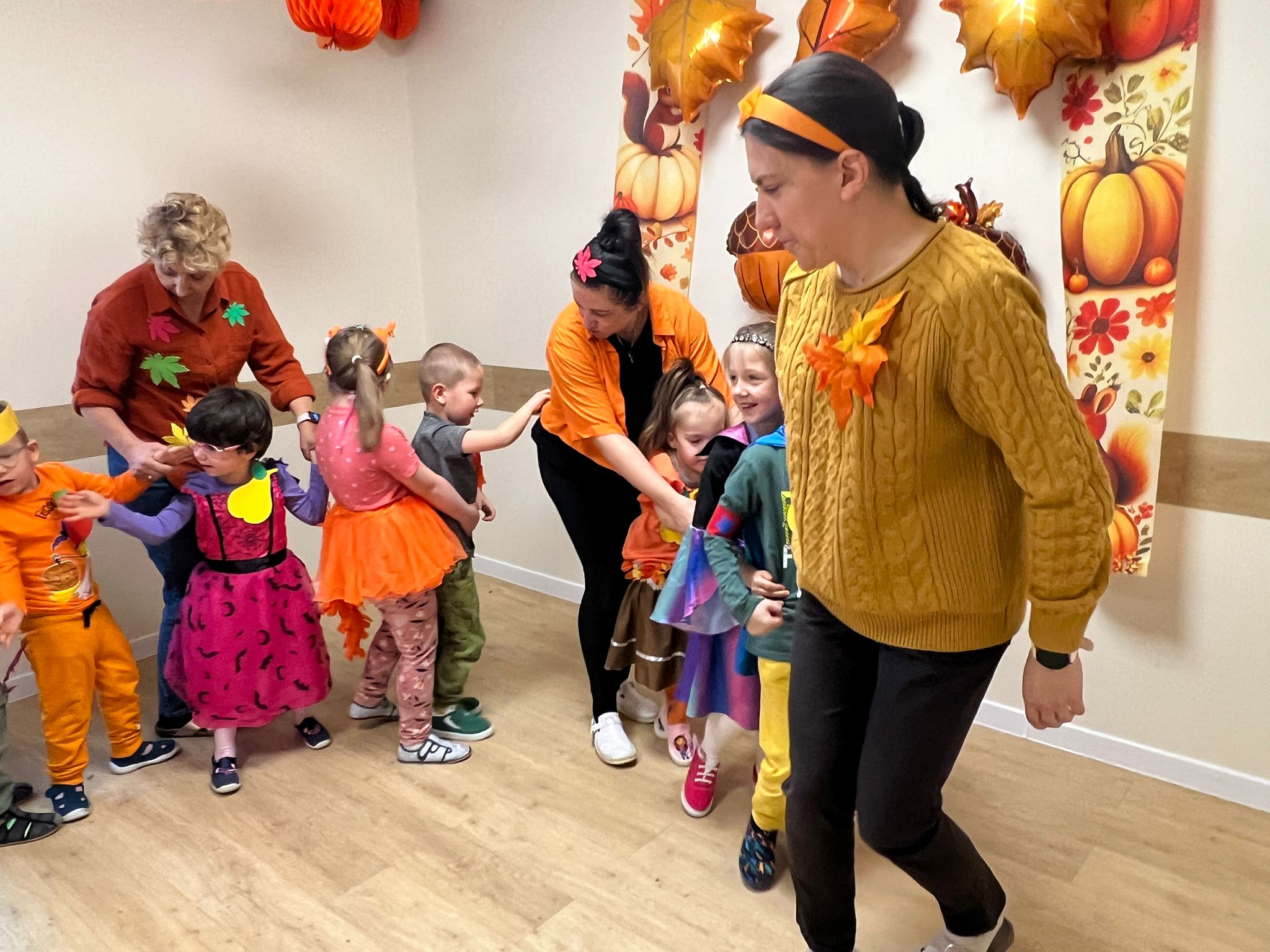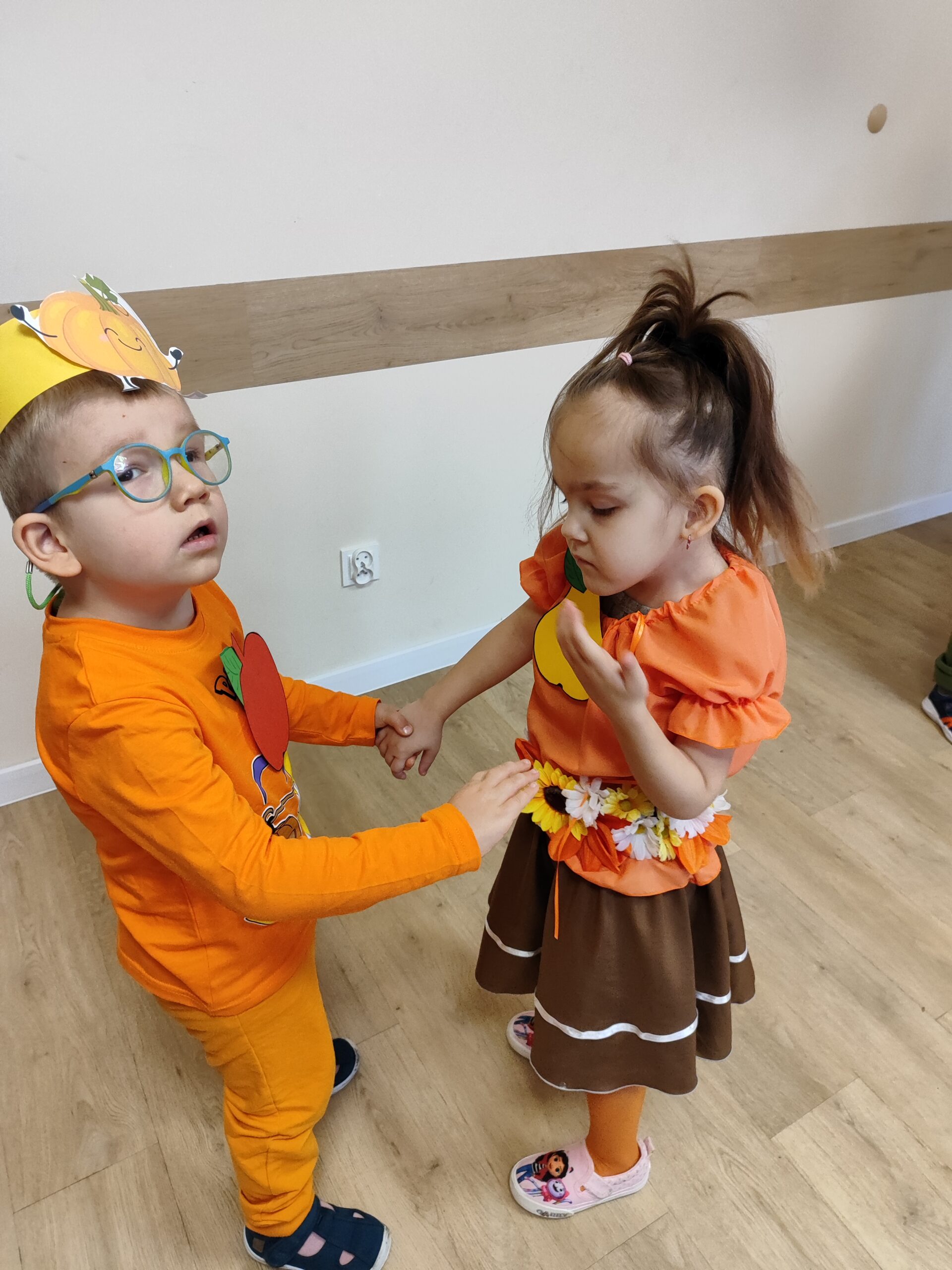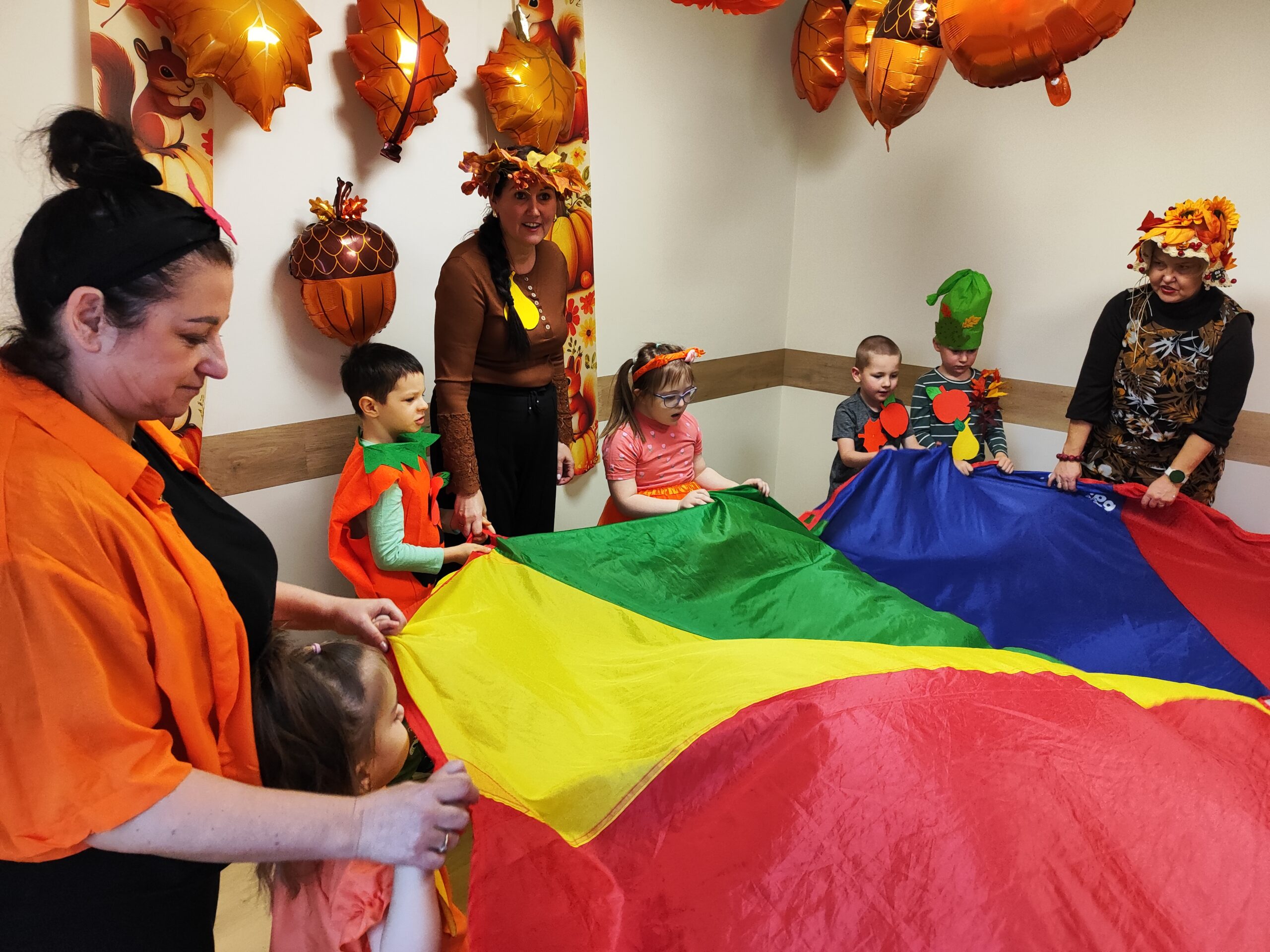 17 listopada w naszym przedszkolu odbył się Bal Jesieni. Na początku wszystkie dzieci jesiennym wierszem powitała Pani Jesień, zapraszając do wspólnej i radosnej zabawy. Dzieci ubrane w piękne kolorowe jesienne stroje bawiły się przy muzyce i jesiennych piosenkach. Rozwiązywały tematyczne zagadki i uczestniczyły w zabawach muzyczno – ruchowych. W rytm muzyki „Podaj dynię” przekazywały sobie duży balon w kształcie dyni, tańczyły w parach do piosenki „Małe czerwone jabłuszko”. Dzieci ćwiczyły również swoją celność i szybkość podczas rzutów do kosza oraz skoków do kolorowych obręczy.