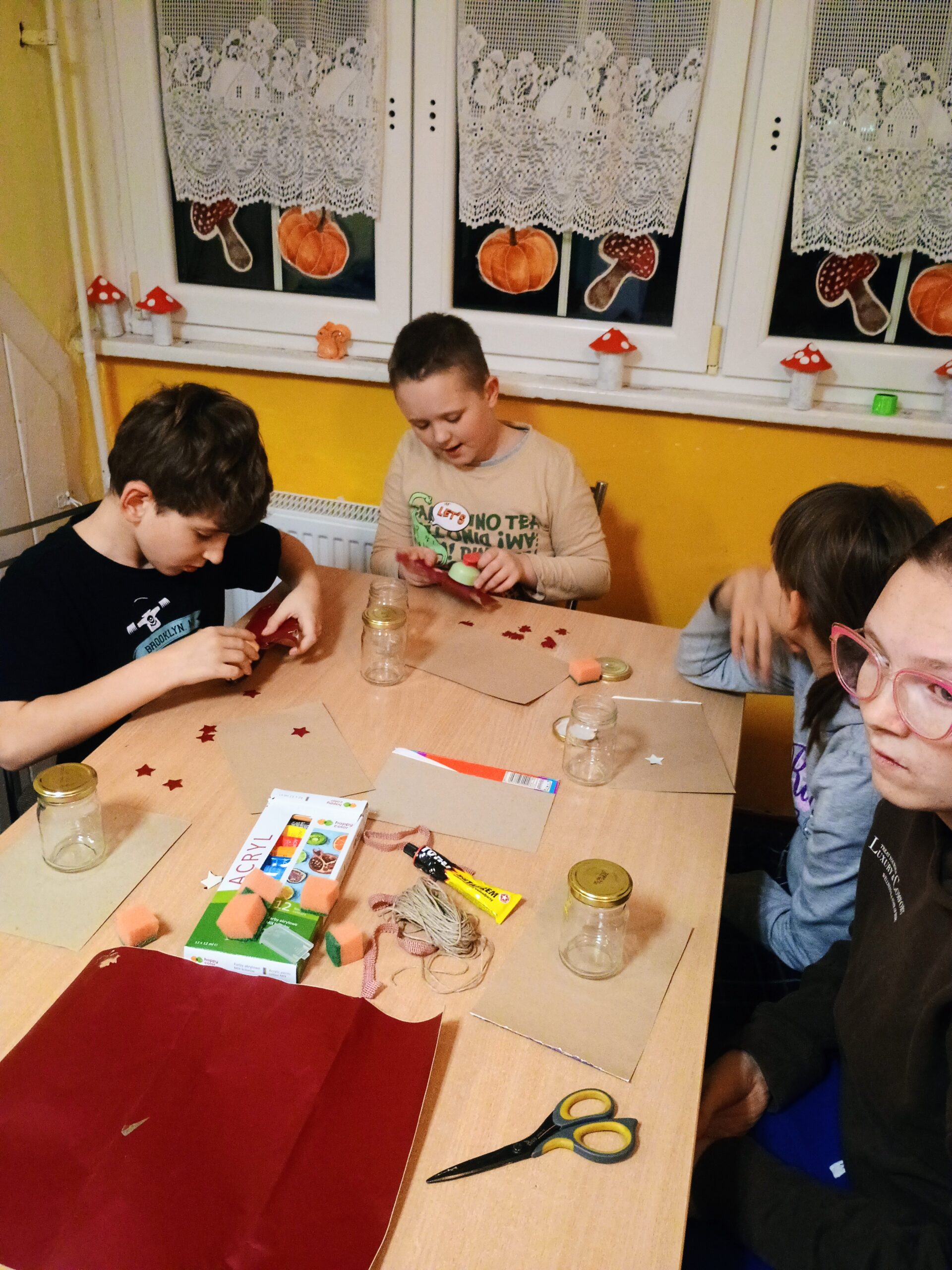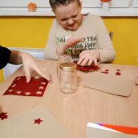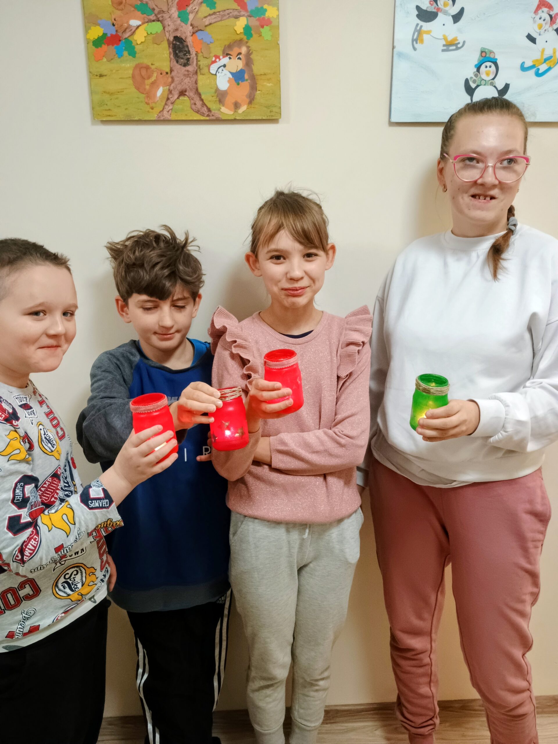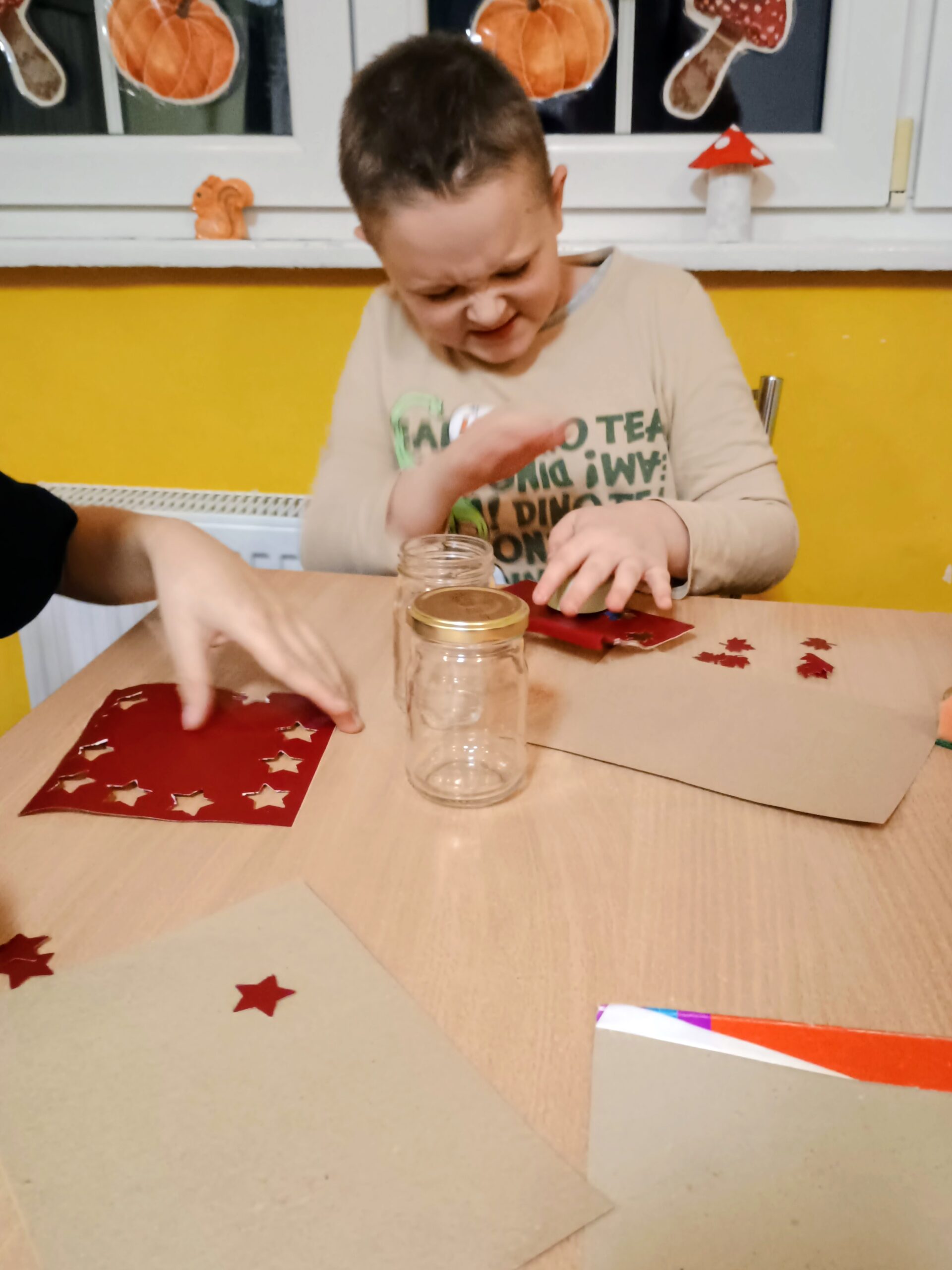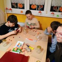 W ramach ostatnich dni jesiennej pogody za oknem tworzyliśmy lampiony na ciemne wieczory. Dzieci z chęcią przyklejały wzory, malowały słoiki, a następnie wykonywały prace wykończeniowe.