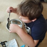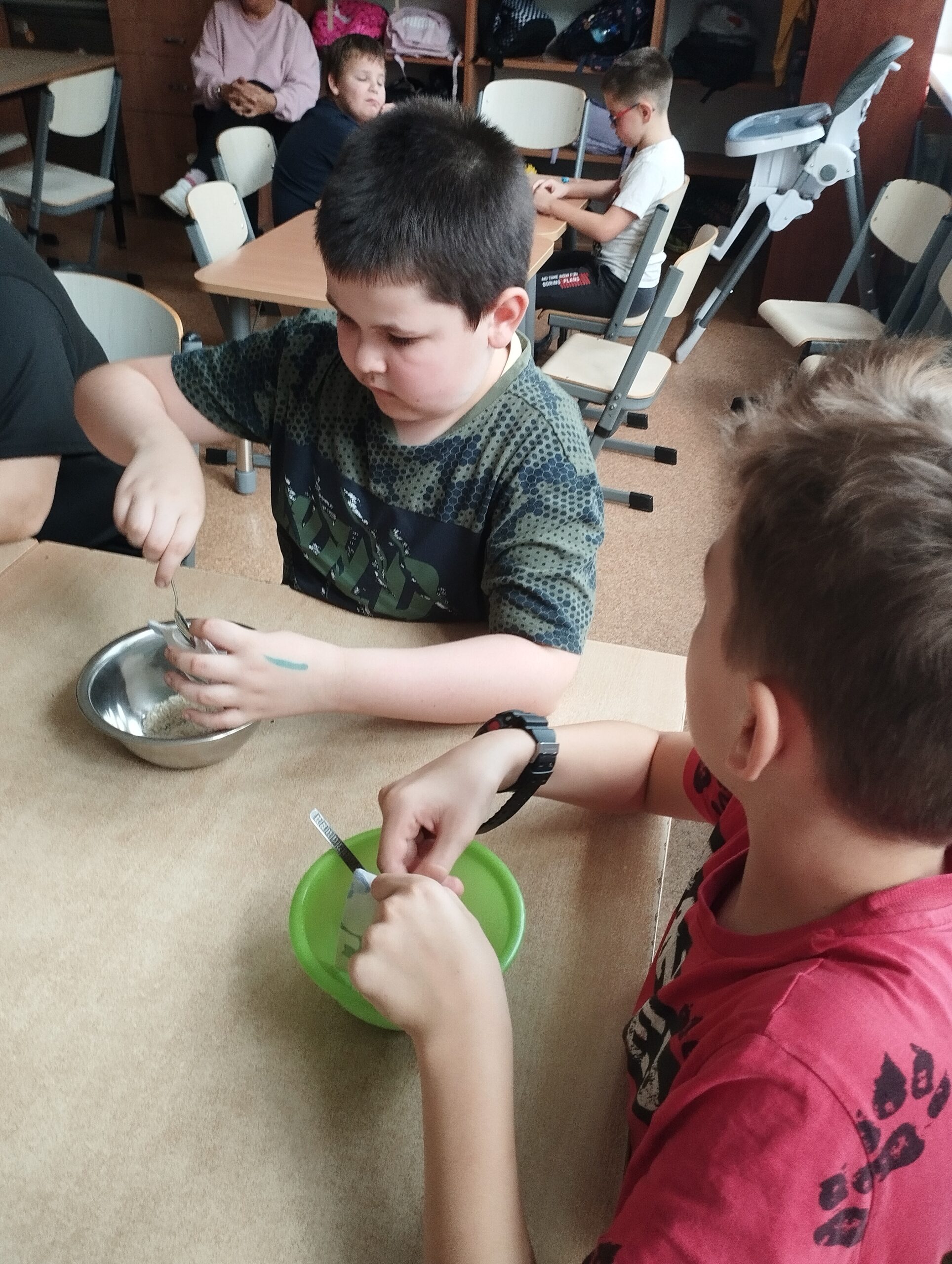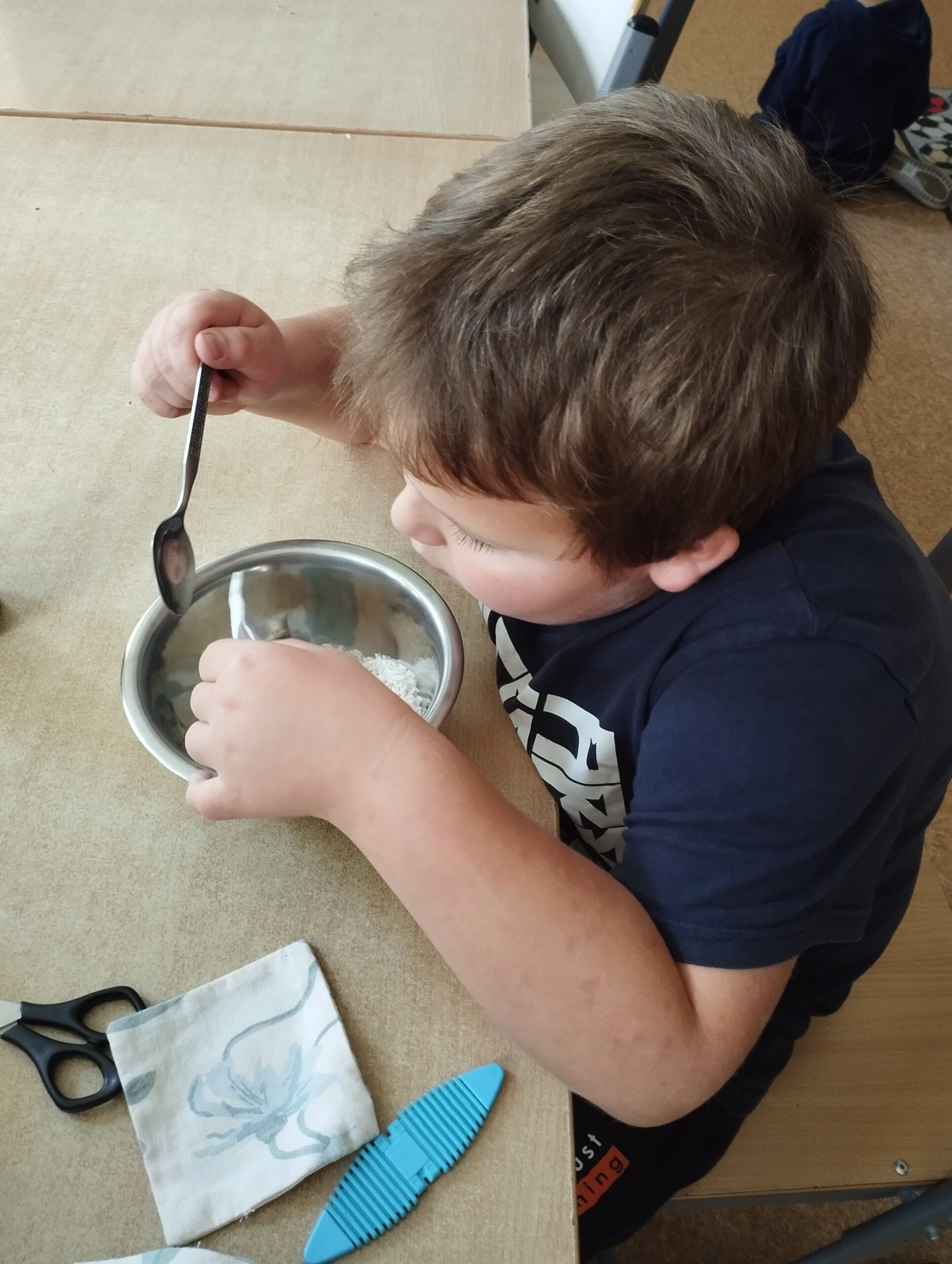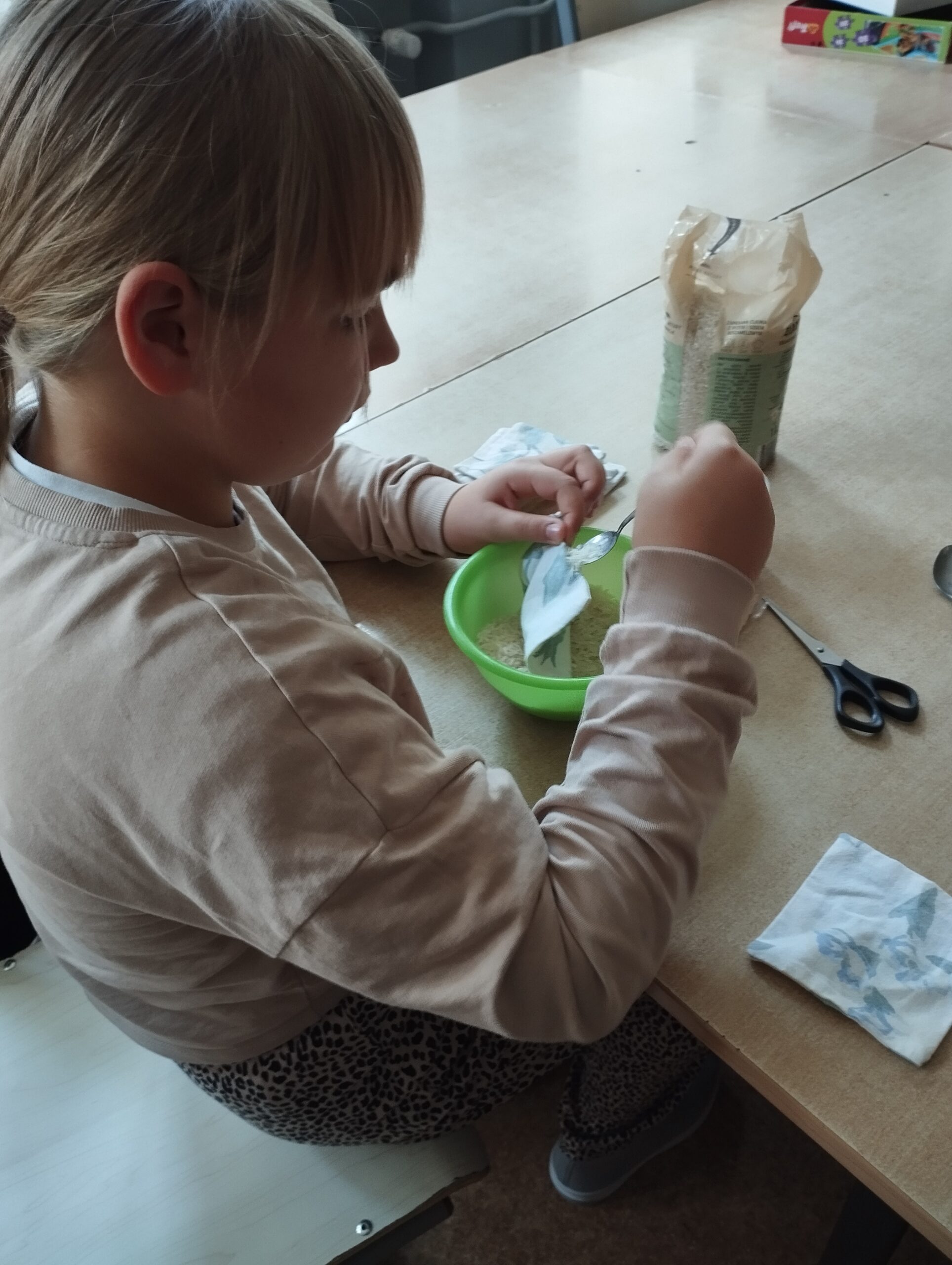 Zanim jednak rozpoczęła się właściwa rywalizacja, dzieci wzięły sprawy w swoje ręce. Wykazały się inicjatywą i zaangażowaniem, samodzielnie wypychając woreczki ryżem, przygotowując w ten sposób niezbędne rekwizyty do ćwiczeń.