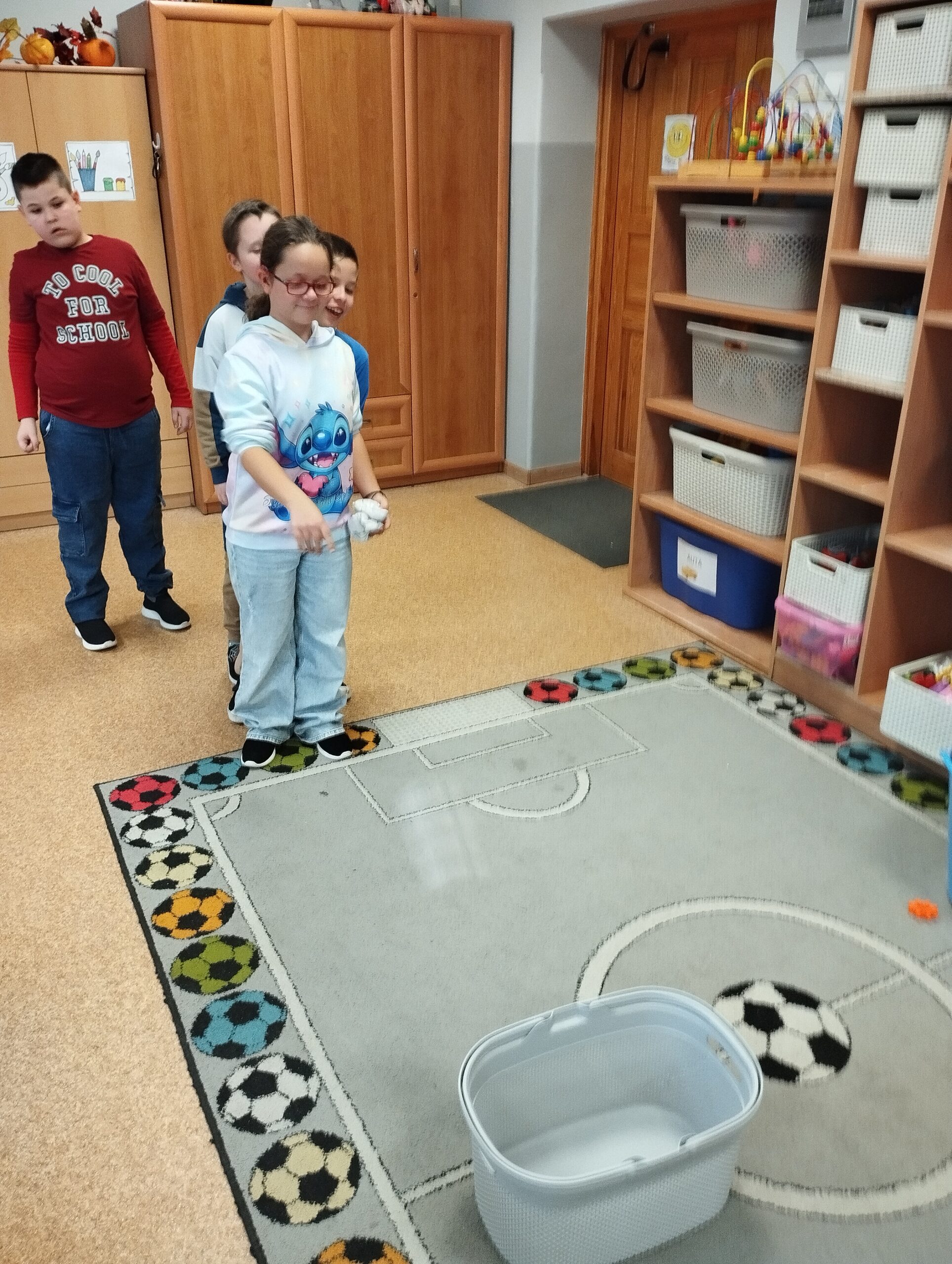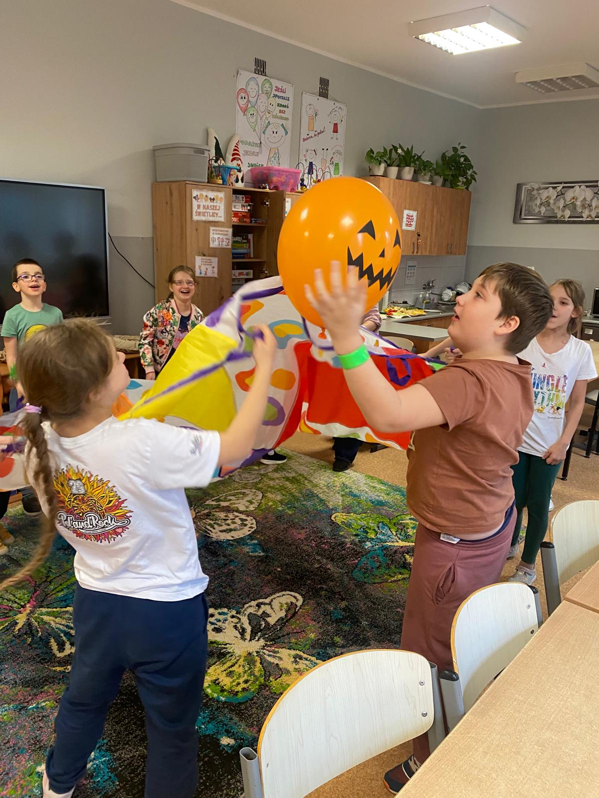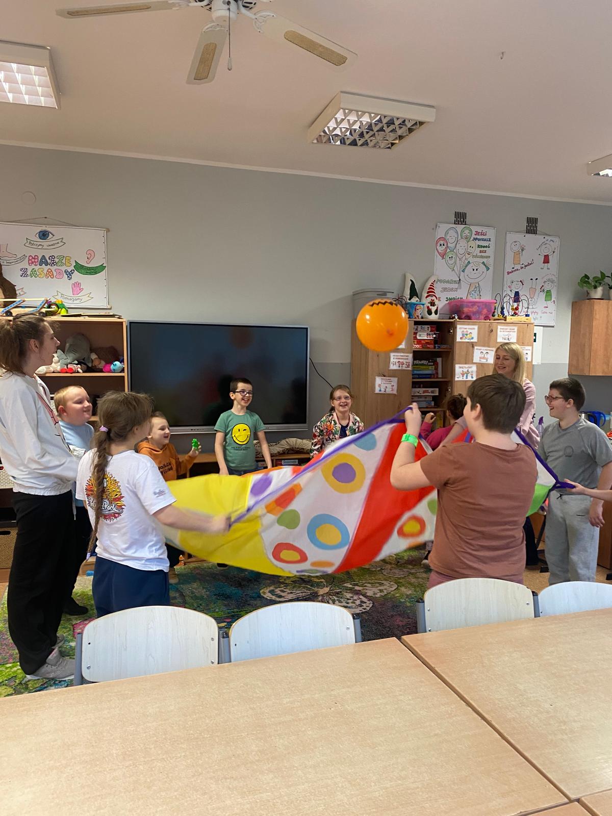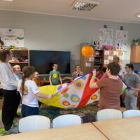 Gdy sprzęt był gotowy, ruszyliśmy do działania. Uczniowie ćwiczyli celność, rzucając przygotowanymi woreczkami. Nie zabrakło również popularnej gry w kręgle. Dużo radości dostarczyła dzieciom także zabawa z kolorową chustą animacyjną. Wspólna zabawa zintegrowała grupę i pokazała, że sport to doskonała okazja do współpracy.
