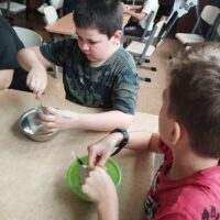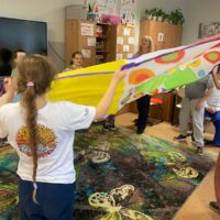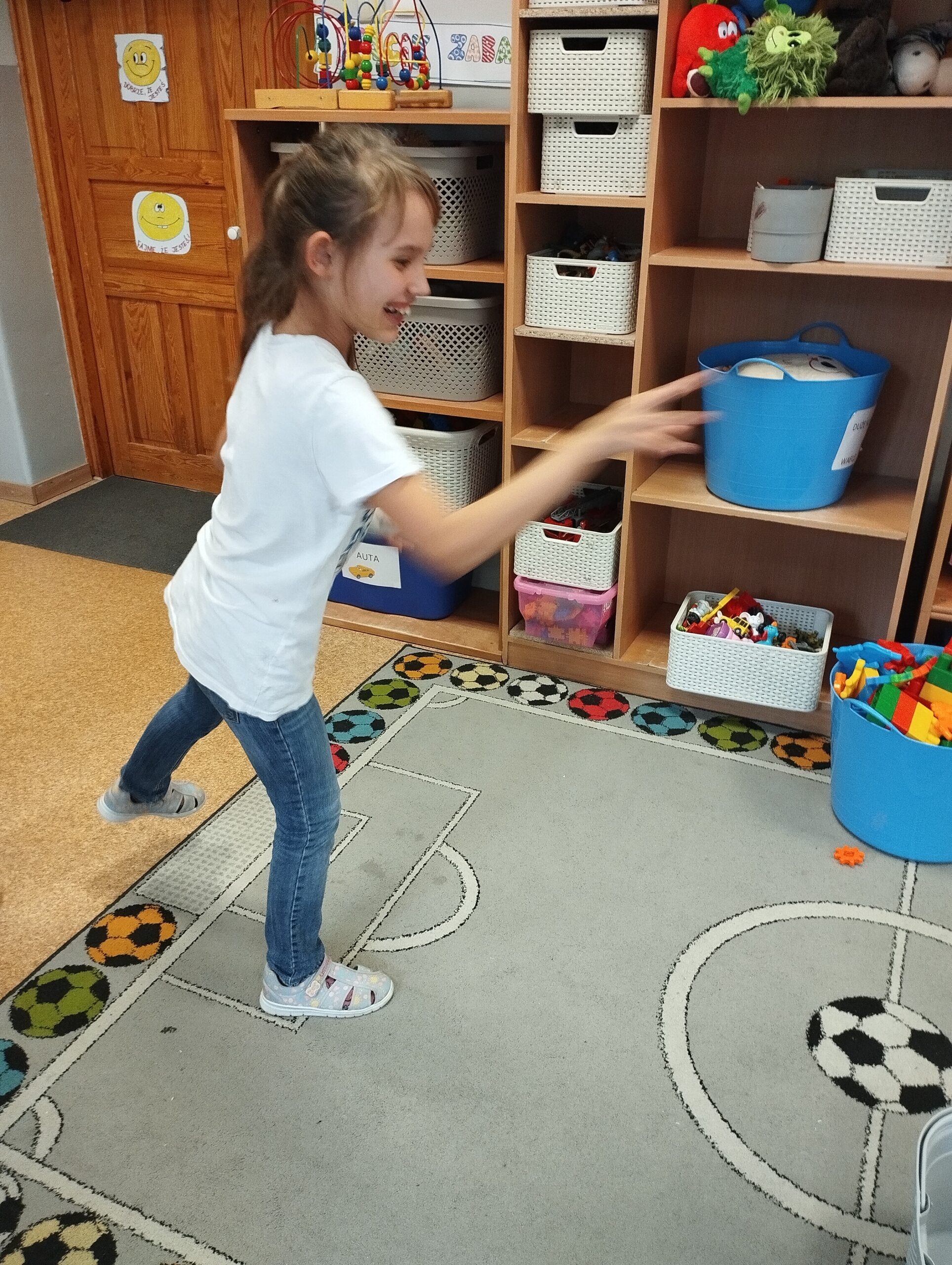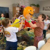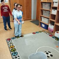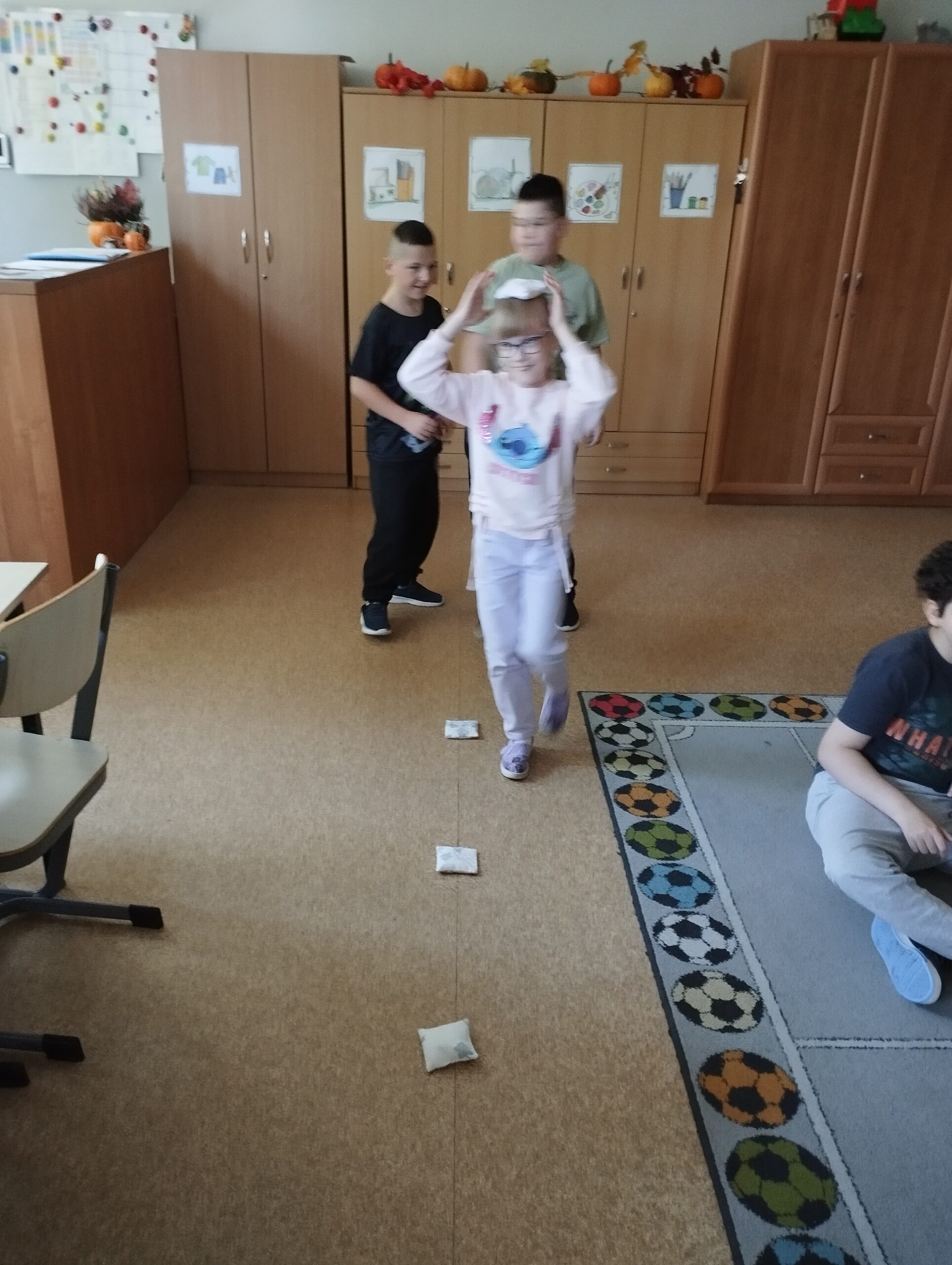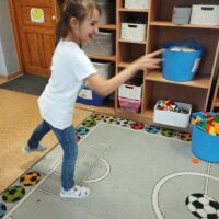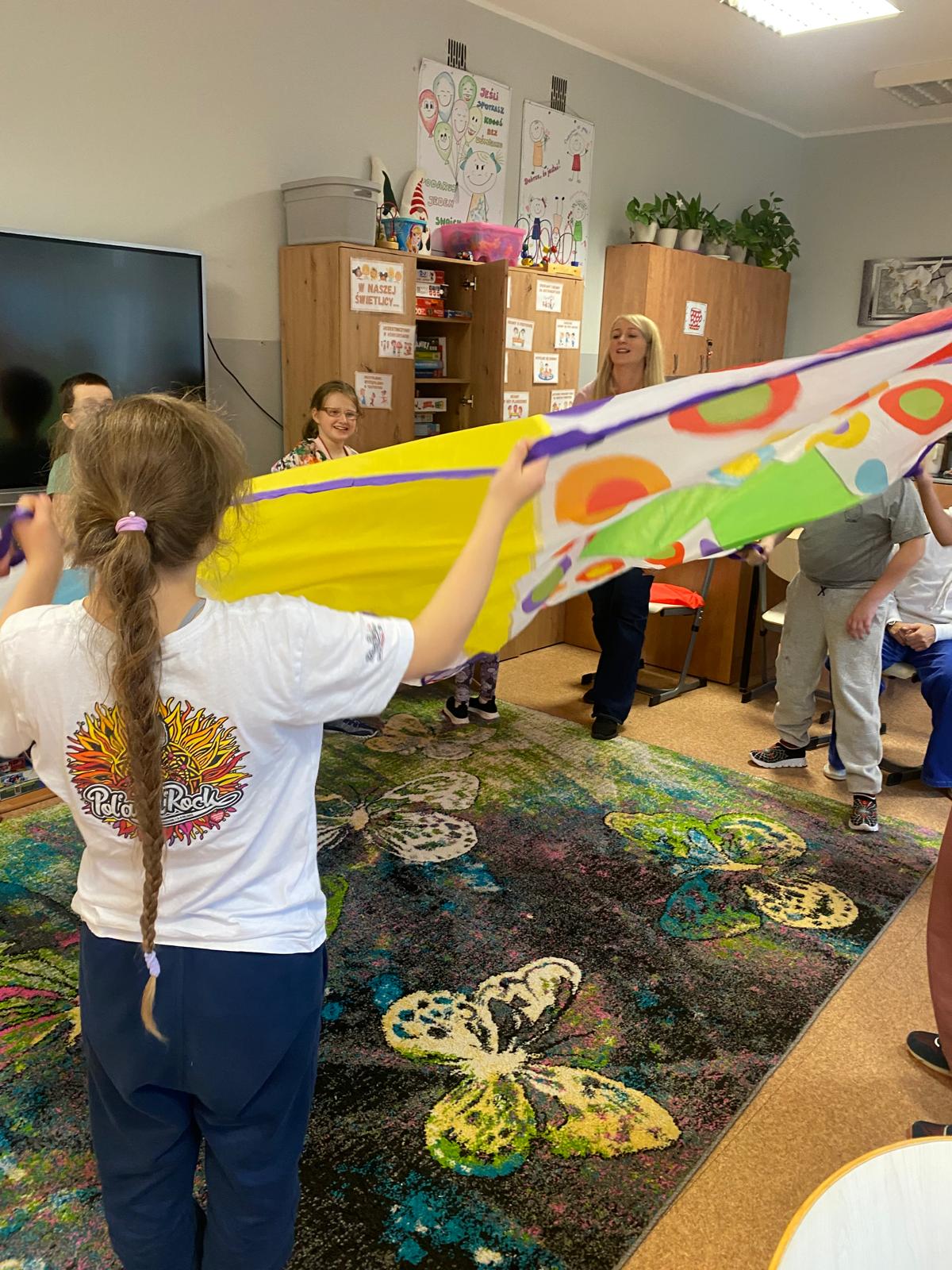 Gdy sprzęt był gotowy, ruszyliśmy do działania. Uczniowie ćwiczyli celność, rzucając przygotowanymi woreczkami. Nie zabrakło również popularnej gry w kręgle. Dużo radości dostarczyła dzieciom także zabawa z kolorową chustą animacyjną. Wspólna zabawa zintegrowała grupę i pokazała, że sport to doskonała okazja do współpracy.
