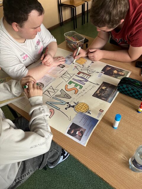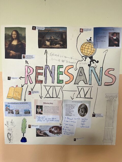 Na lekcji języka polskiego uczniowie klasy 1 szkoły branżowej poznawali fascynujący świat epoki renesansu. Zajęcia zostały przeprowadzone metodą plakatu, dzięki czemu młodzież mogła pracować w grupie, wymieniać się pomysłami i wspólnie decydować o tym, jakie informacje są najważniejsze dla zrozumienia tej epoki.