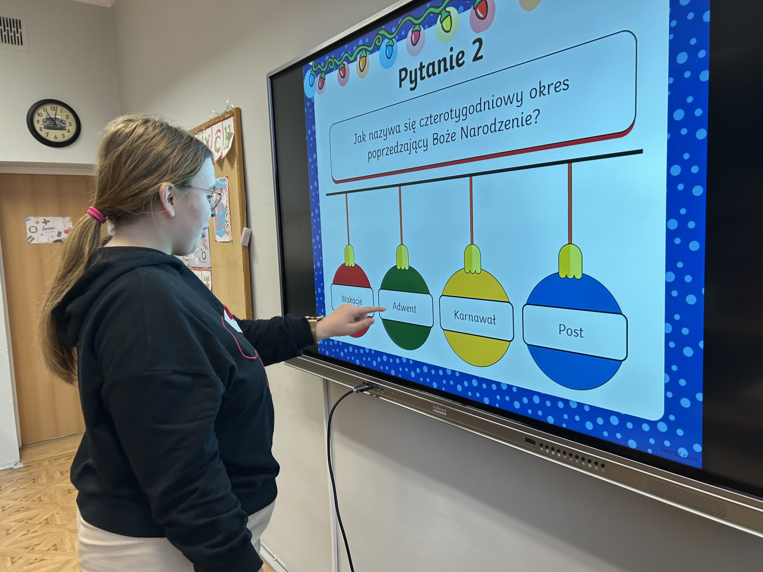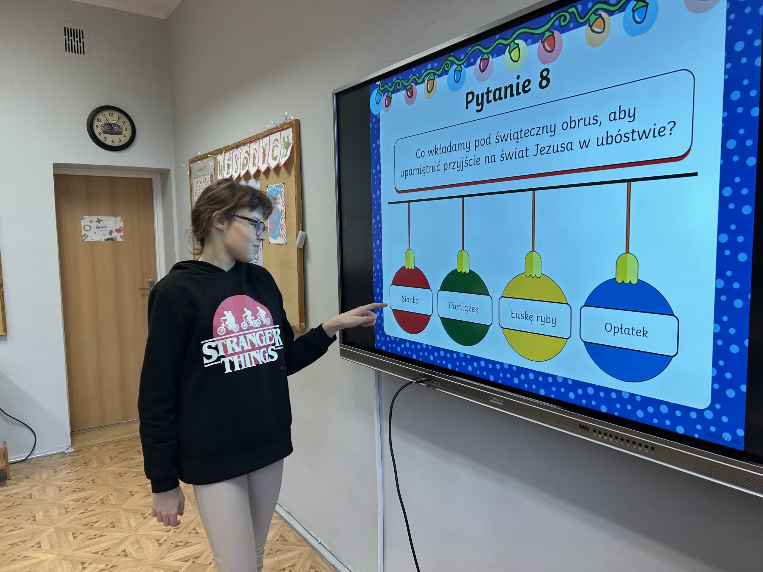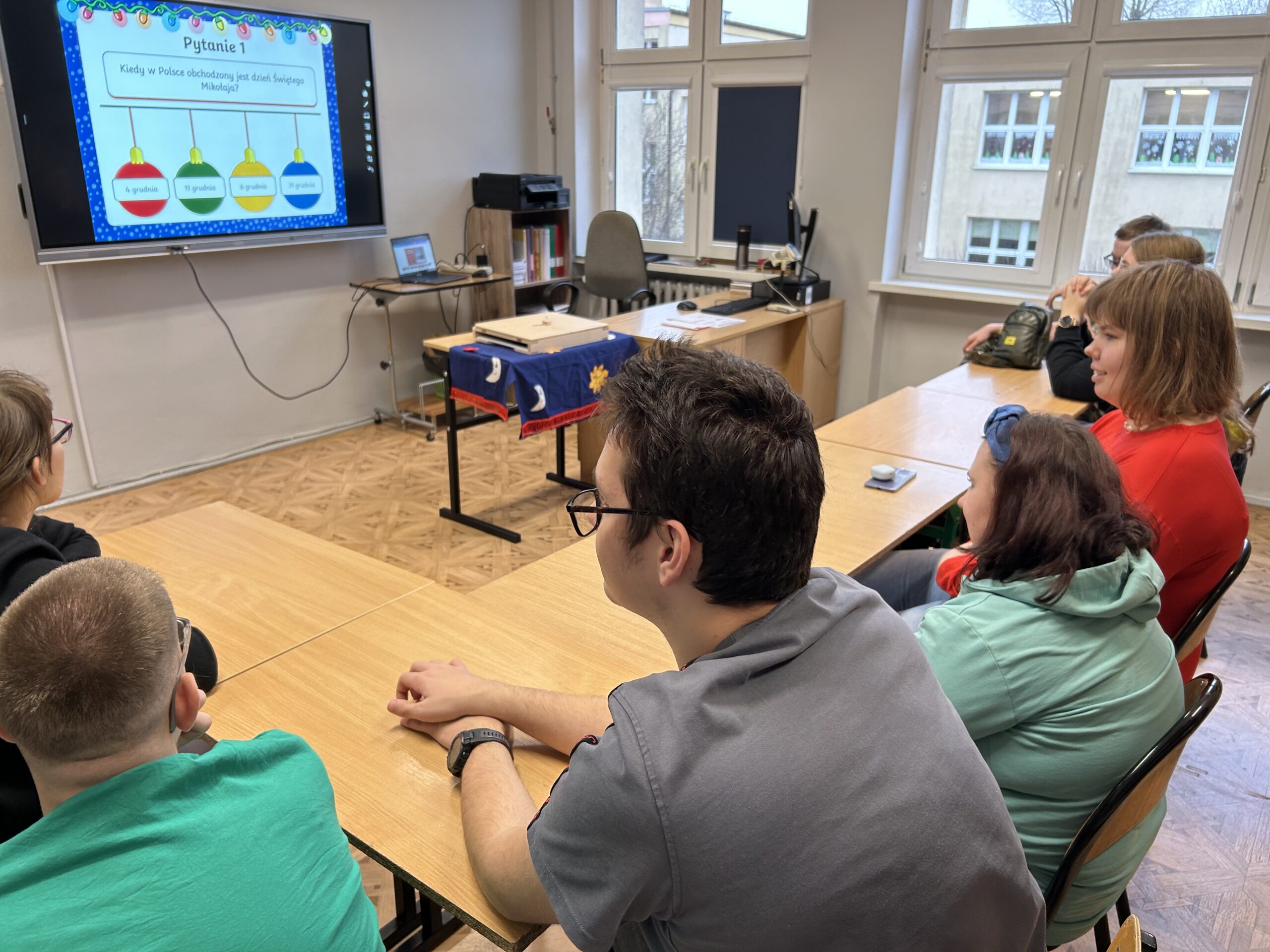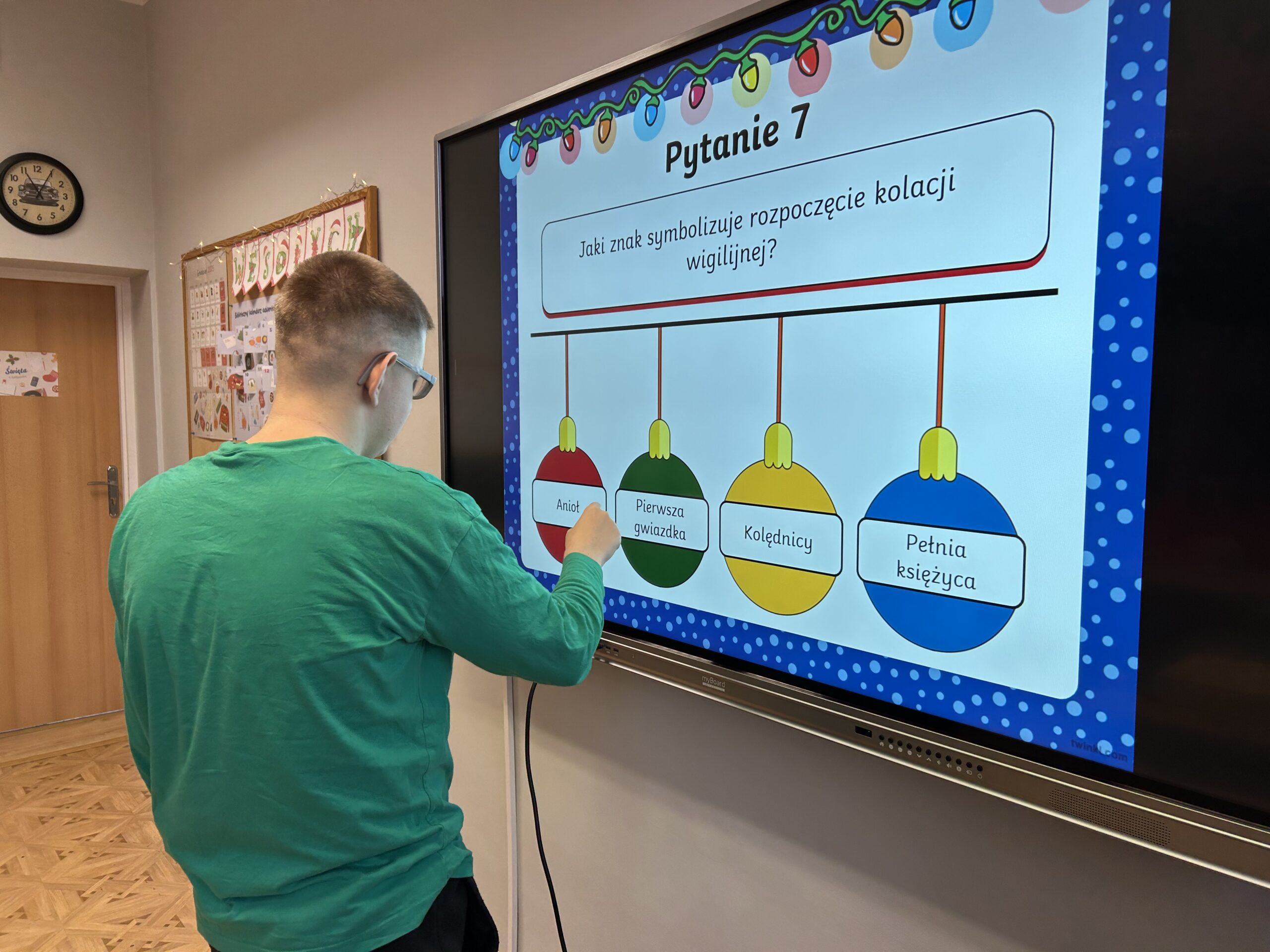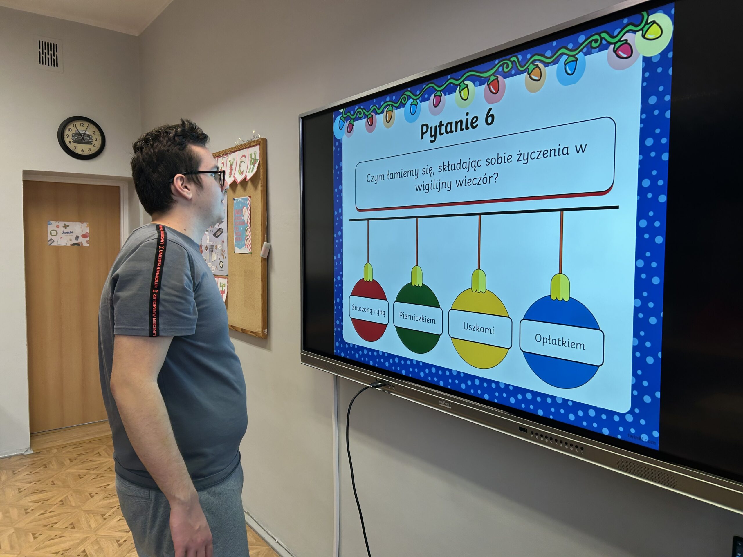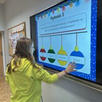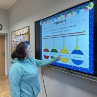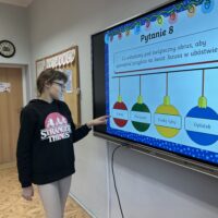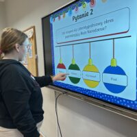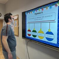 W dalszej części zajęć uczniowie obejrzeli prezentację poświęconą najważniejszym tradycjom bożonarodzeniowym. Rozmawiali o zwyczajach obecnych w ich domach, dzielili się wspomnieniami i osobistymi doświadczeniami związanymi ze świętami. Następnie wzięli udział w quizie, sprawdzając swoją wiedzę na temat bożonarodzeniowych obyczajów.
