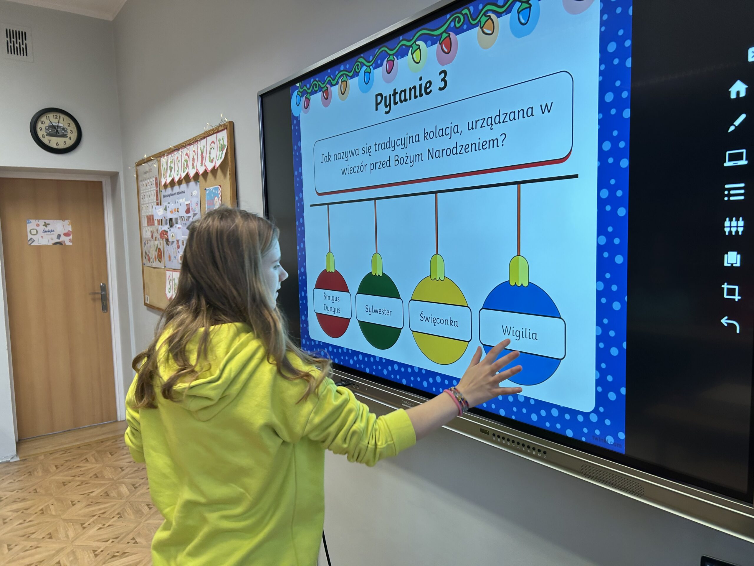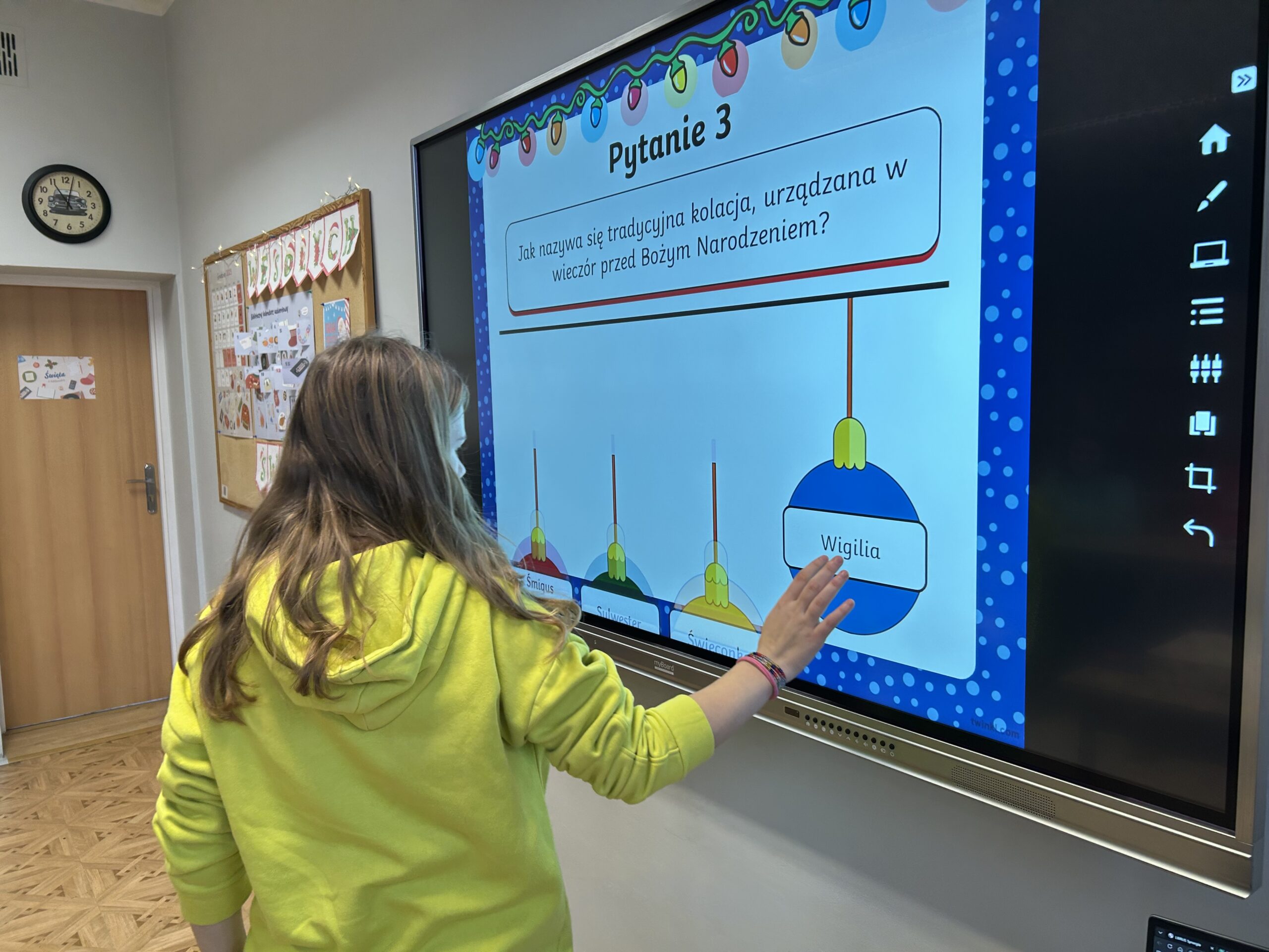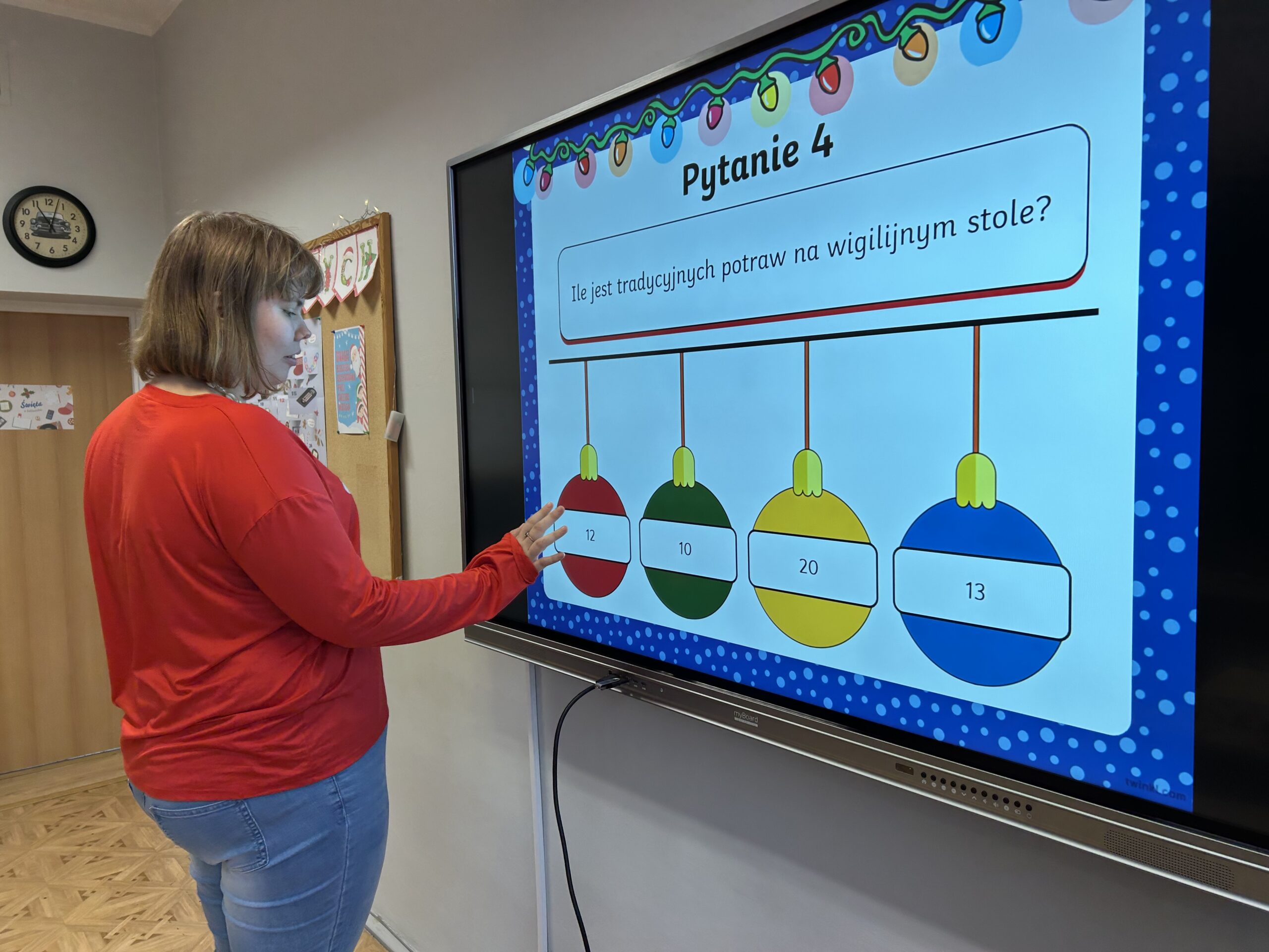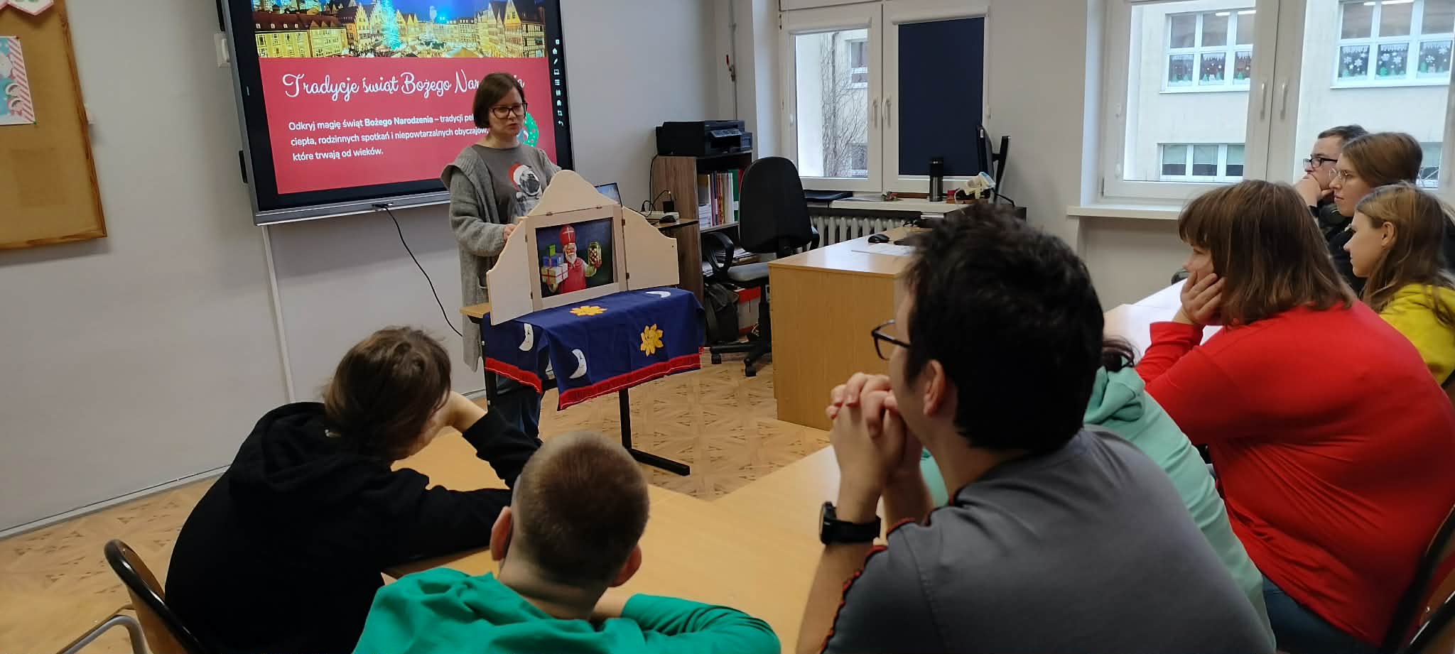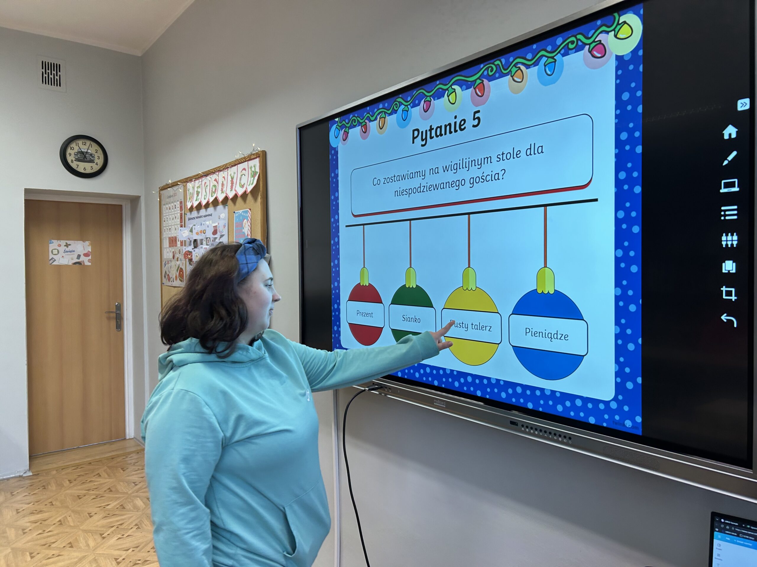 W dalszej części zajęć uczniowie obejrzeli prezentację poświęconą najważniejszym tradycjom bożonarodzeniowym. Rozmawiali o zwyczajach obecnych w ich domach, dzielili się wspomnieniami i osobistymi doświadczeniami związanymi ze świętami. Następnie wzięli udział w quizie, sprawdzając swoją wiedzę na temat bożonarodzeniowych obyczajów.