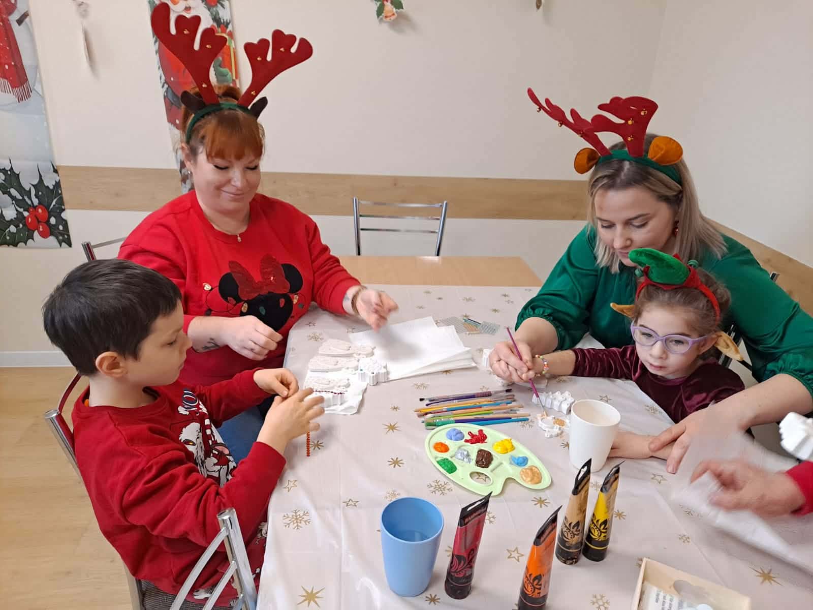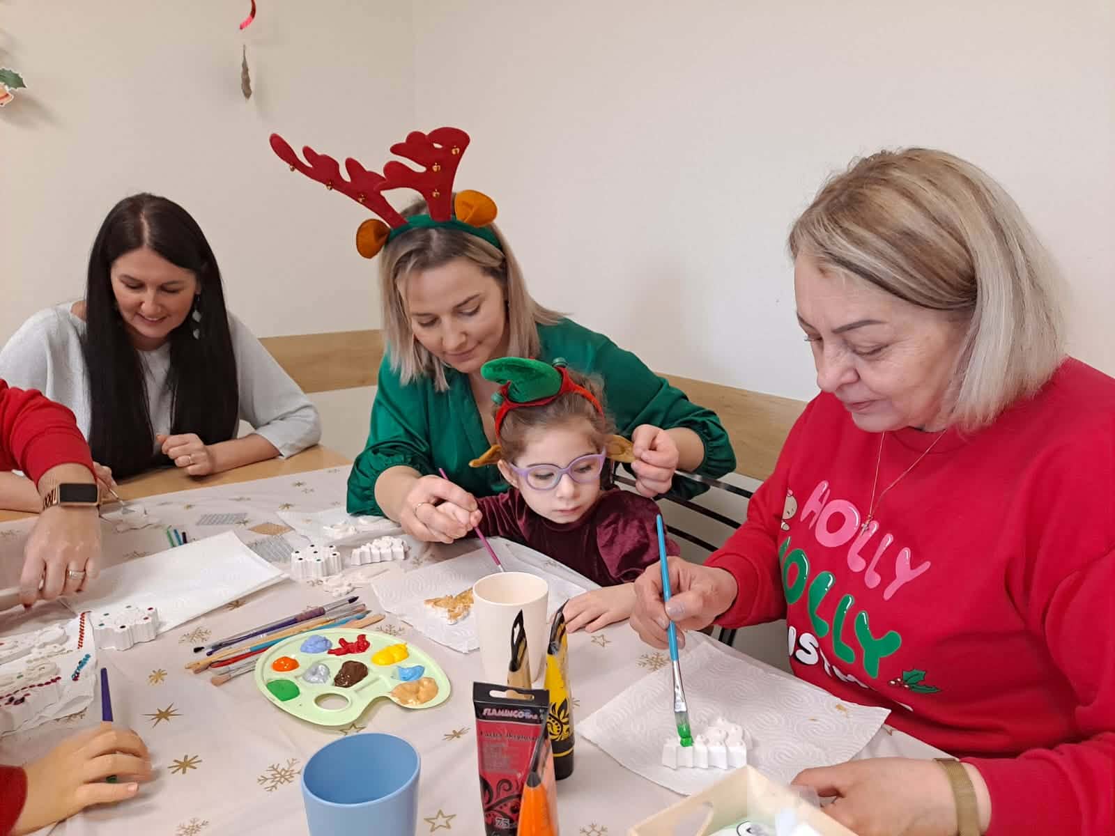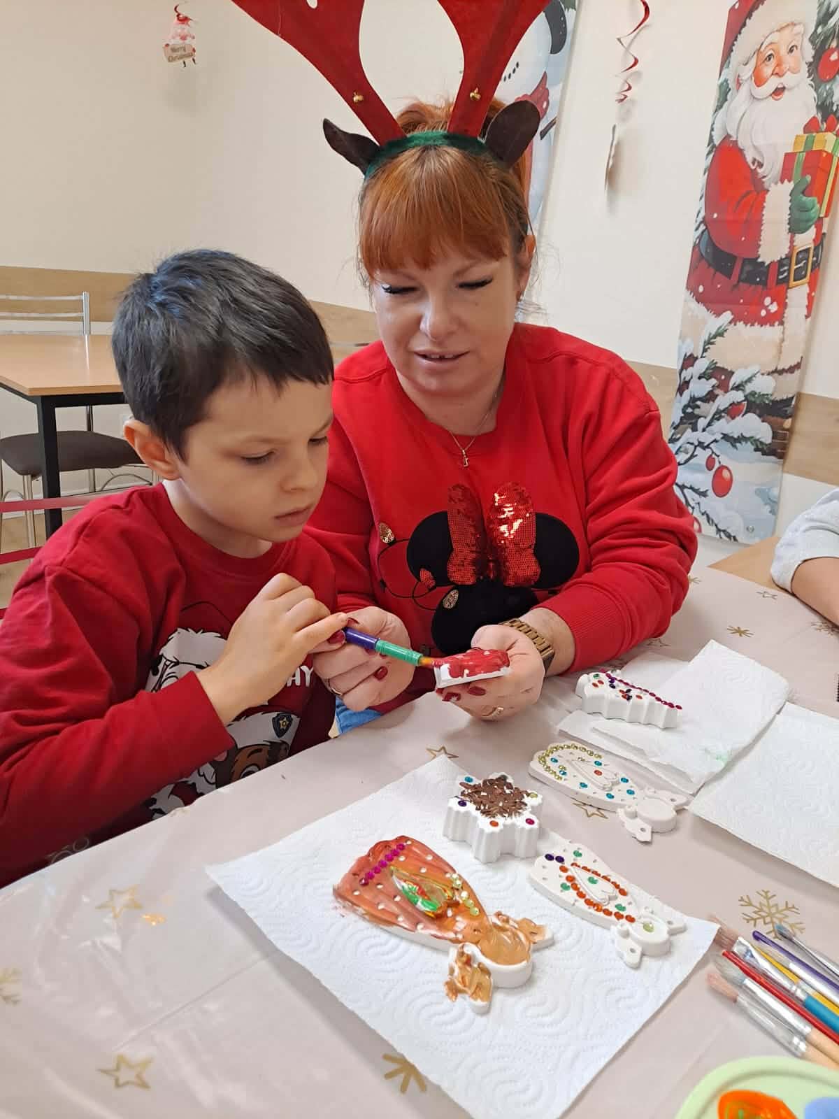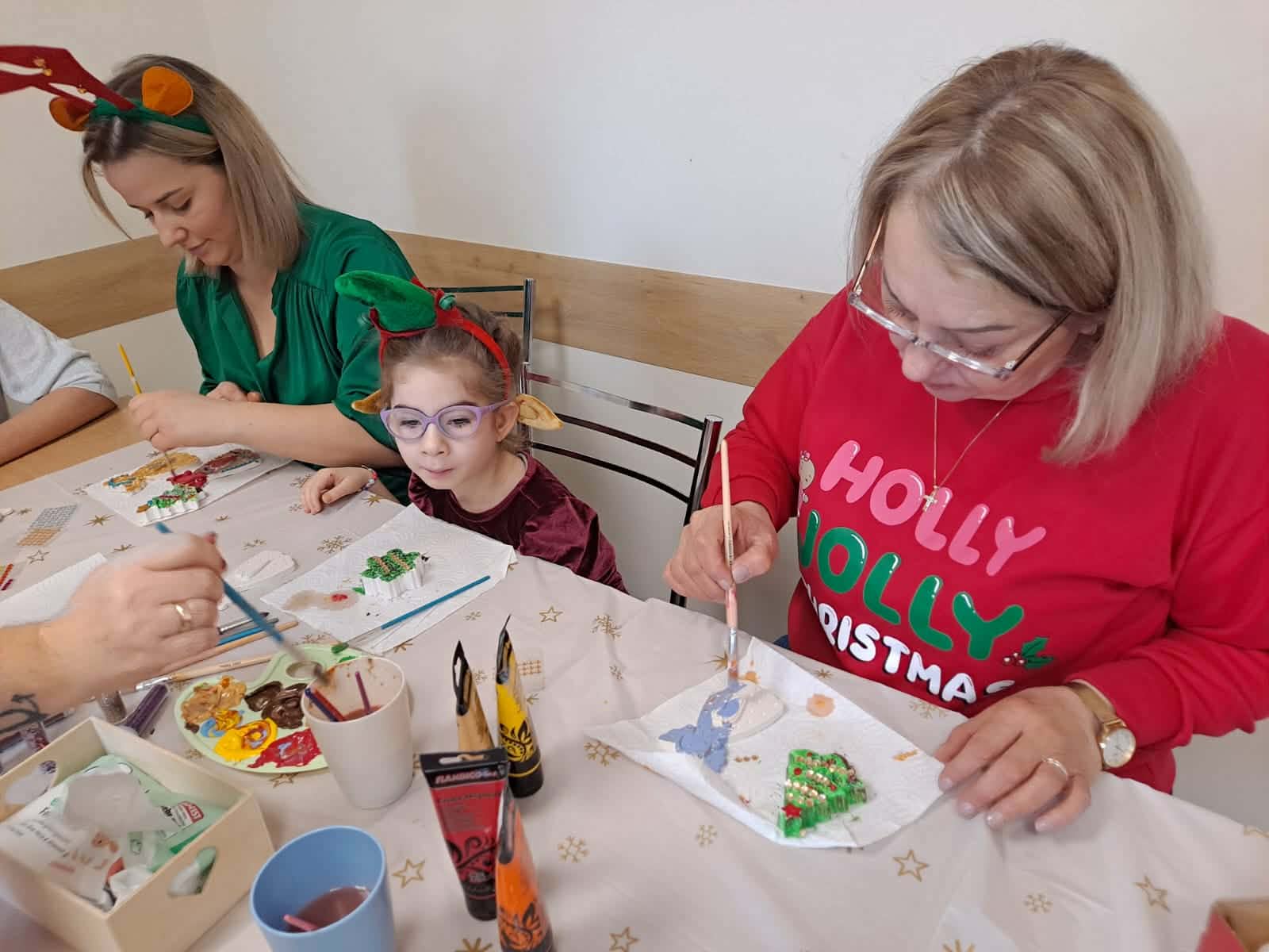 Podczas warsztatów dzieci wraz z mamami wykonywały dekoracje świąteczne –Wspólna praca dostarczyła wielu uśmiechów, rozwijała kreatywność dzieci oraz wzmacniała więzi rodzinne. Następnie wspólnie zasiedliśmy do słodkiego poczęstunku, składając sobie świąteczne życzenia pełne ciepła, zdrowia i radości.