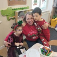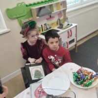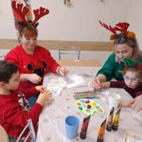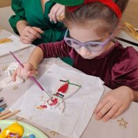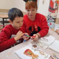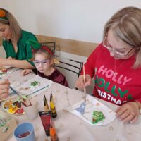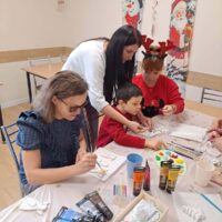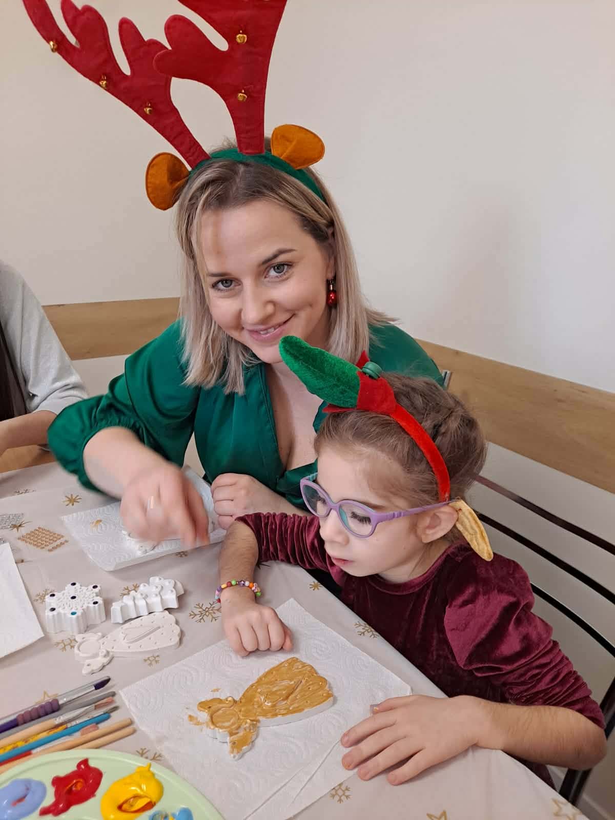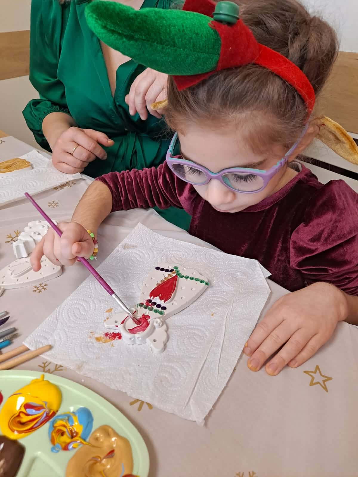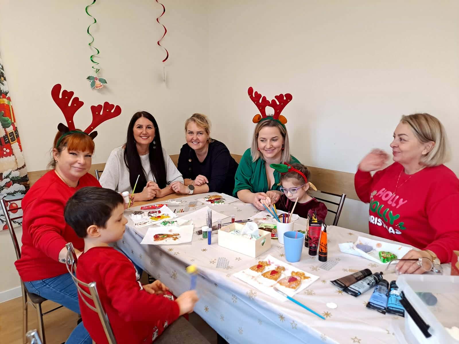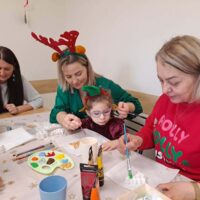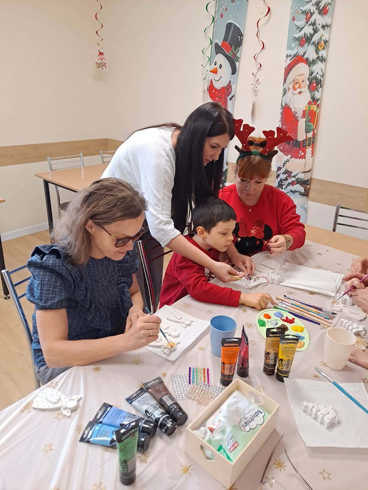 Podczas warsztatów dzieci wraz z mamami wykonywały dekoracje świąteczne –Wspólna praca dostarczyła wielu uśmiechów, rozwijała kreatywność dzieci oraz wzmacniała więzi rodzinne. Następnie wspólnie zasiedliśmy do słodkiego poczęstunku, składając sobie świąteczne życzenia pełne ciepła, zdrowia i radości.