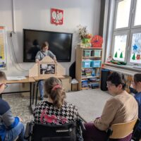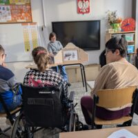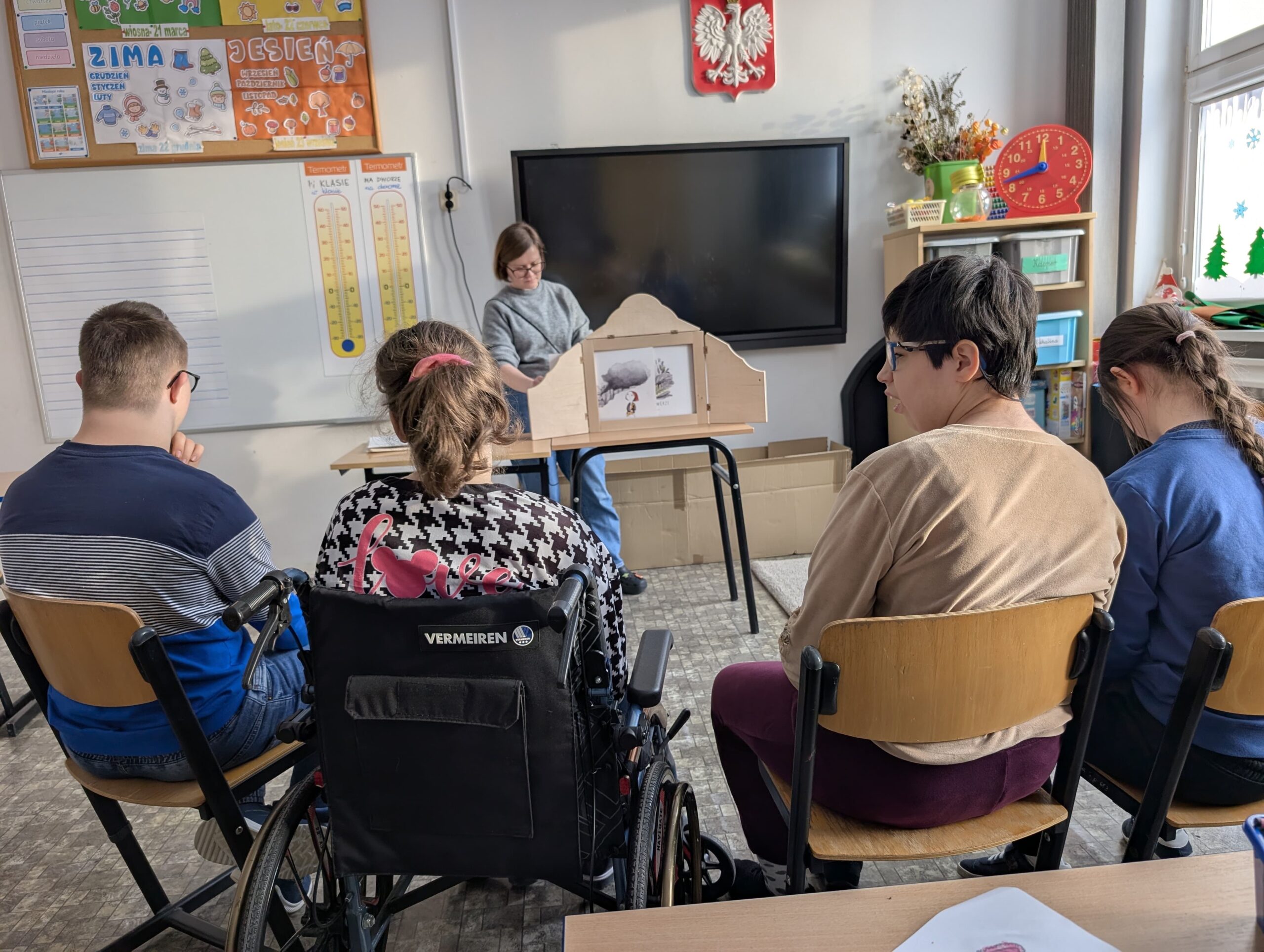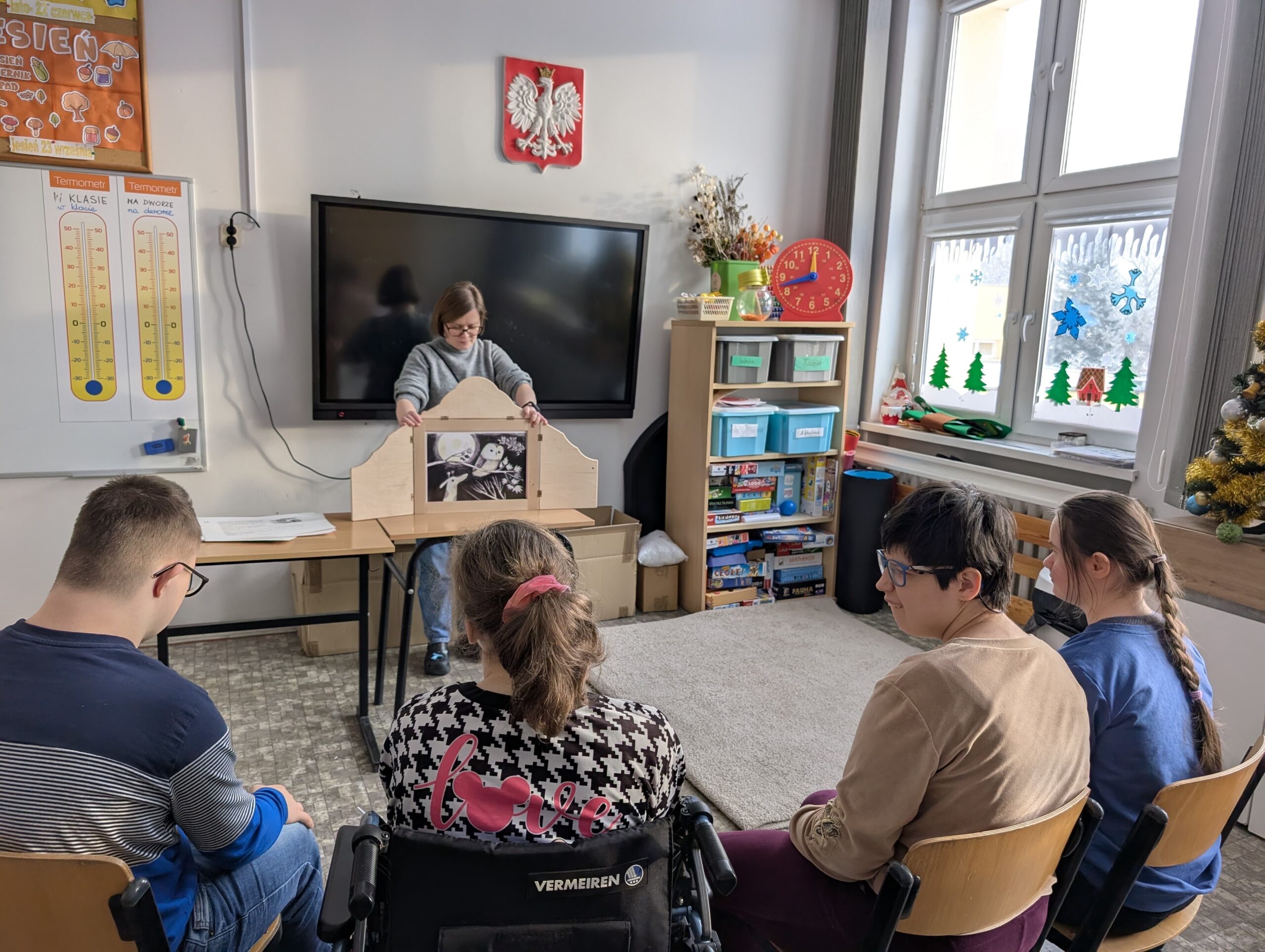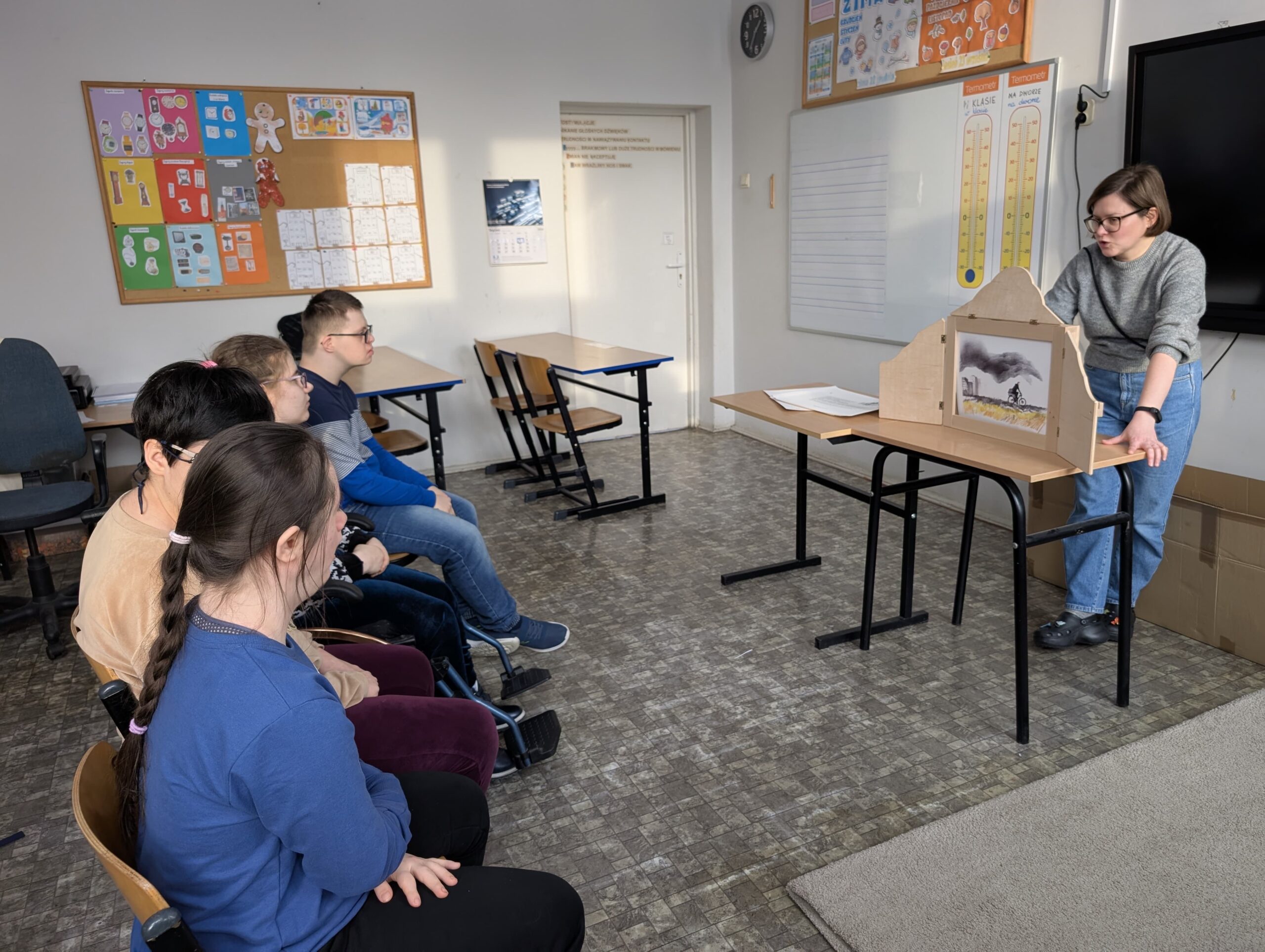 Lekcja rozpoczęła się od wysłuchania teatrzyku kamishibai pt. „Żyrafa na rowerze”. Kamishibai to tradycyjna japońska forma opowiadania historii z wykorzystaniem ilustrowanych kart, wywodząca się z Japonii. Metoda ta sprzyja uważnemu słuchaniu, koncentracji oraz rozwijaniu wyobraźni, a jednocześnie wprowadza uczniów w świat kultury japońskiej w spokojny i przystępny sposób.