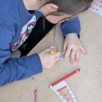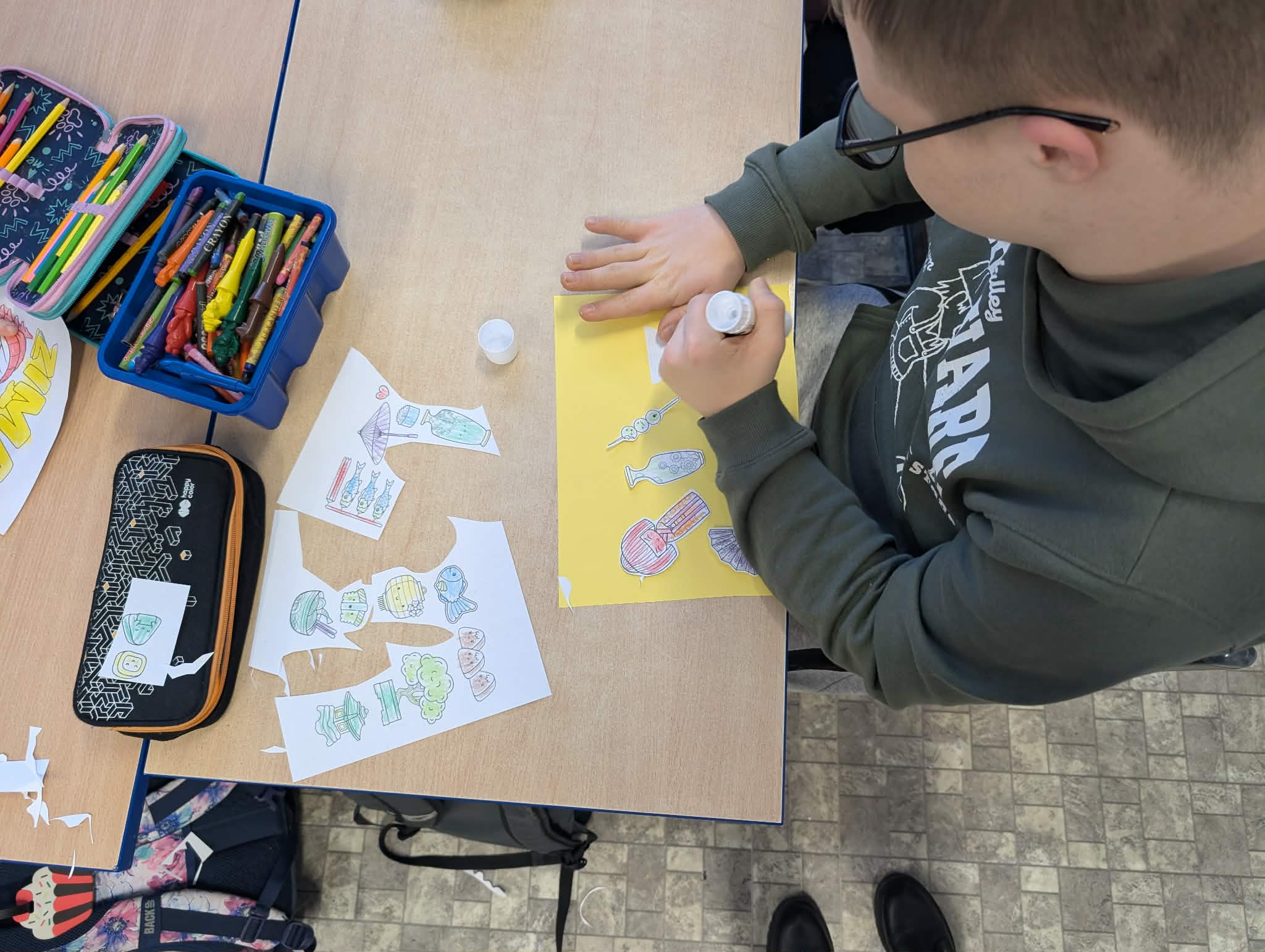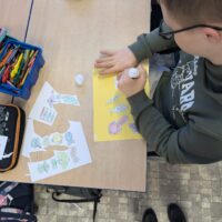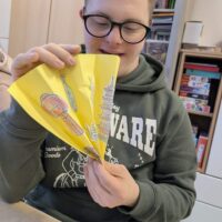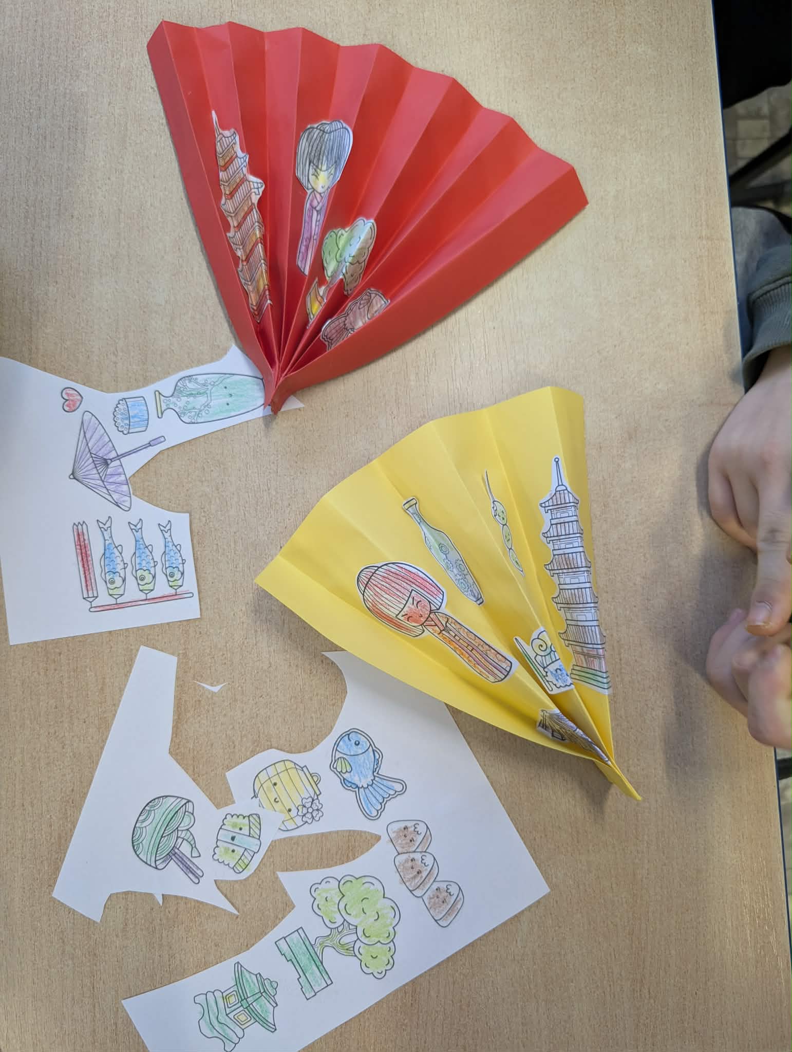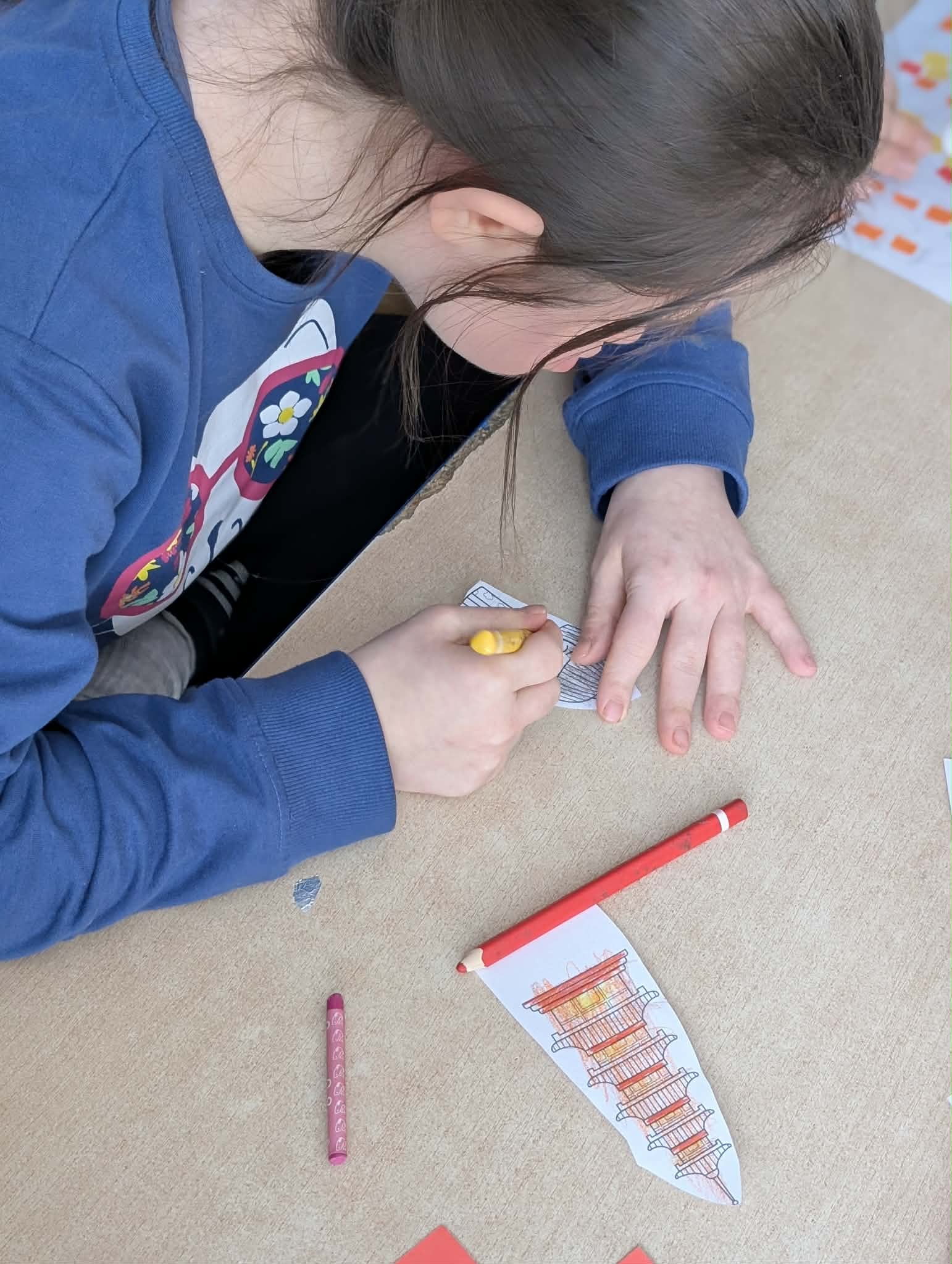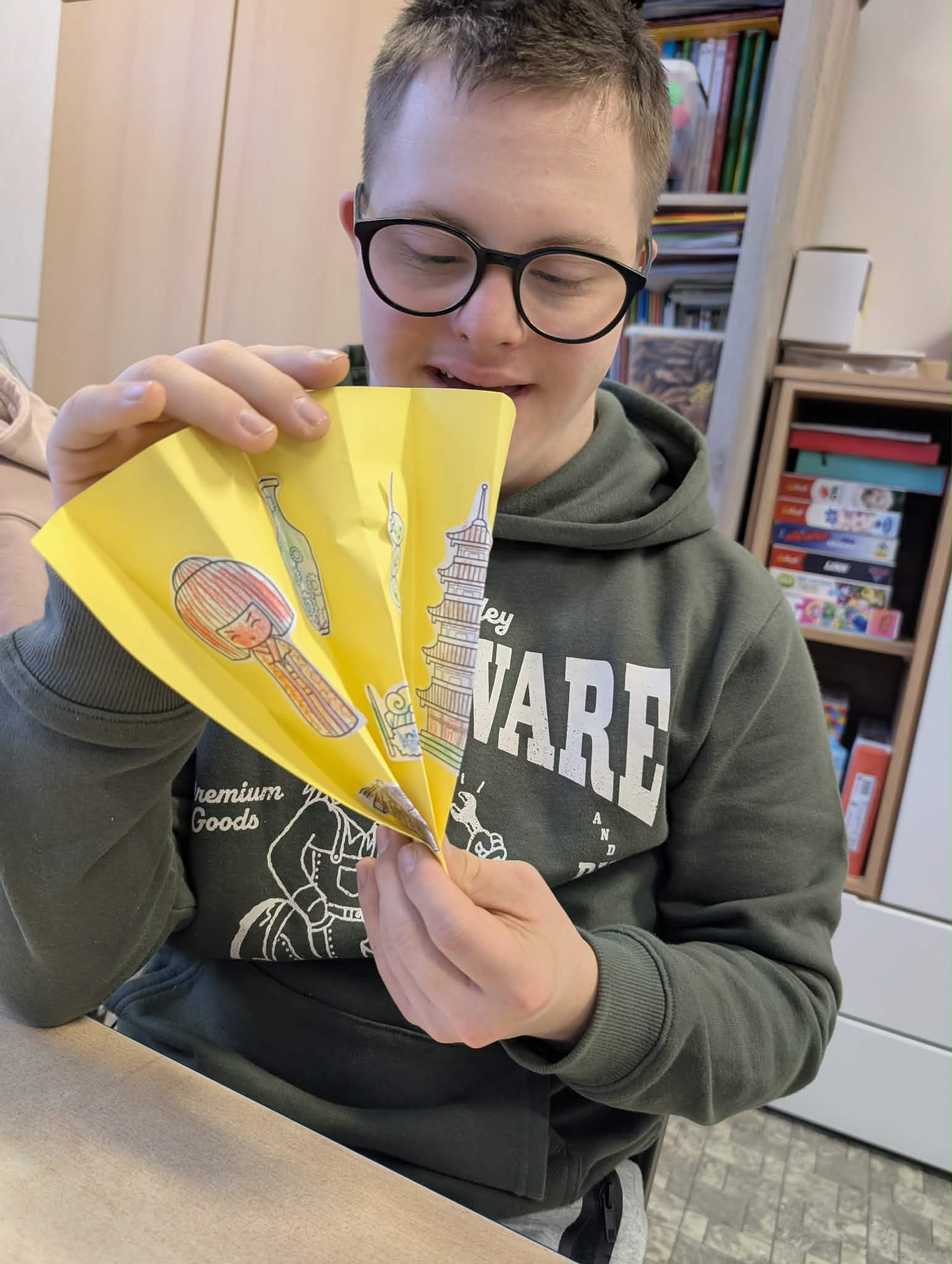 Kolejnym etapem zajęć były działania plastyczno-techniczne. Uczniowie samodzielnie wykonywali papierowe wachlarze, które następnie ozdabiali kolorowankami przedstawiającymi symbole kojarzące się z Japonią. Kolorowali, wycinali i przyklejali elementy, dbając o estetykę i kolejność wykonywanych czynności. Ważnym elementem pracy było również samodzielne składanie wachlarza z kartki papieru. Zajęcia w naturalny sposób ćwiczyły sprawność manualną, koordynację wzrokowo-ruchową, koncentrację uwagi oraz umiejętność planowania i realizowania kolejnych etapów zadania. Praca twórcza sprzyjała także rozwijaniu samodzielności, cierpliwości i poczucia sprawczości, a wspólne działania budowały pozytywną atmosferę i motywację do pracy.