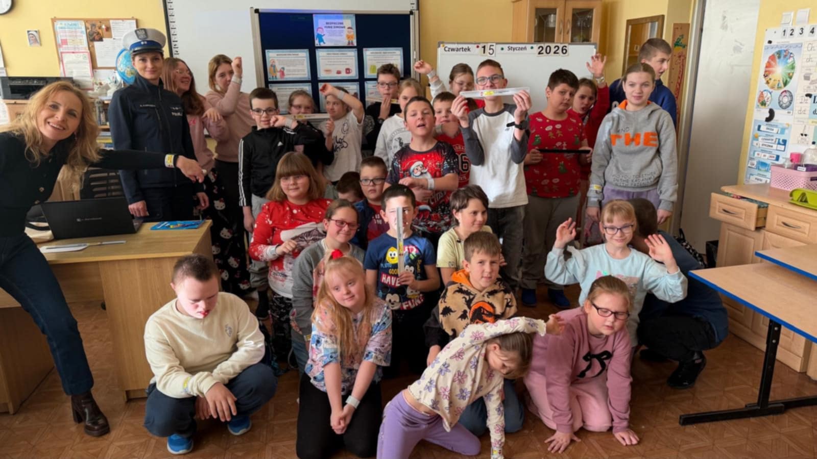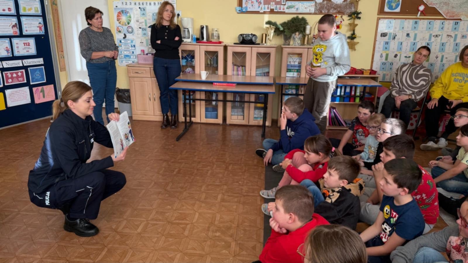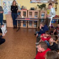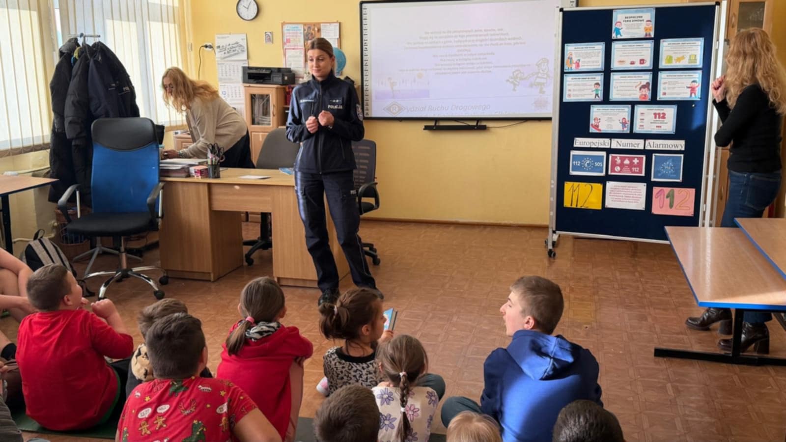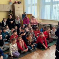 Dokładnie omówiła do kogo należy zwrócić się po pomoc w przypadku zgubienia się w obcym miejscu. Uczniowie przypomnieli sobie również, jak należy się zachować, jeśli staną się świadkami zdarzeń, w których zagrożone jest ludzkie życie oraz pod jakie numery należy dzwonić, aby uzyskać potrzebną pomoc. Ważnym elementem spotkania była rozmowa o przestrzeganiu zasad poruszania się po drogach, szczególnie po zmroku, kiedy niezbędne stają się elementy odblaskowe.
