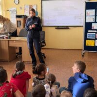 W trosce o bezpieczeństwo naszych uczniów w trakcie ferii zimowych przeprowadzono spotkanie profilaktyczno-edukacyjne z funkcjonariuszką policji z Wydziału Ruchu Drogowego. Podczas prelekcji Pani policjantka przypomniała o zagrożeniach, z którymi możemy się spotkać podczas feryjnego odpoczynku. Dokładnie omówiła zasady bezpieczeństwa podczas uprawiania sportów zimowych oraz gier i zabaw na świeżym powietrzu. Podkreśliła, jakie są przykre skutki wchodzenia na kruchy lód, zjeżdżania na sankach w pobliżu jezdni oraz zbliżania się do obcych osób.