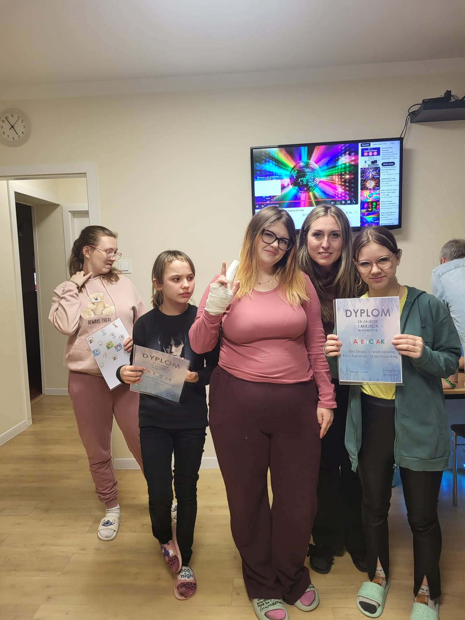 Zabawa taneczna obejmowała tańce grupowe, indywidualne oraz w parach, a wspólne chwile na parkiecie dostarczyły wszystkim mnóstwo uśmiechu i pozytywnych emocji. W przerwie zabawy rozstrzygnięto Konkurs” Talenciaków” i wręczono nagrody. Dyskoteka była doskonałą okazją do integracji wychowanków i wspólnego, radosnego spędzenia czasu.