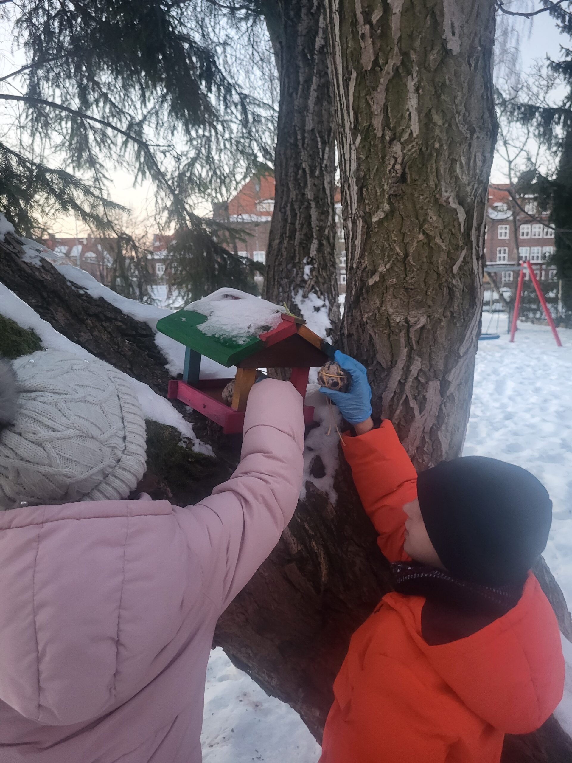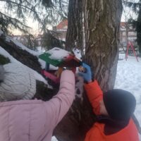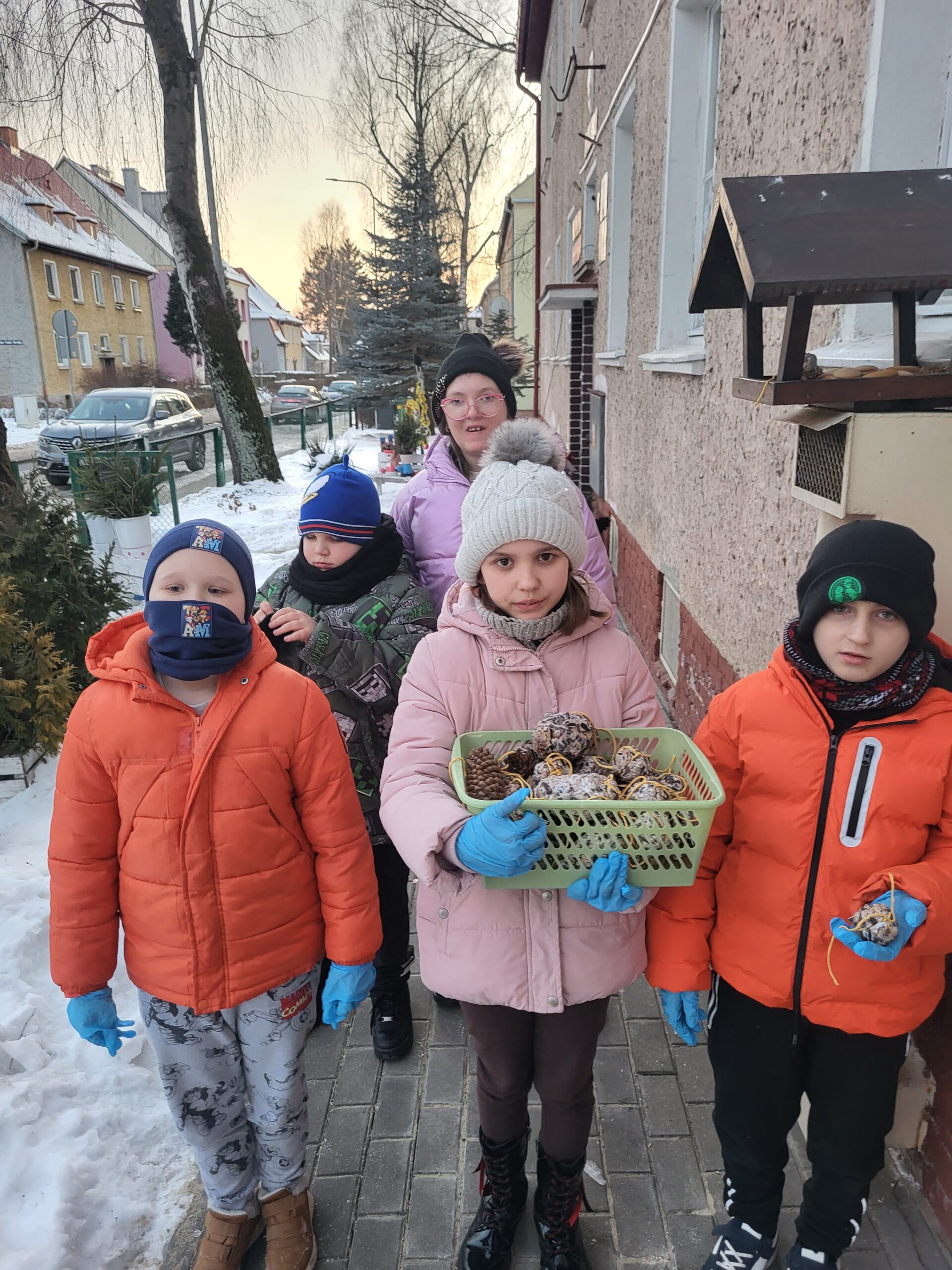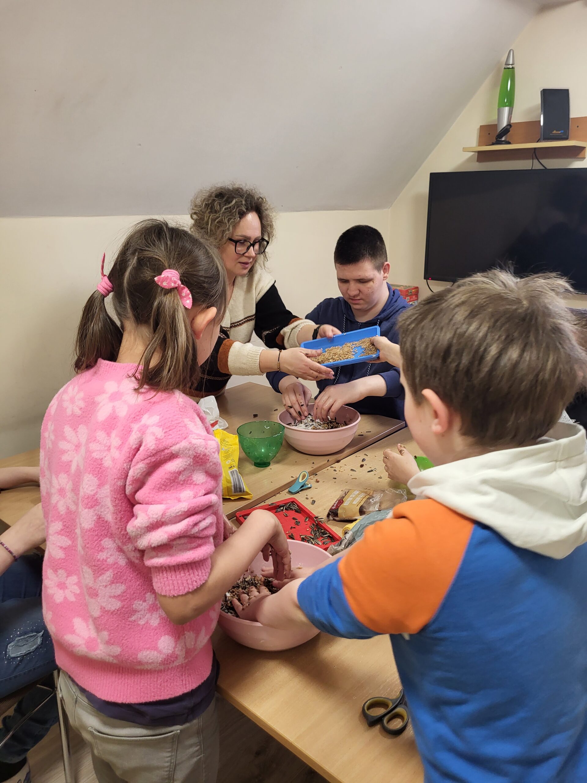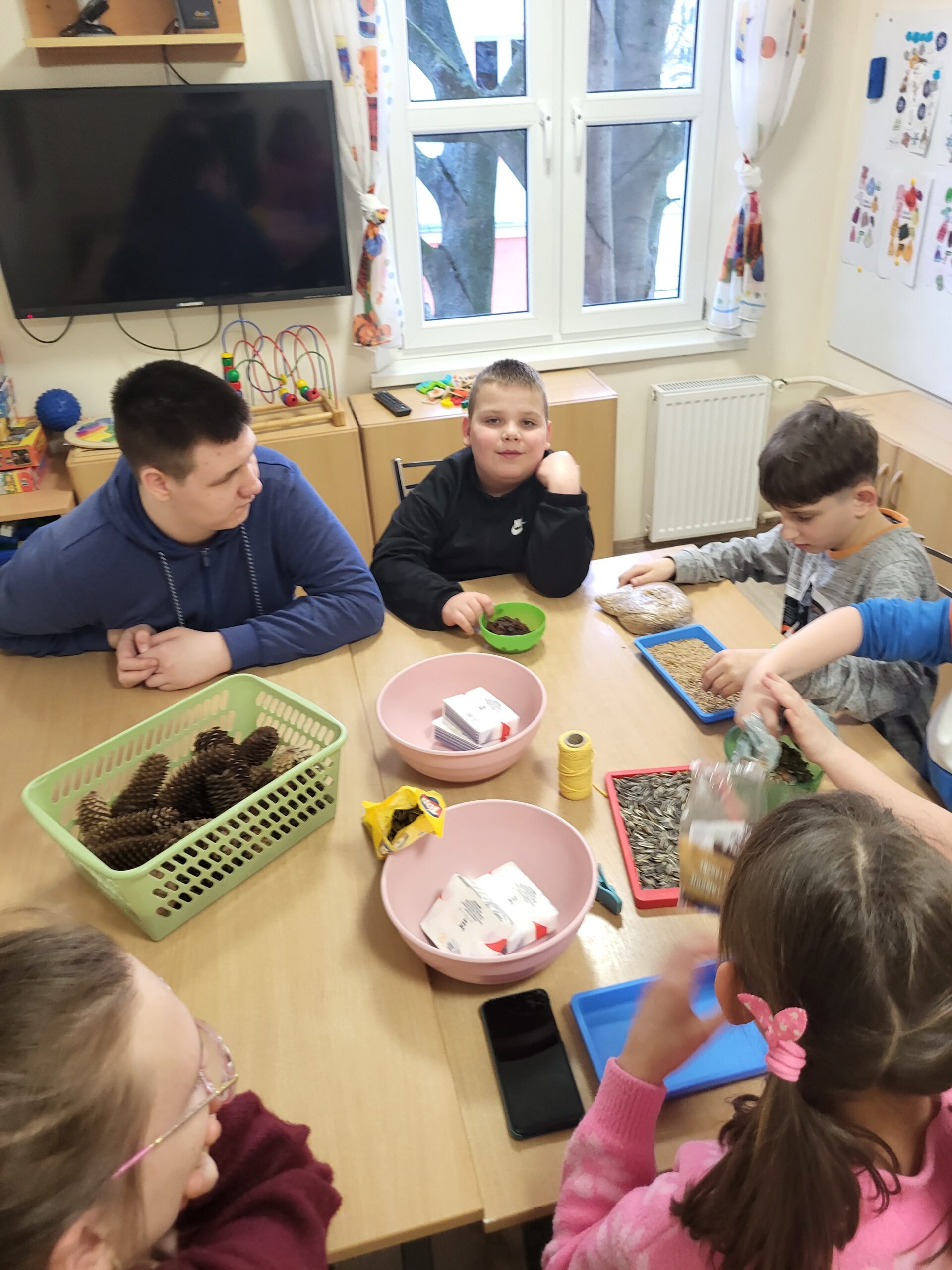 W ramach zajęć wychowawczych wychowankowie gr. II i I zorganizowali działania pt. ,,Stołówka dla ptaków.” Wychowankowie zapoznali się z zasadami dokarmiania ptaków w okresie zimowym oraz dowiedzieli się, jakie produkty są dla nich bezpieczne i wartościowe. Uczyli się samodzielnego formowania kul tłuszczowych, dobierania odpowiednich ziaren oraz przygotowywania mieszanek pokarmowych dla ptaków. Dzieci własnoręcznie porcjowały składniki, ugniatały masę oraz przygotowały kule do zawieszenia. Samodzielnie uczestniczyły również w zawieszaniu gotowych kul na terenie internatu. Wychowankowie każdego dnia mogą obserwować ptaki i dbać o regularne ich dokarmianie.