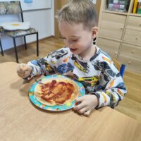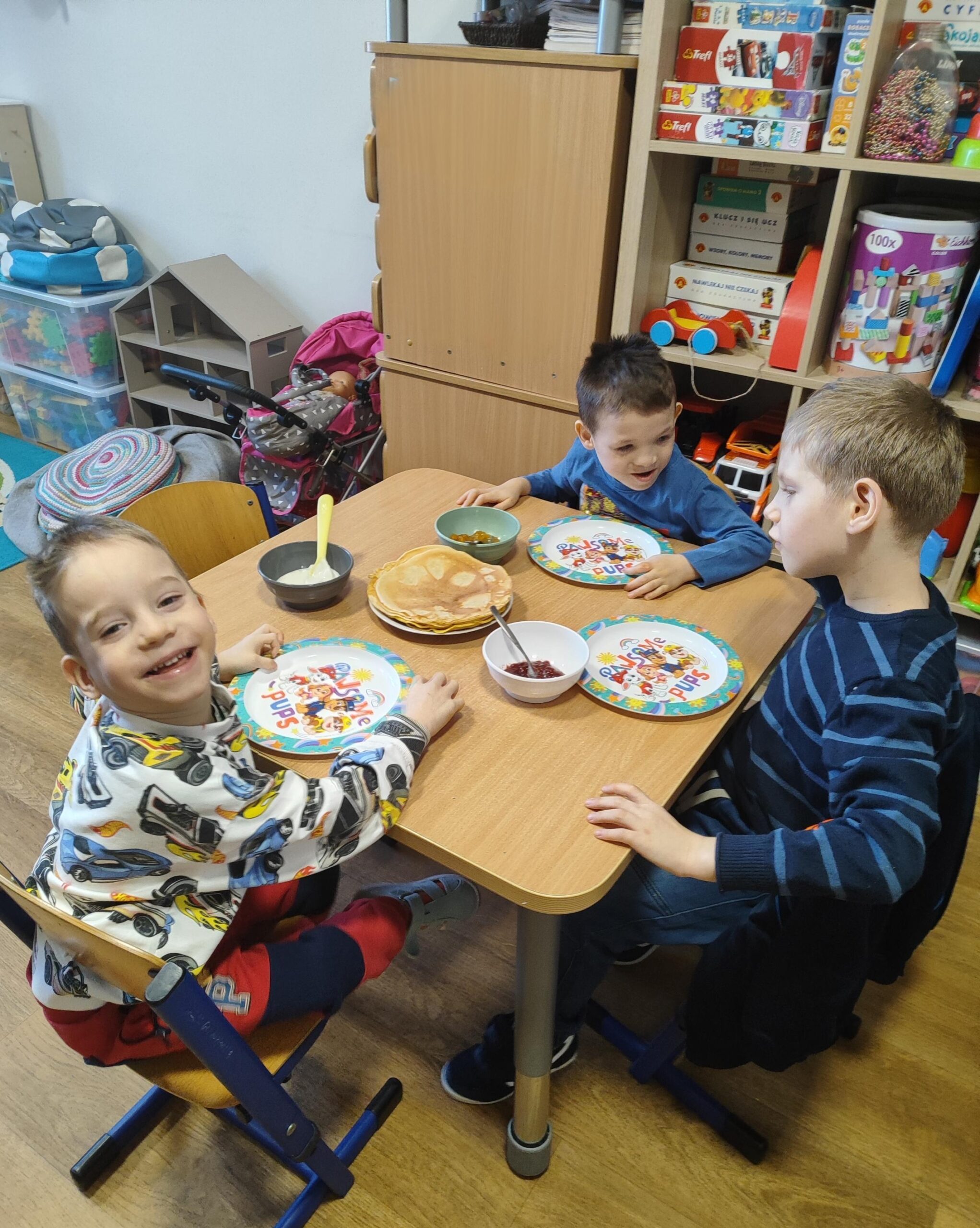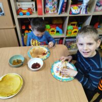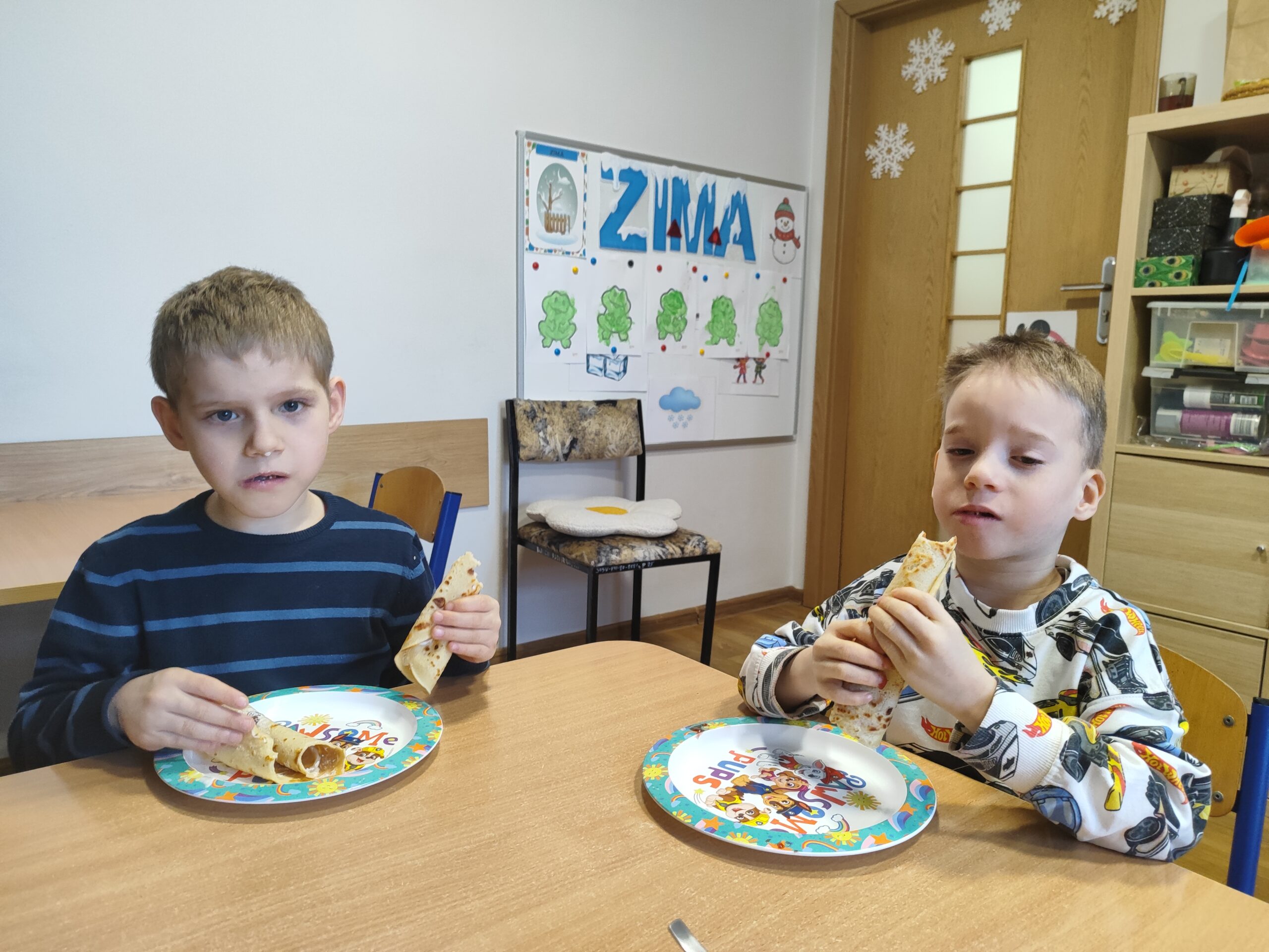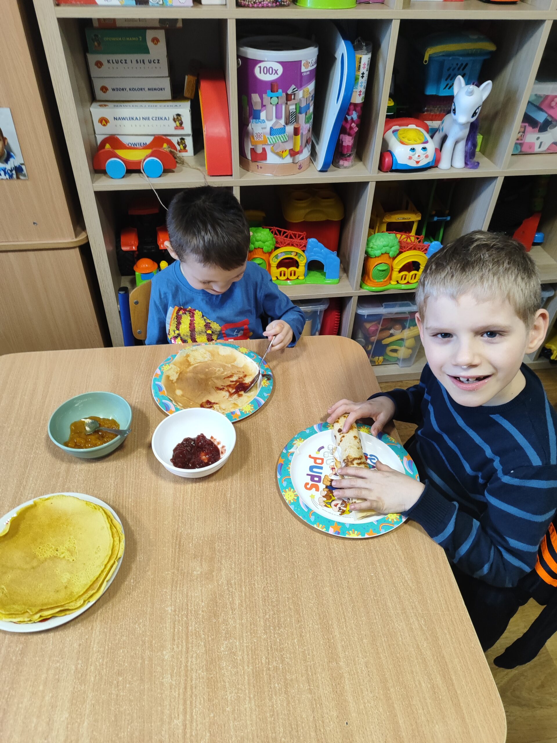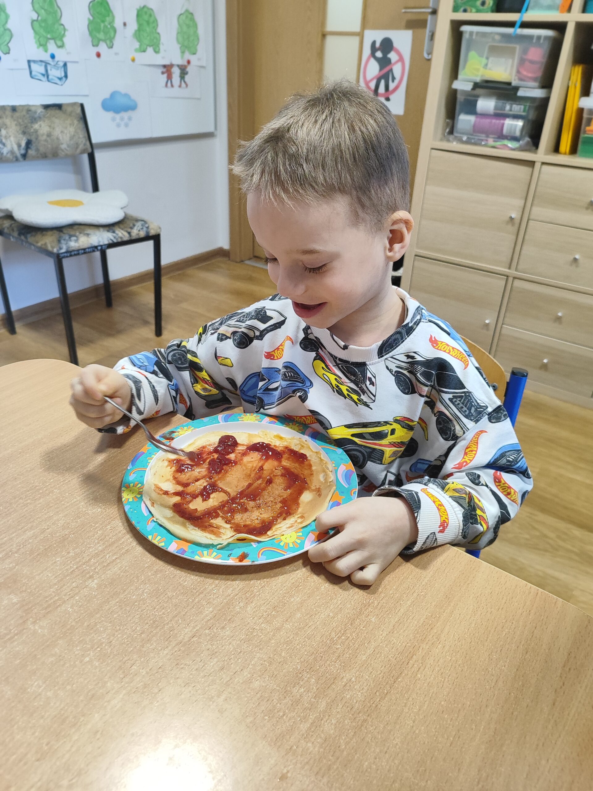 W przedszkolu 2 lutego zapachniało wyjątkowo słodko! Z okazji Dnia Naleśnika dzieci miały ręce pełne roboty. Na talerzach wylądowały rumiane placki przygotowane przez nauczycielkę, a dzieci samodzielnie decydowały o ich nadzieniu. Tygryski z wielkim zaangażowaniem smarowały naleśniki aksamitnym twarożkiem, nakładały dżem oraz zwijały w rulony swoje kulinarne dzieła. Finałem była wspólna uczta. Było wesoło, słodko i bardzo smacznie!