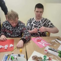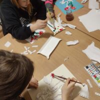 Uczestnicy zajęć tworzyli wypukłe elementy kwiatów i wazony, dbając o detale i dobór kolorów.