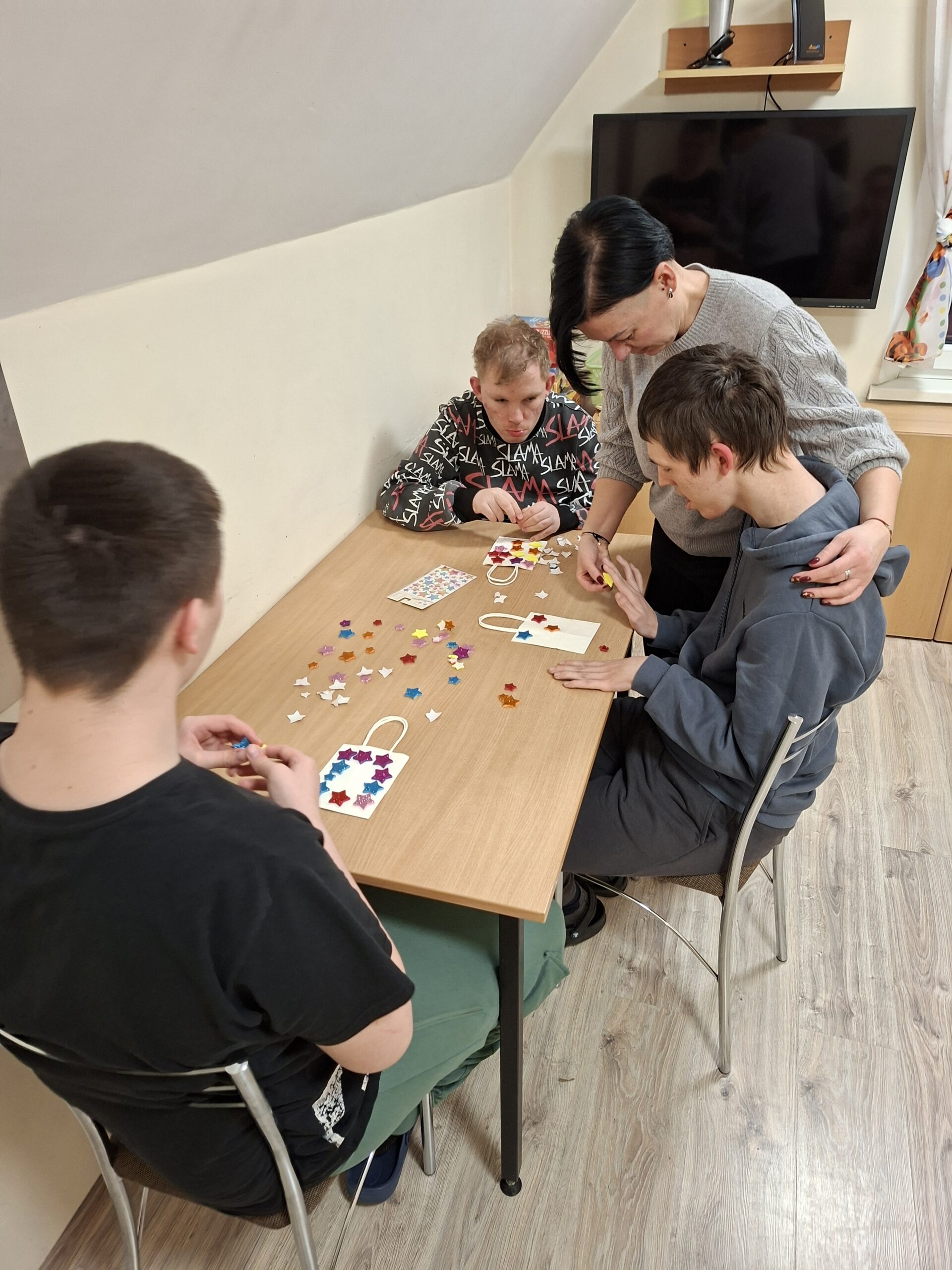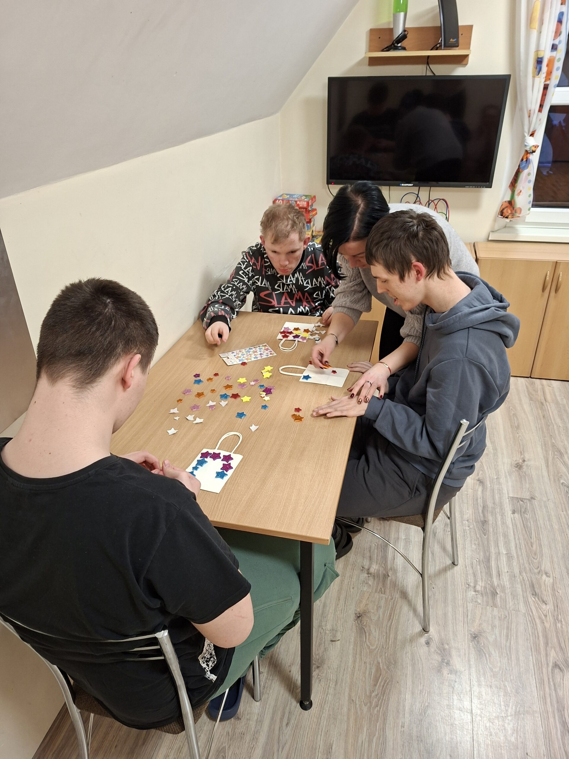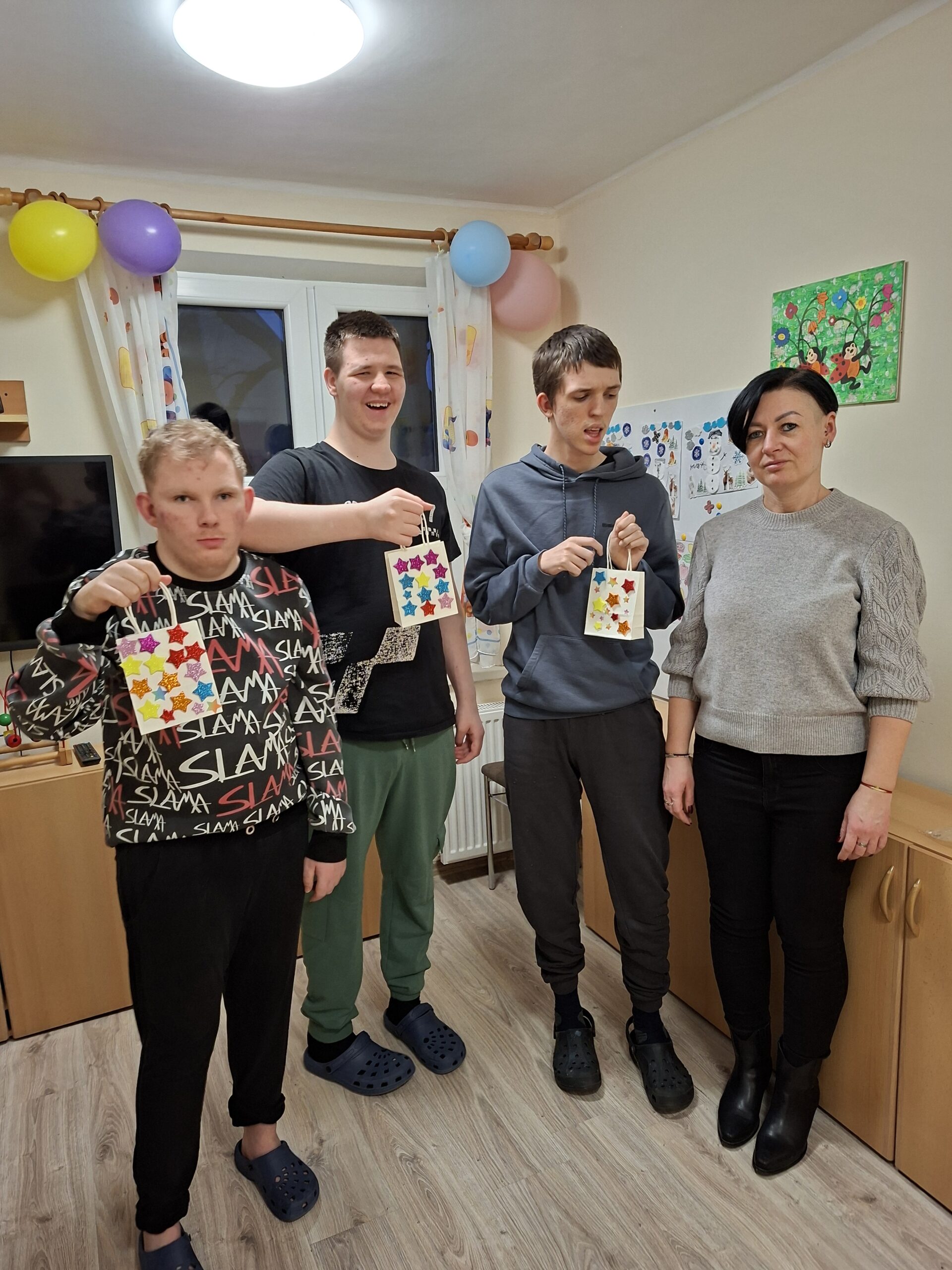 W dniu 10 lutego w Internacie I grupa wzięła udział w zajęciach kreatywnych dotyczących tworzenia małych torebek prezentowych. Dzieci dostały małą, białą torebkę oraz kolorowe gwiazdki do przyozdobienia. Gotowe już torebki dzieci zabiorą do domu.