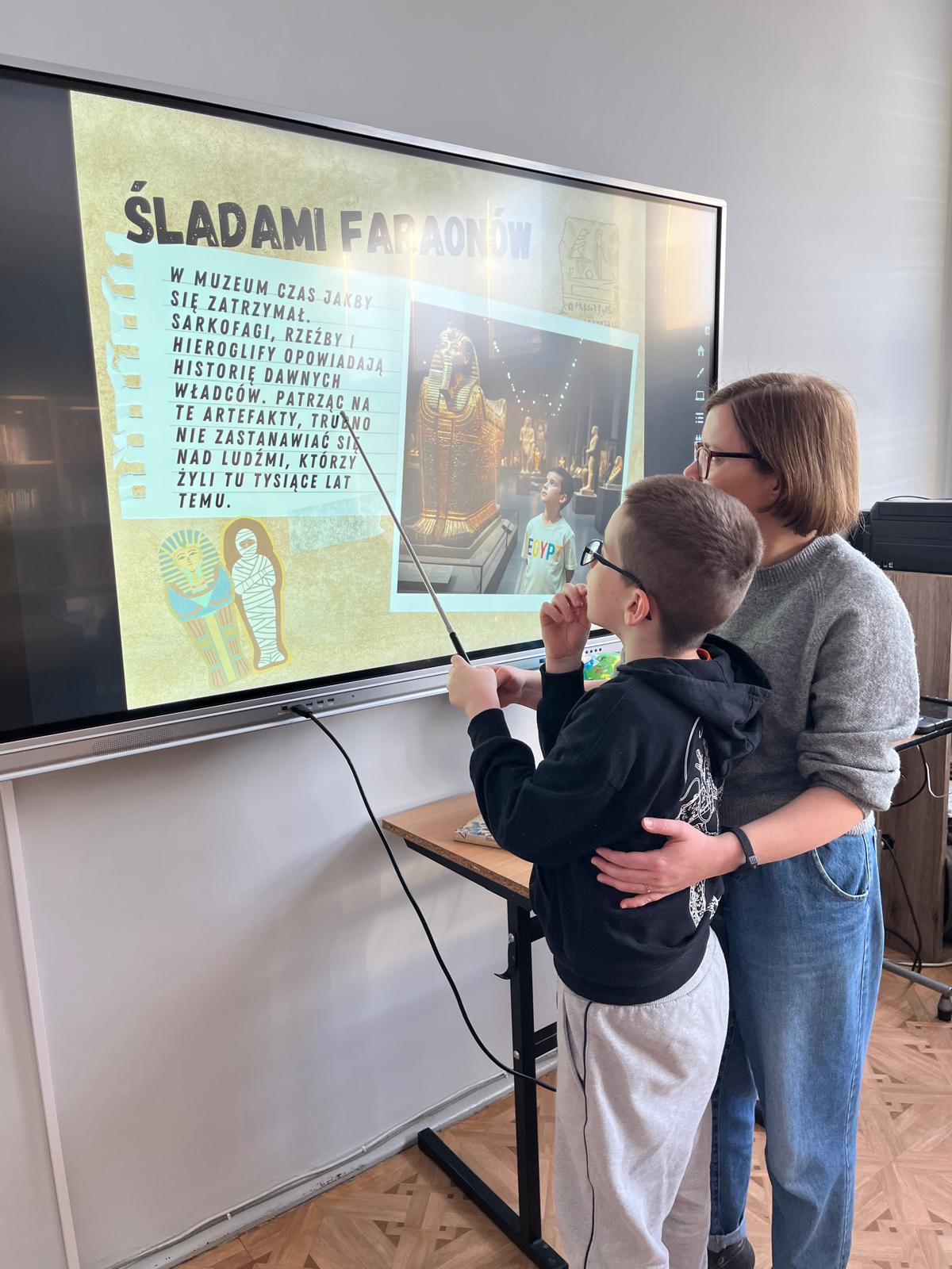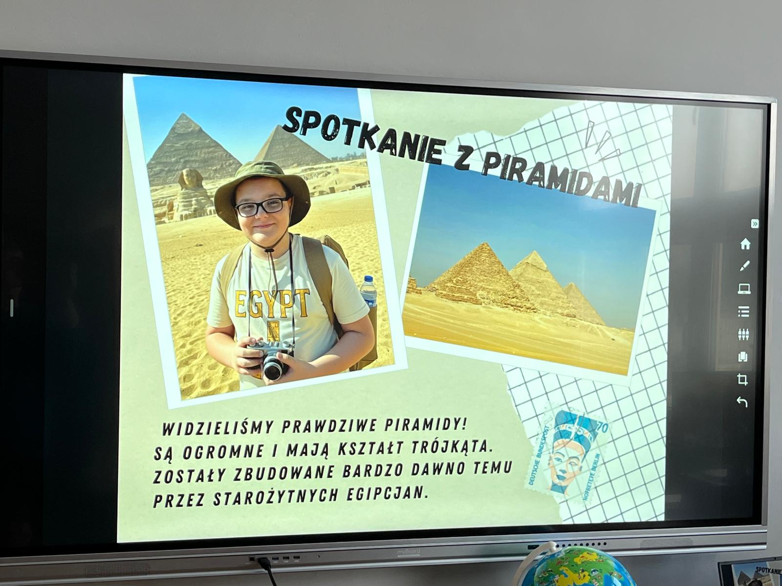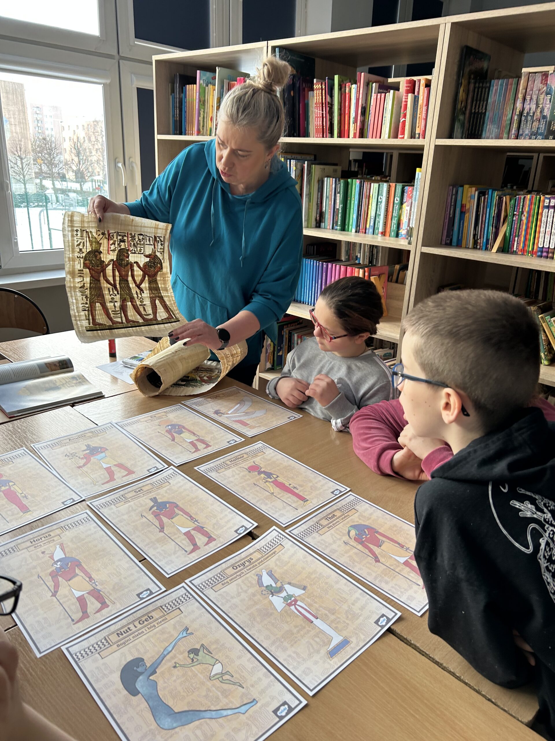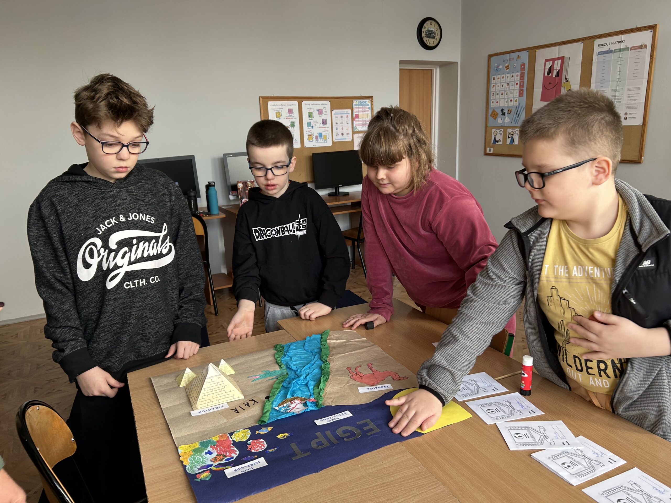 Uczniowie samodzielnie wykonali makietę Egiptu i podpisali jej najważniejsze elementy: rzekę Nil, dromadera, piramidę, rafę koralową, Morze Śródziemne, Morze Czerwone oraz krokodyla nilowego. Oglądali również papirusy z wizerunkami egipskich bogów, dopasowywali ich nazwy do przedstawień oraz pracowali z globusem interaktywnym Orboot. Zajęcia wzbogaciła degustacja egipskich słodyczy – daktyli i baklawy.