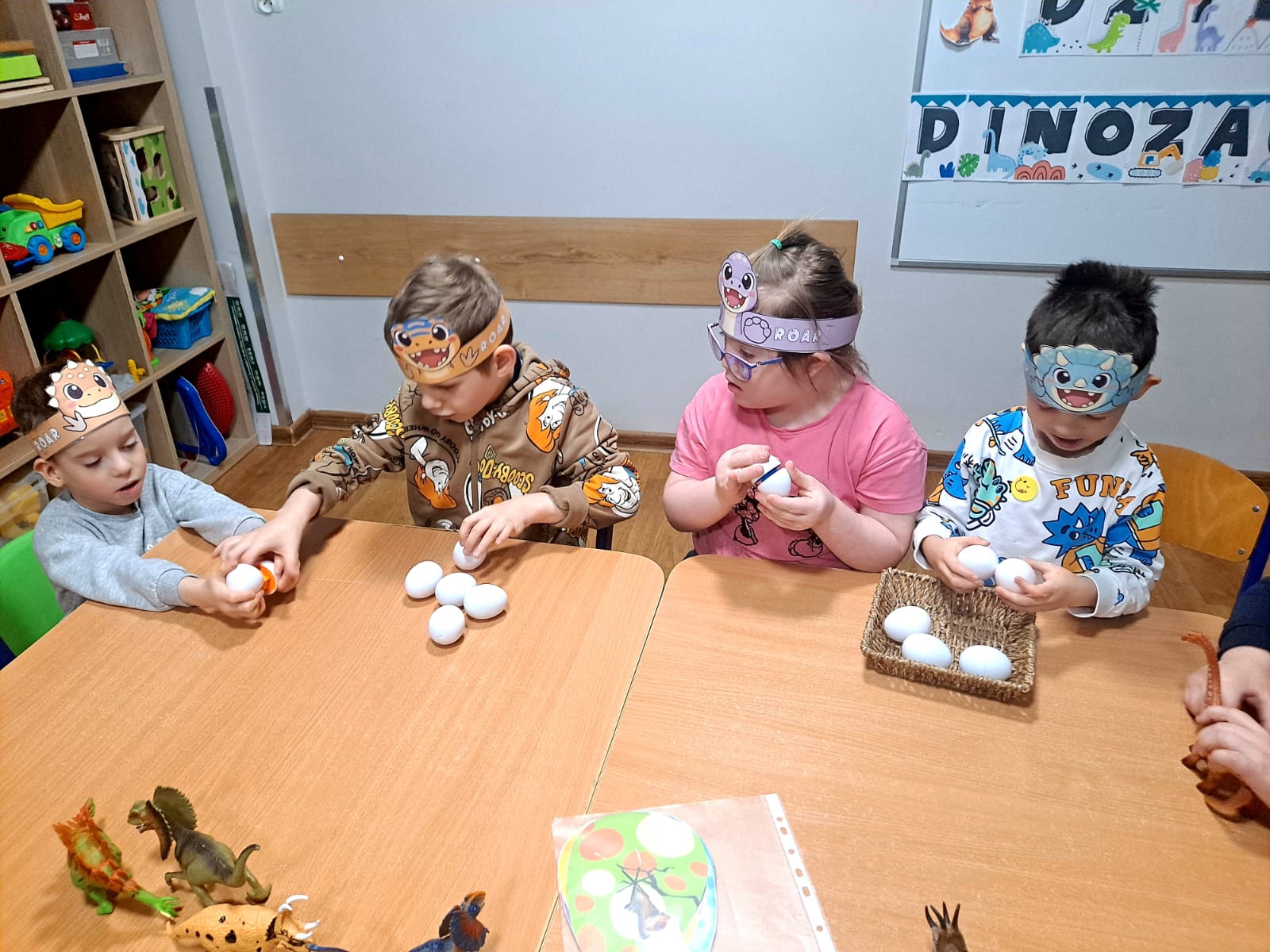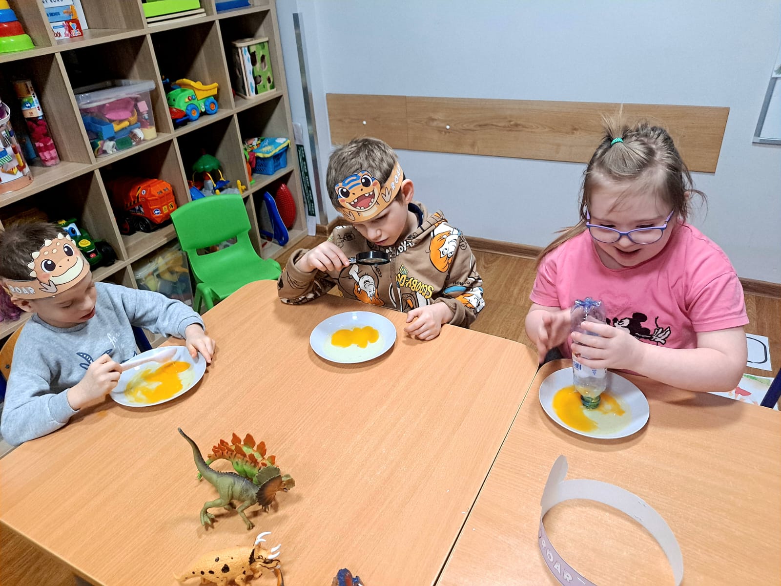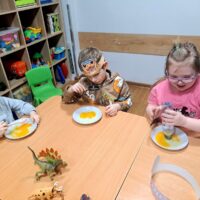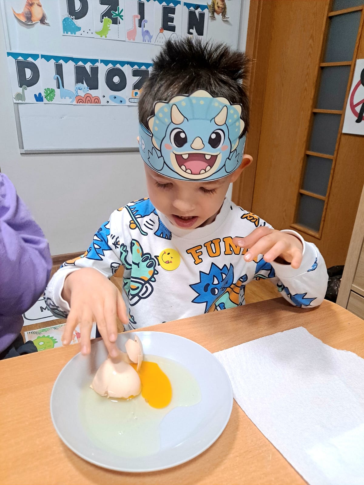 Tego dnia nasza sala zamieniła się w plac wykopaliskowy. Mali paleontolodzy za pomocą pędzelków cierpliwie poszukiwali obrazków dinozaurów ukrytych w „piasku” z kaszy. Następnie pod okiem nauczyciela rozbijali jajka, próbowali oddzielić żółtko od białka i z fascynacją oglądali strukturę skorupki przez lupę.