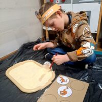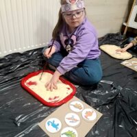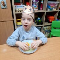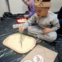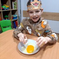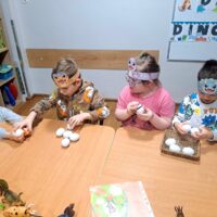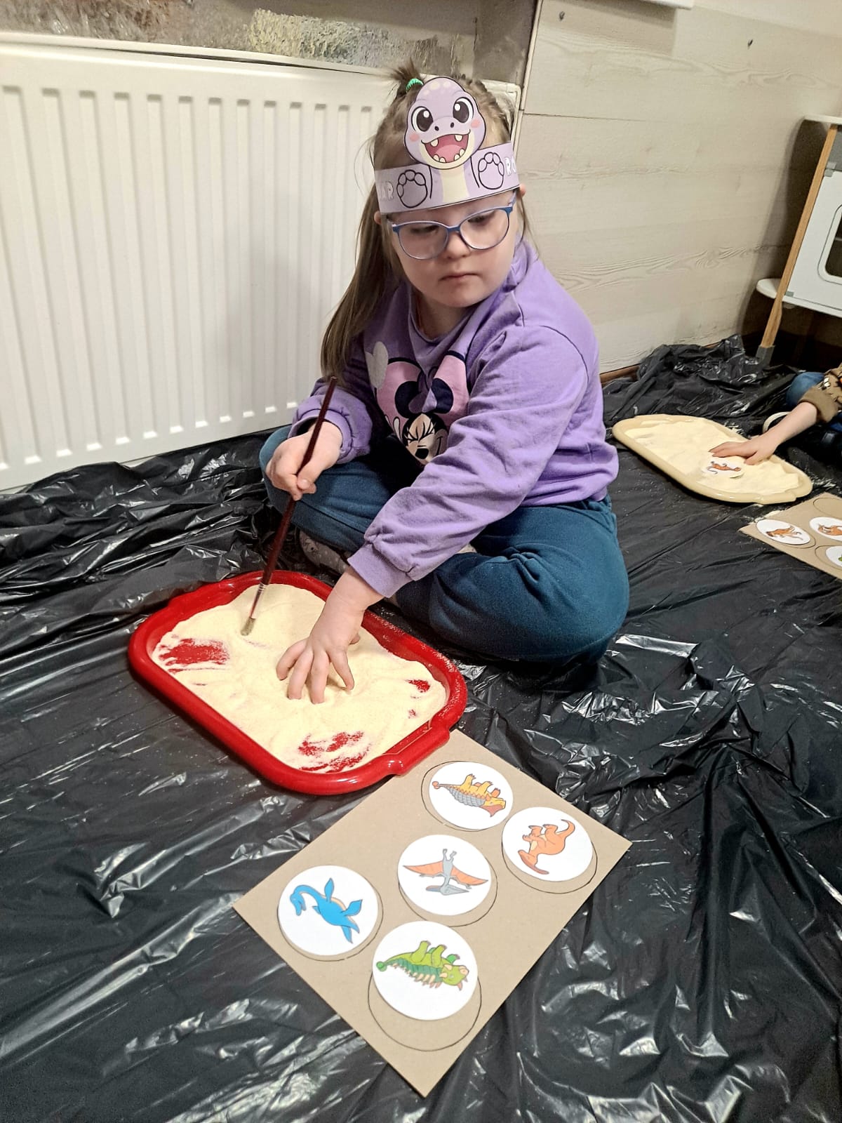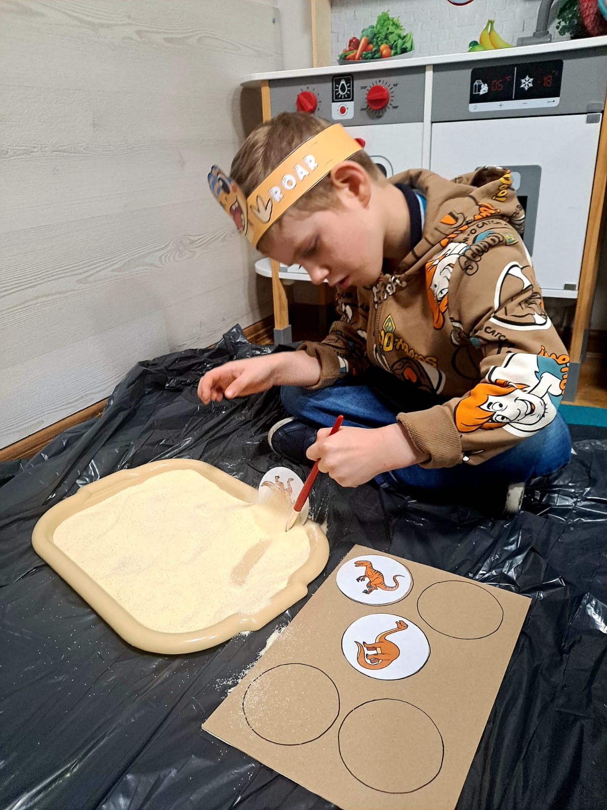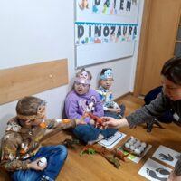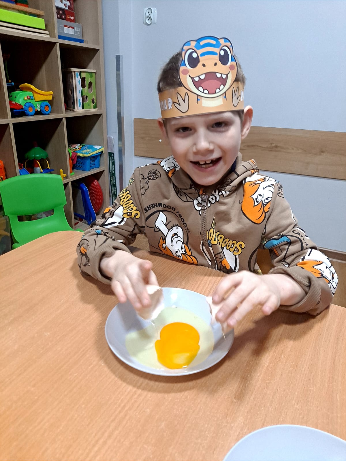 Tego dnia nasza sala zamieniła się w plac wykopaliskowy. Mali paleontolodzy za pomocą pędzelków cierpliwie poszukiwali obrazków dinozaurów ukrytych w „piasku” z kaszy. Następnie pod okiem nauczyciela rozbijali jajka, próbowali oddzielić żółtko od białka i z fascynacją oglądali strukturę skorupki przez lupę.