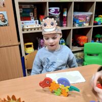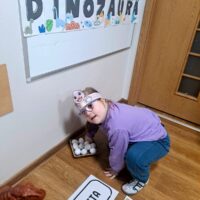 W czwartek w przedszkolu zapanowała prawdziwa „jurajska” atmosfera! Dzień rozpoczął się od oglądania ilustracji i słuchania ciekawostek, dzięki którym dzieci poznały najpopularniejsze gatunki dinozaurów. Był to wstęp do pełnego wyzwań toru przeszkód. Przedszkolaki musiały wykazać się zwinnością na trasie, by na mecie zdobyć nagrodę – jajo dinozaura.
