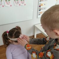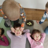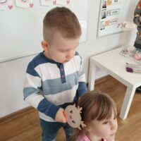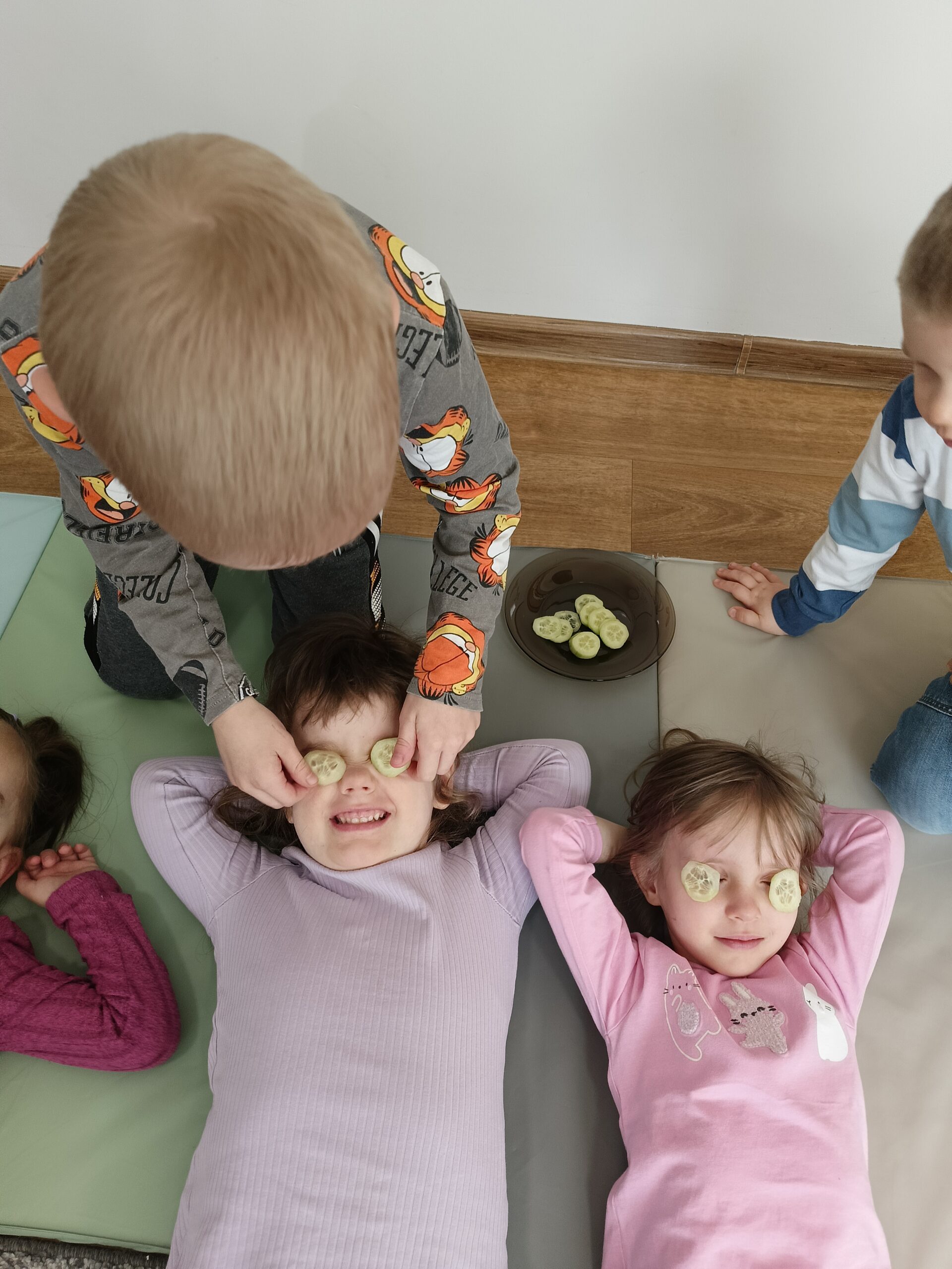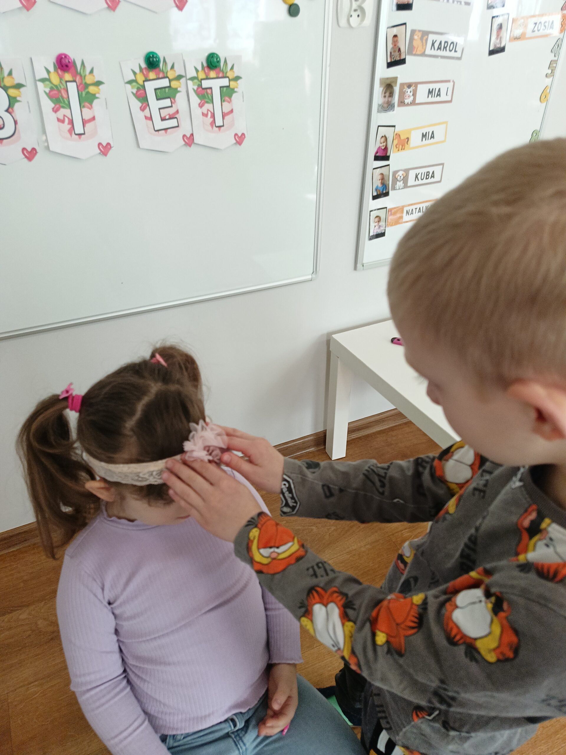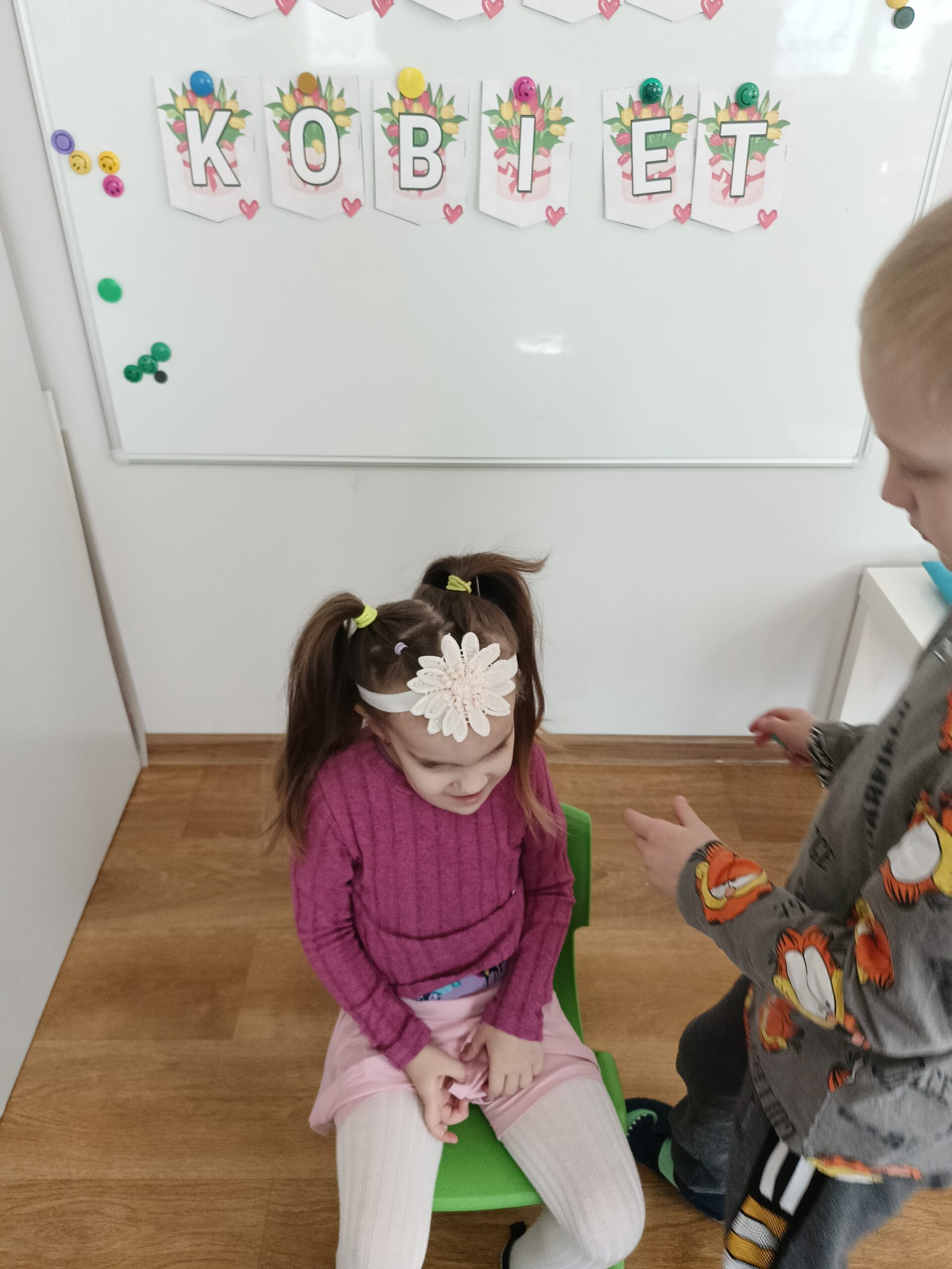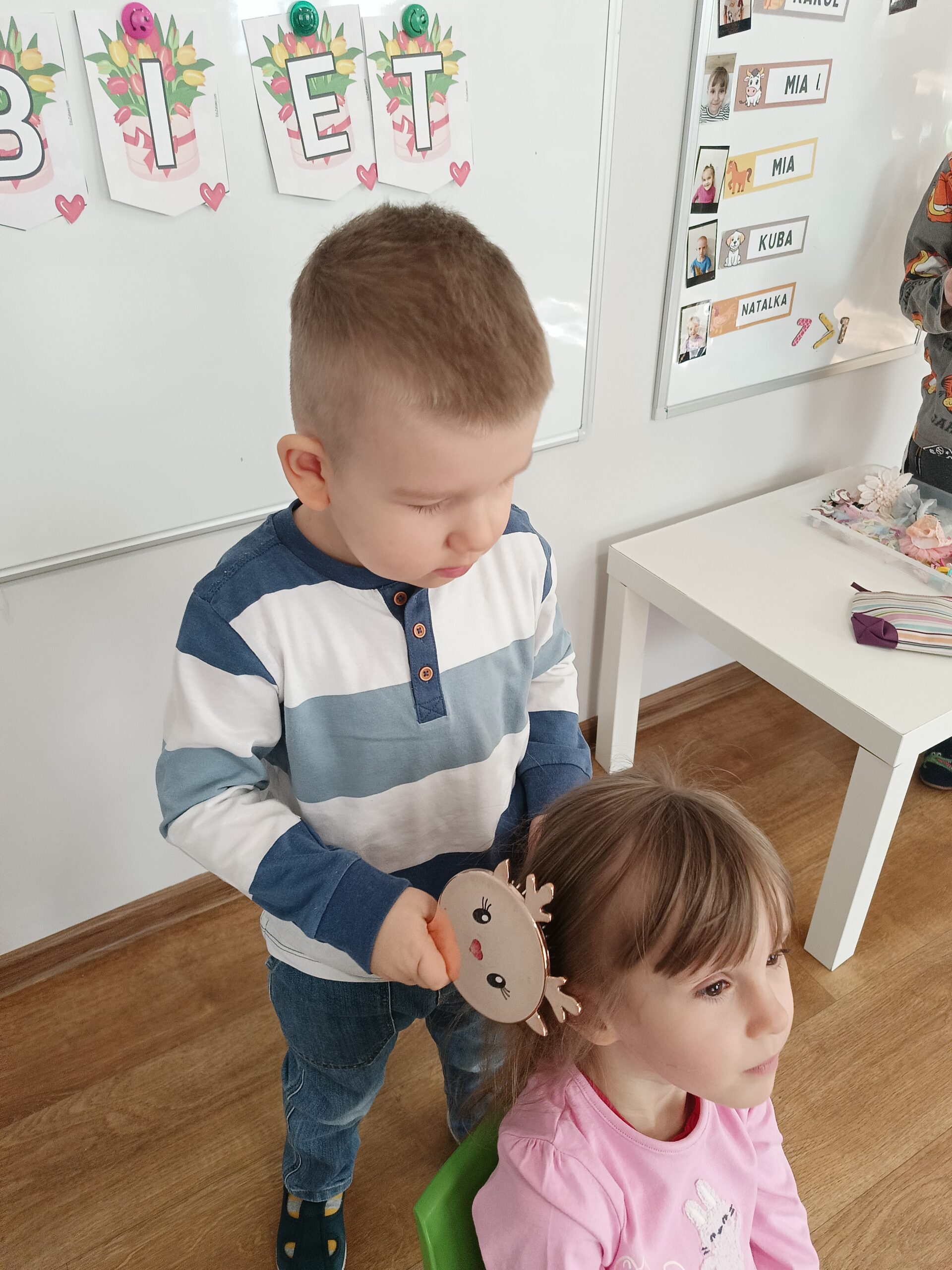 Grupa Waleczne Pszczółki zmieniła się w salon piękności. Dziewczynki nałożyły na oczy maseczkę z ogórków. Chłopcy czesali koleżanki oraz ozdabiali ich włosy spinkami i opaskami. Na zakończenie Karol i Kuba wręczyli dziewczynkom wiatraczkowe kwiatki, składając im życzenia z okazji ich święta.