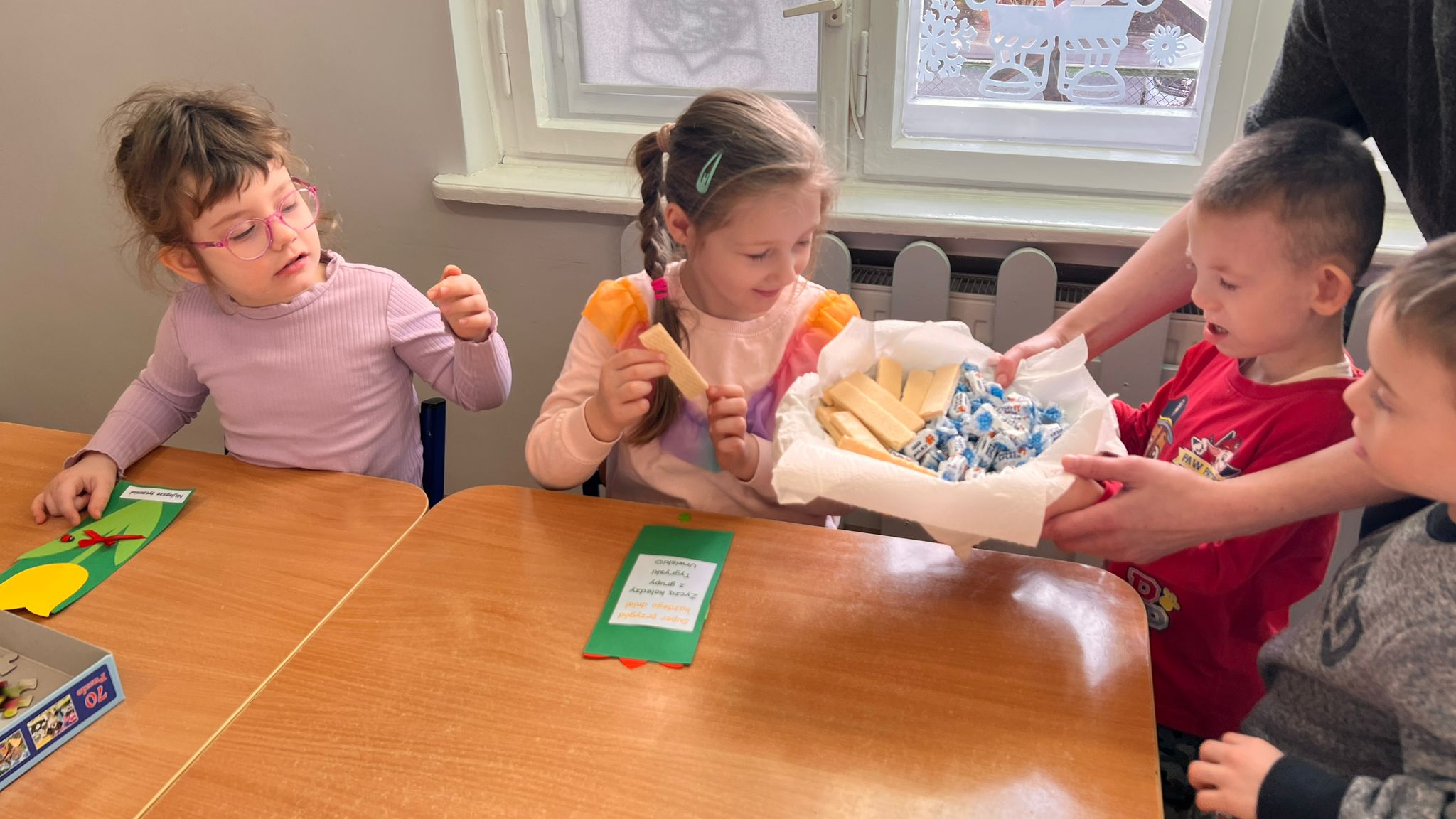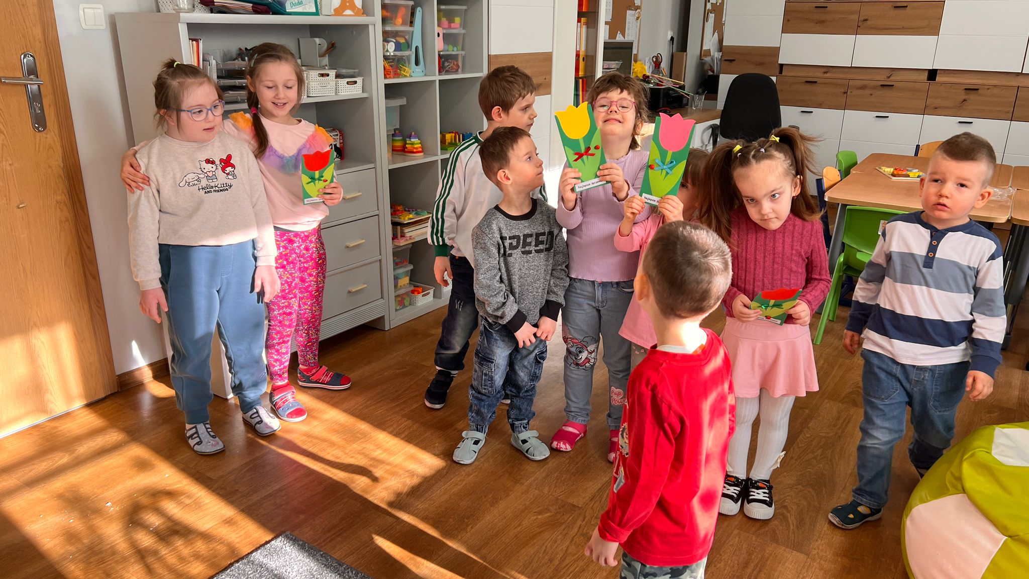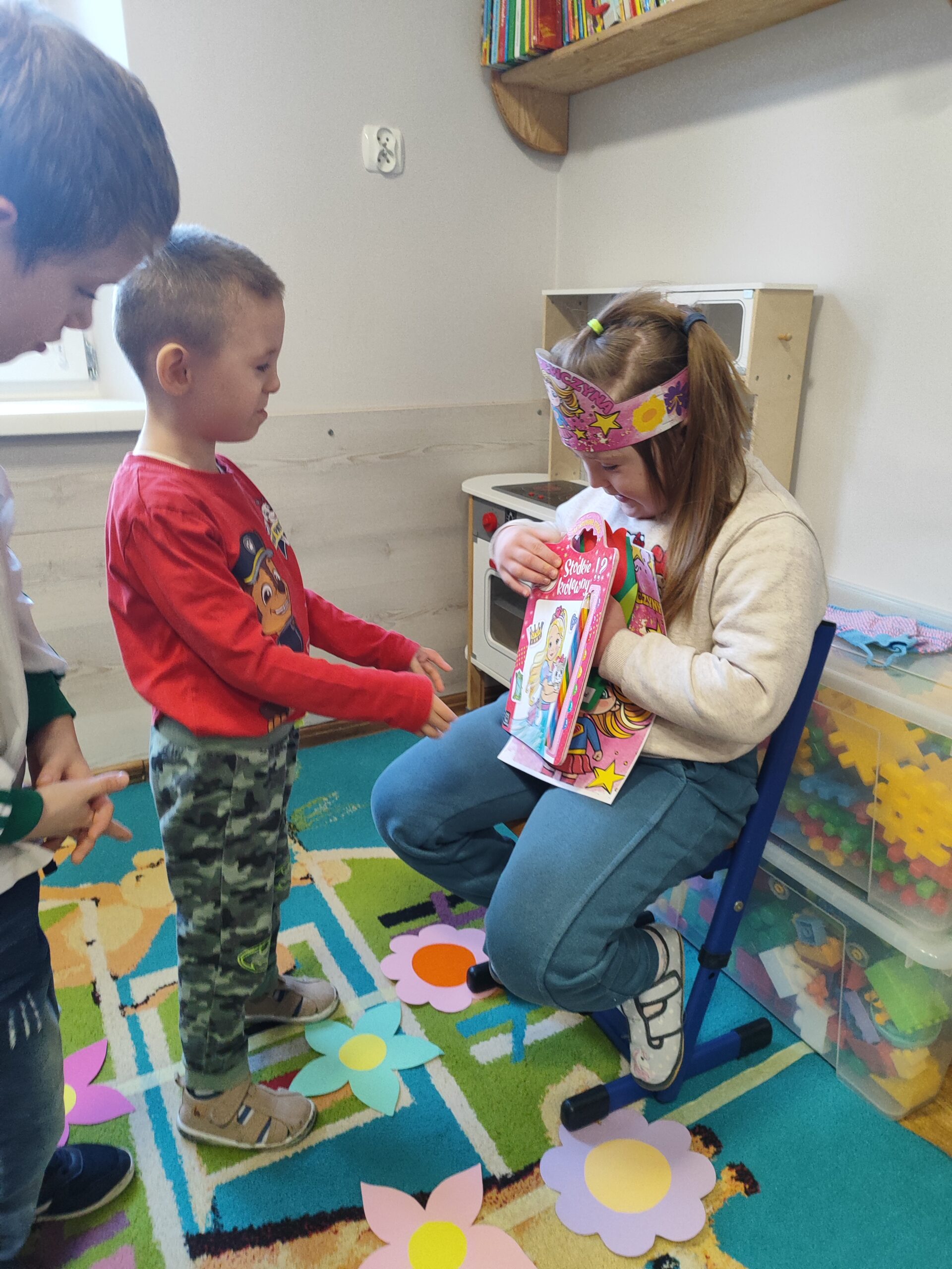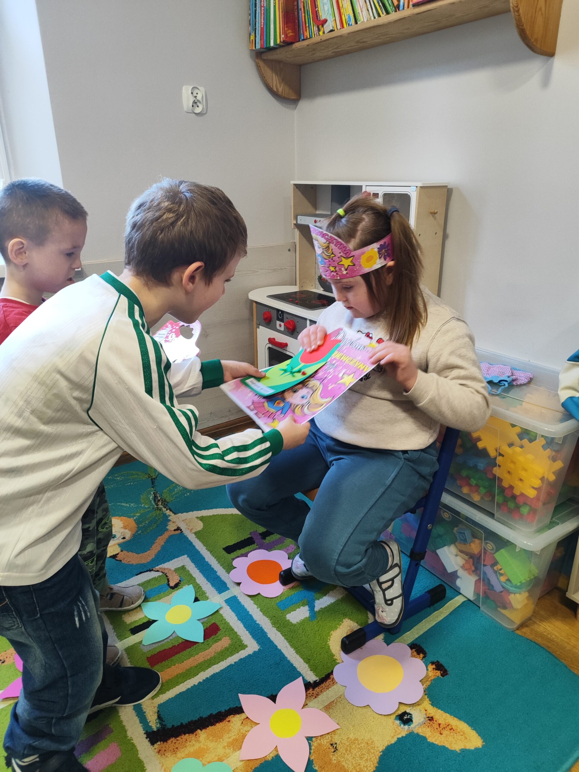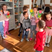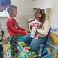 W grupie Tygryski Urwiski, w której jest tylko jedna dziewczynka, mali dżentelmeni stanęli na wysokości zadania, by ten dzień był naprawdę magiczny. Od samego rana w sali panowała wesoła atmosfera. Chłopcy chętnie brali udział we wspólnych zabawach, a drobny upominek, który wręczyli koleżance wywołał szeroki uśmiech na jej twarzy.