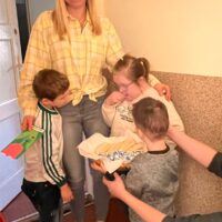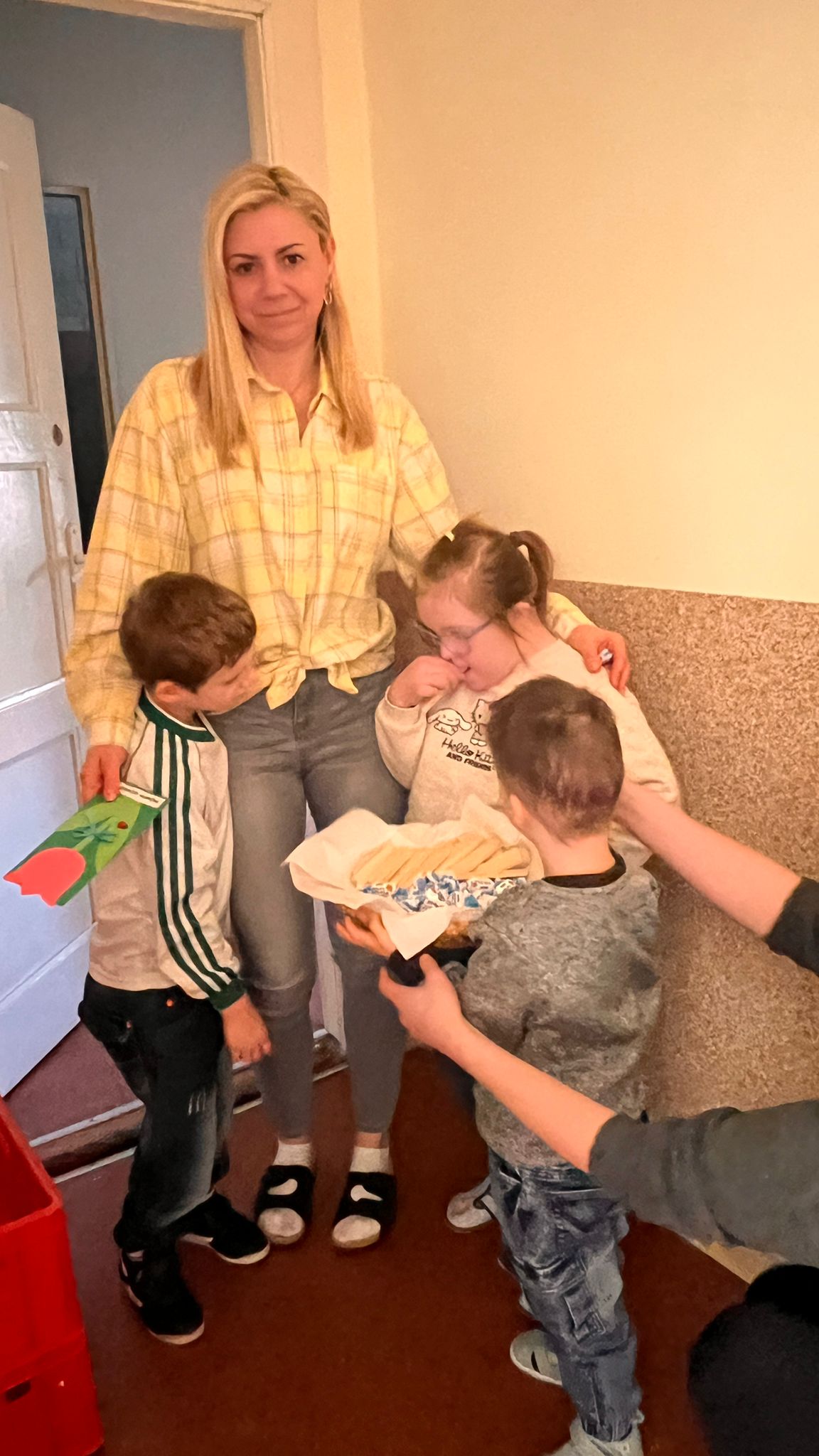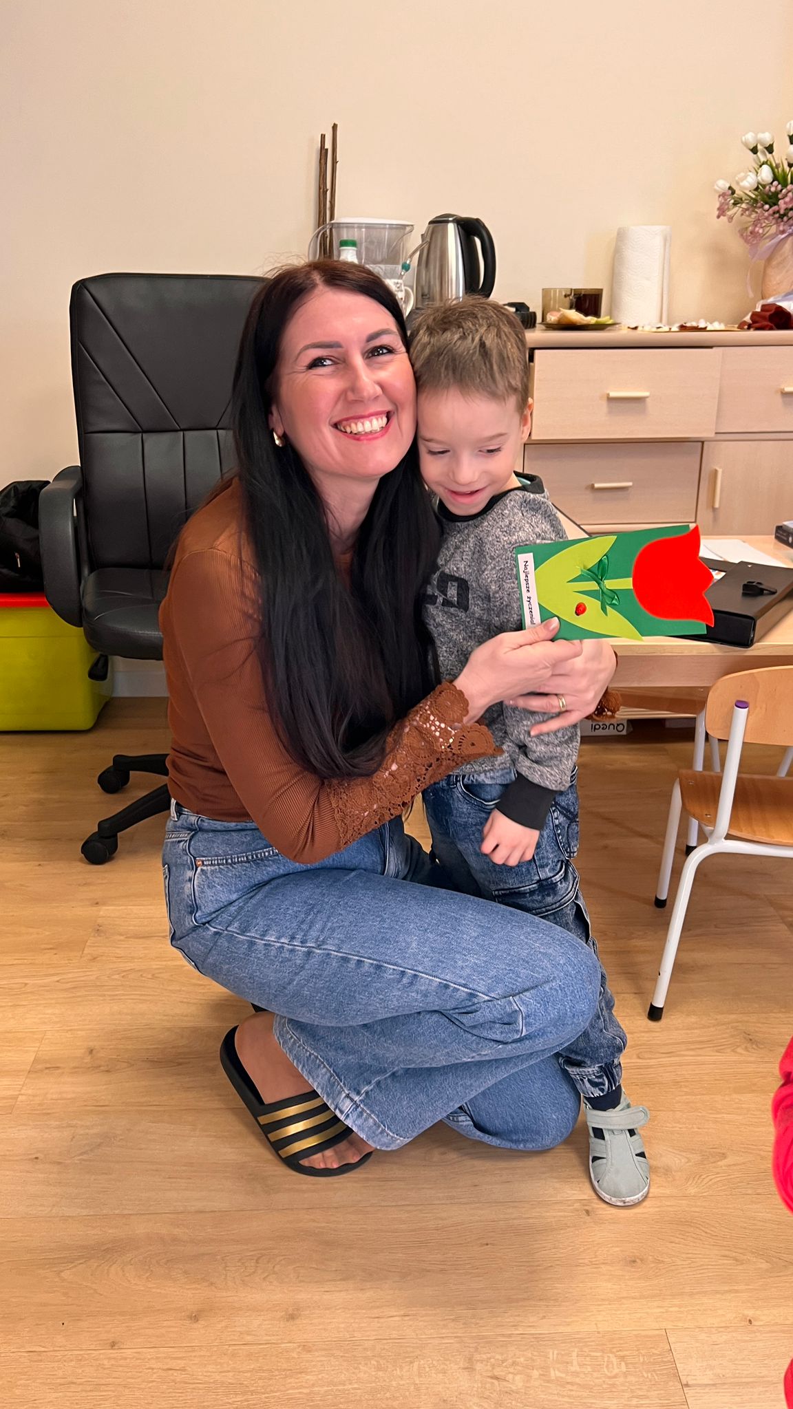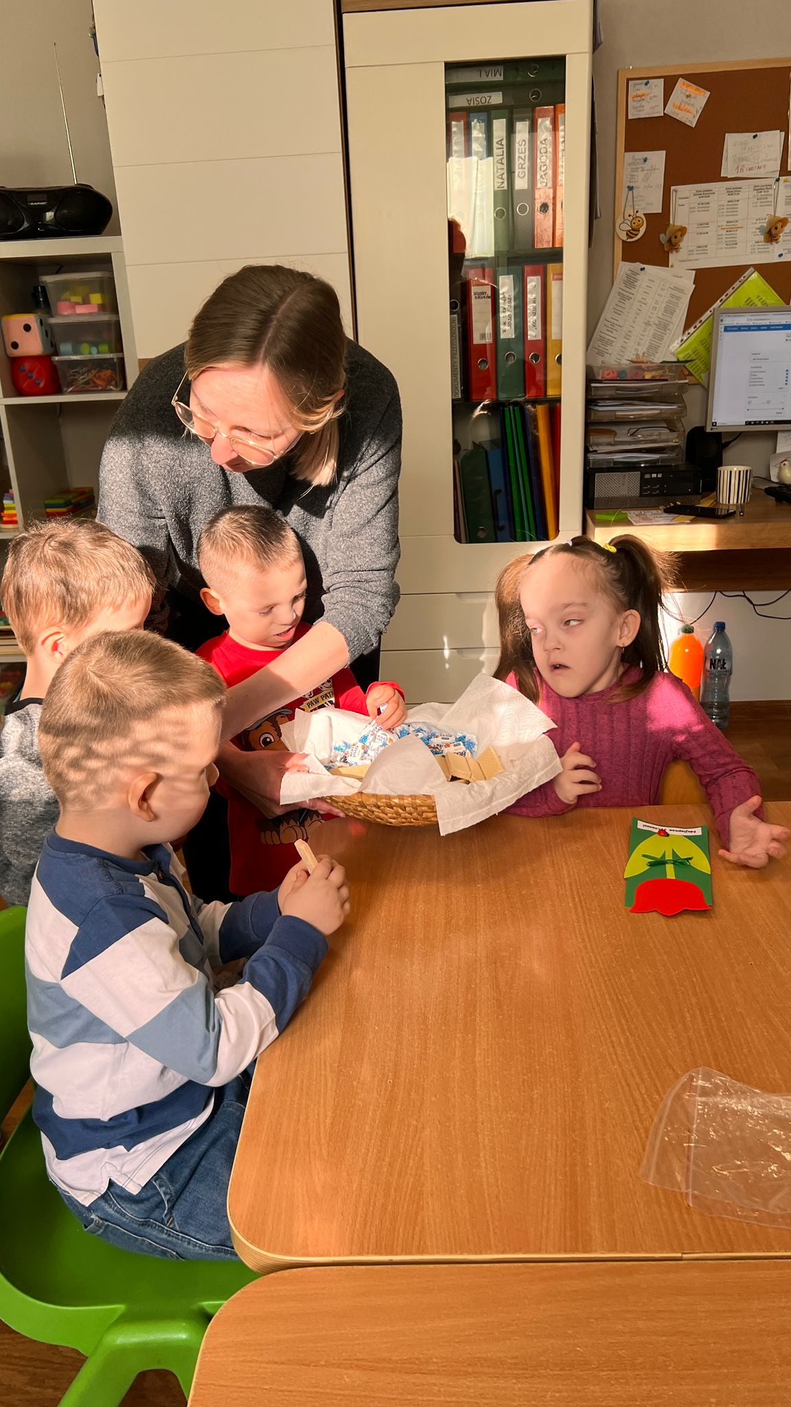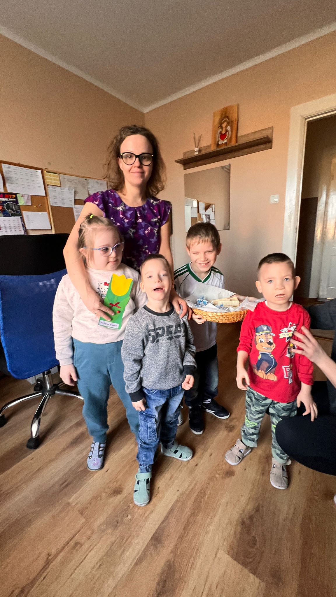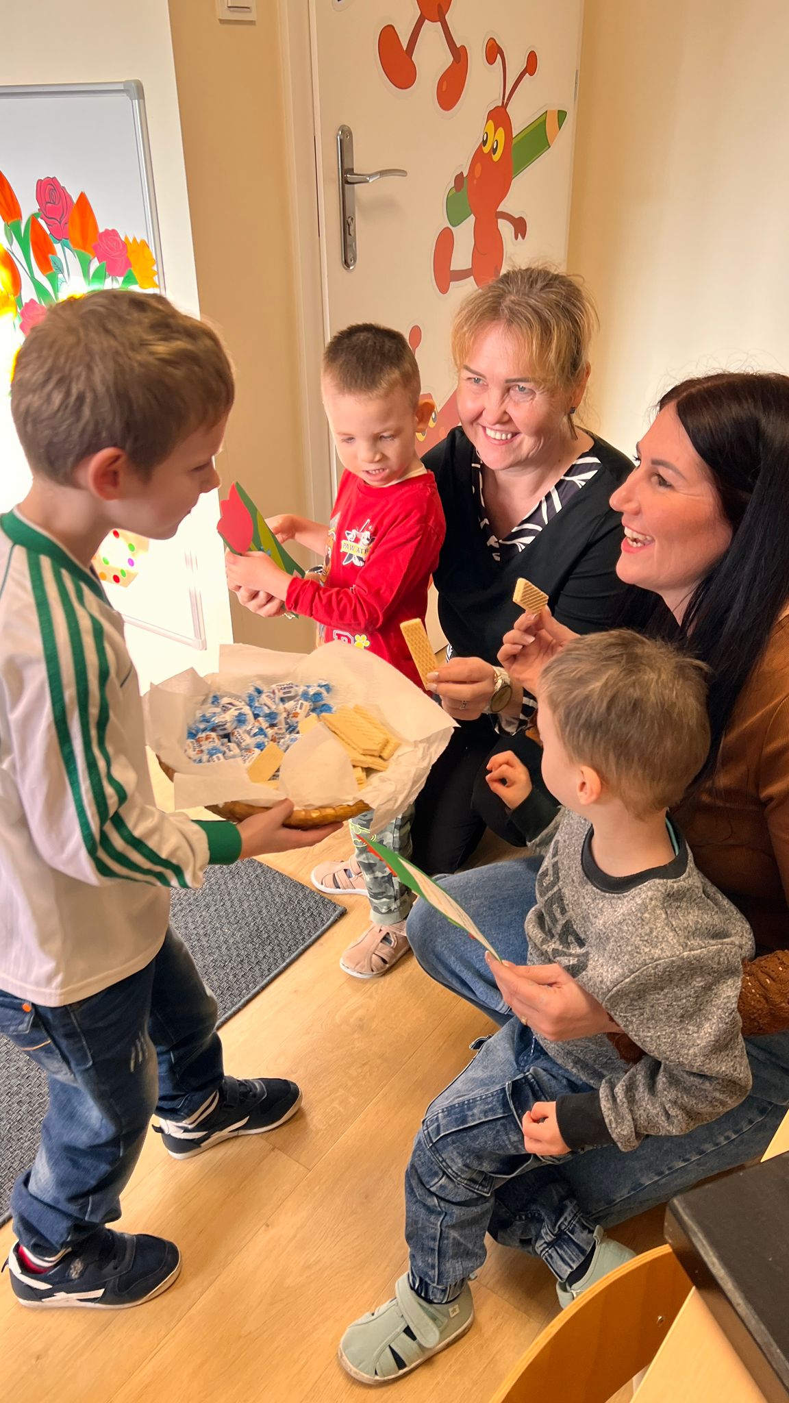 Mali mężczyźni nie zapomnieli także o pozostałych kobietach w naszym przedszkolu. Z kolorowymi laurkami i pysznymi cukierkami ruszyli w „uroczysty obchód”. Odwiedzili: koleżanki i panie z innych grup, panią kierownik, panią intendentkę, a także panie z kuchni.