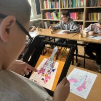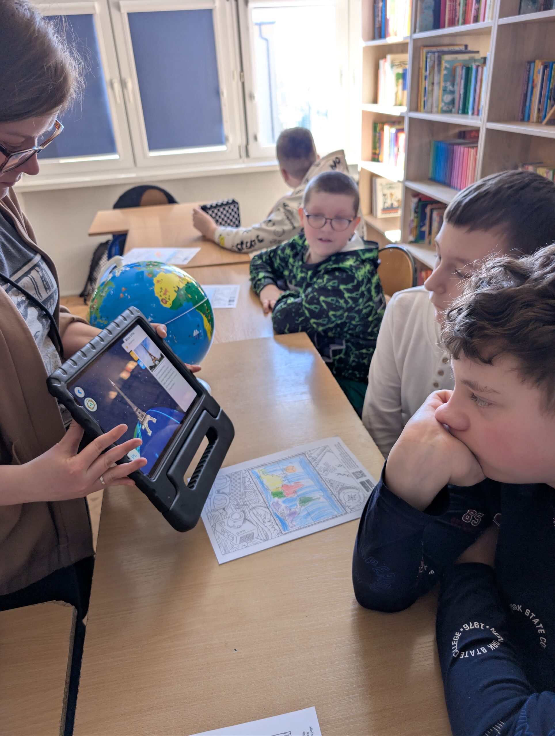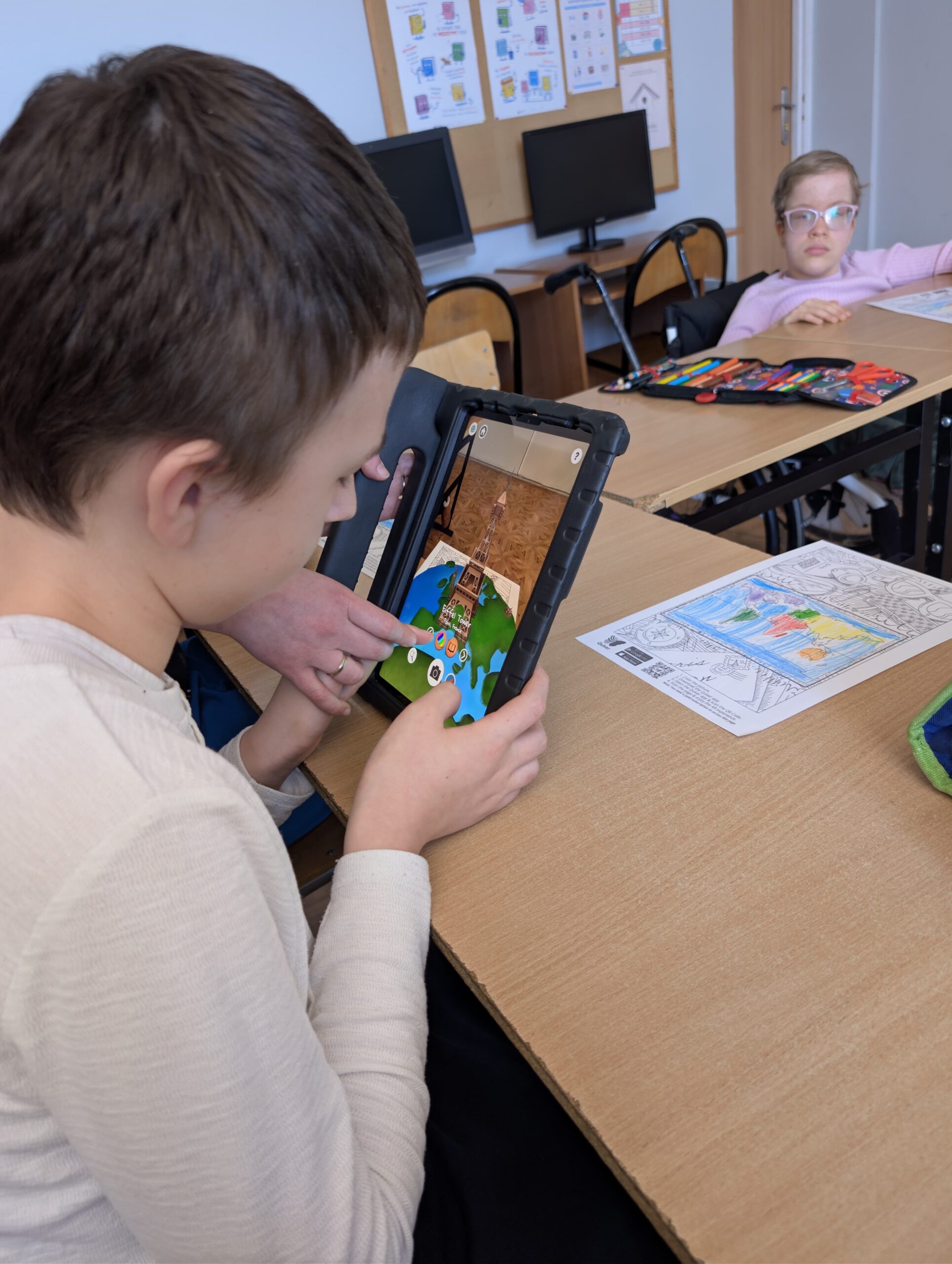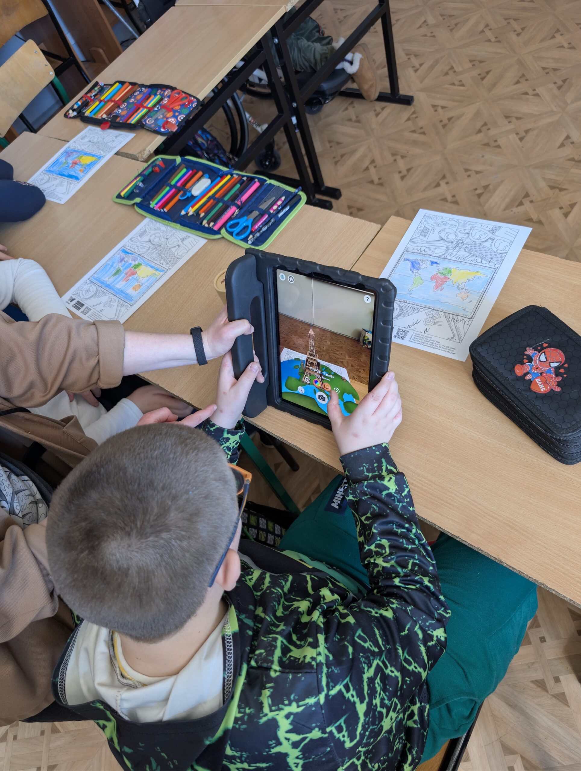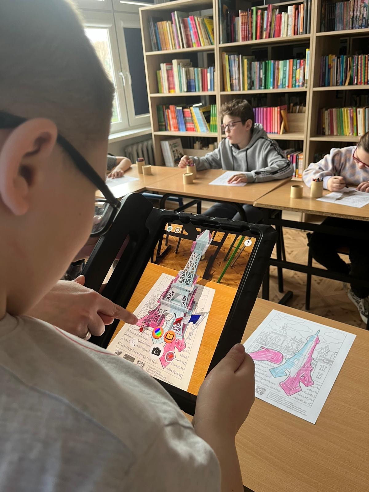 Po części wprowadzającej uczniowie wzięli udział w aktywności plastycznej z wykorzystaniem rozszerzonej rzeczywistości (AR). Kolorowali specjalną kartę przedstawiającą Wieżę Eiffla, a następnie – dzięki aplikacji Quiver – mogli zobaczyć, jak ich praca „ożywa” na ekranie urządzenia w formie trójwymiarowego modelu 3D.