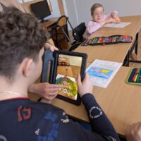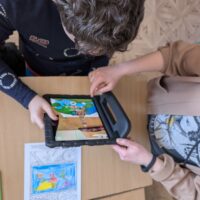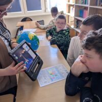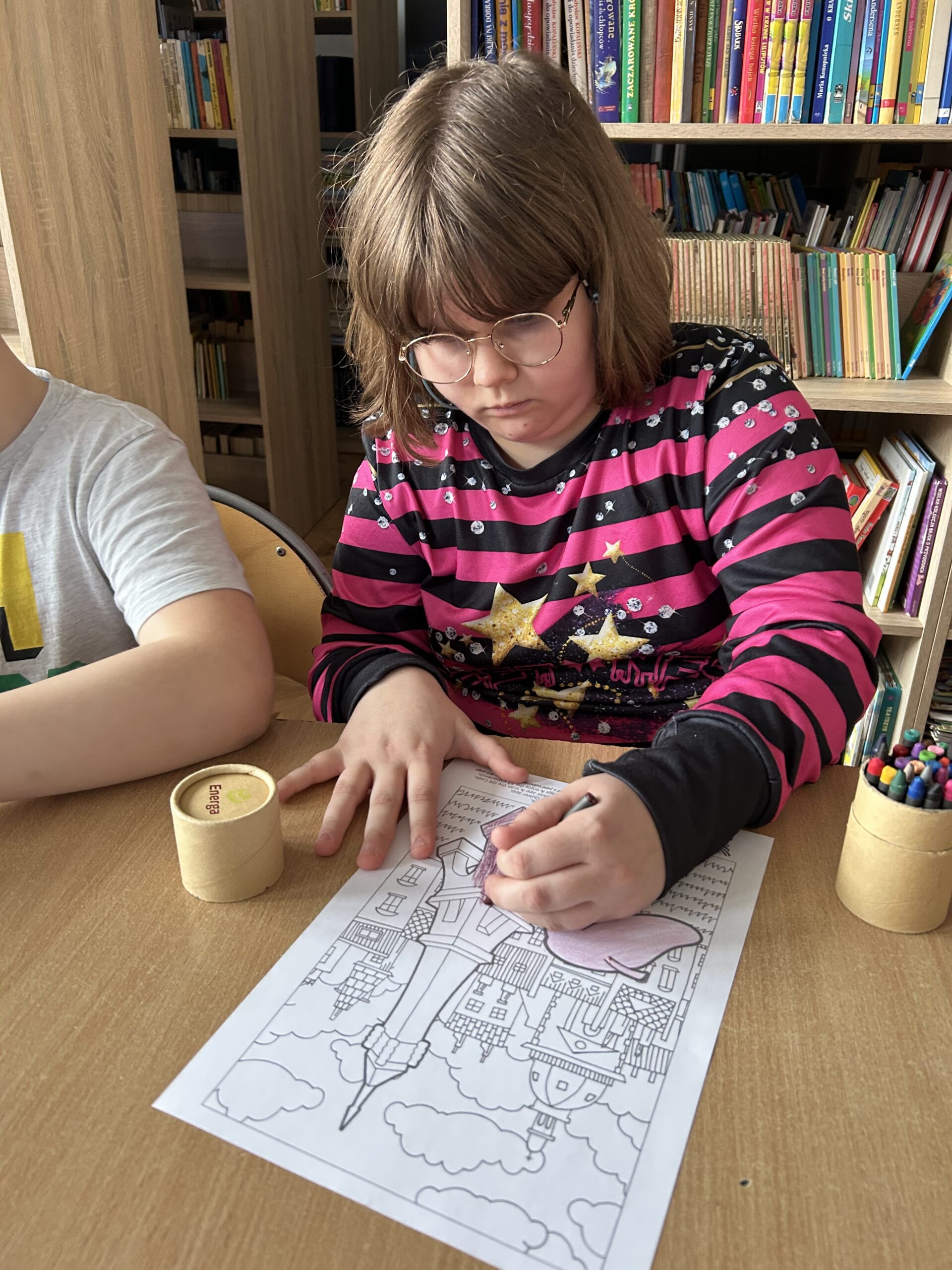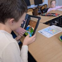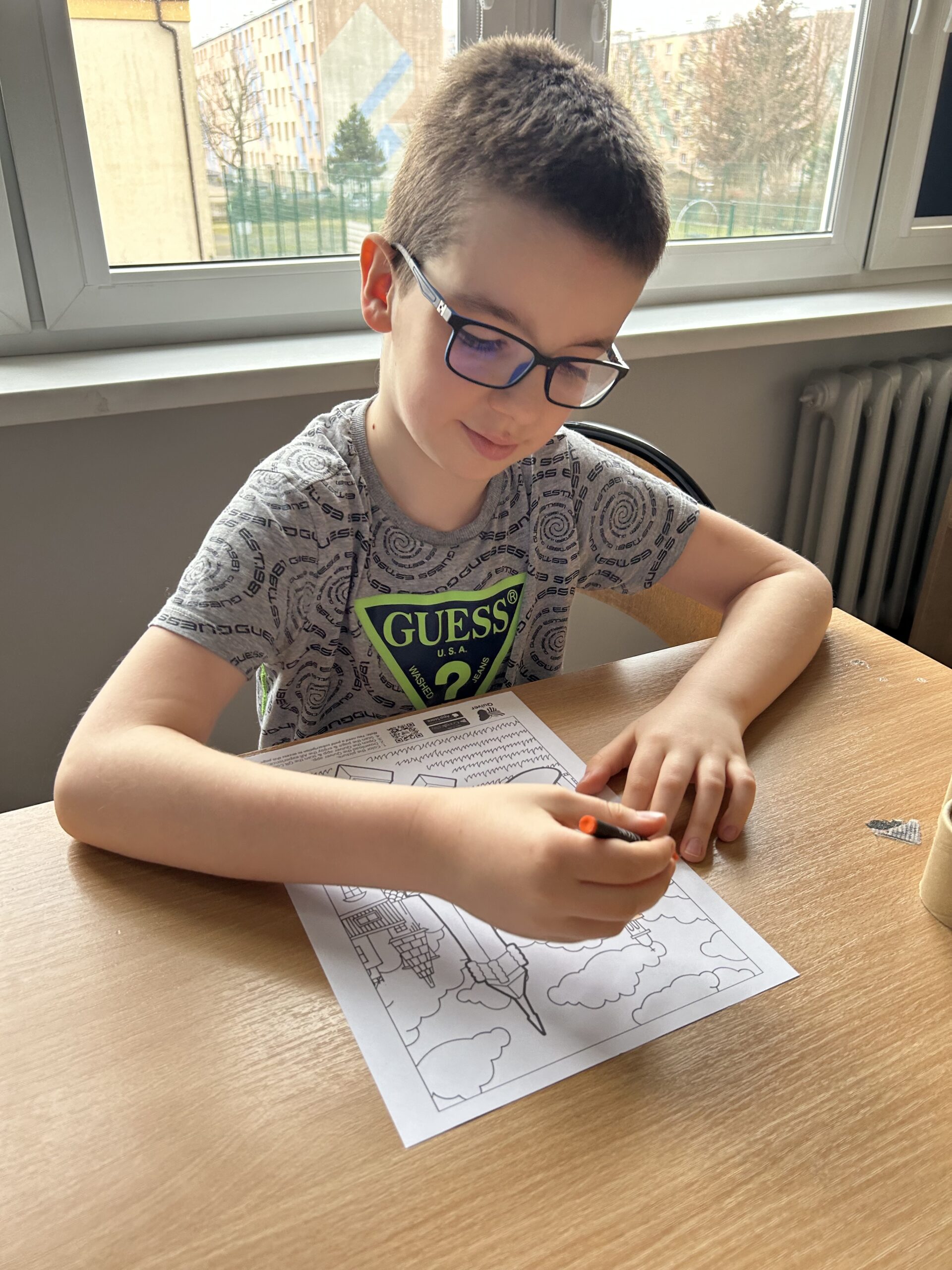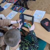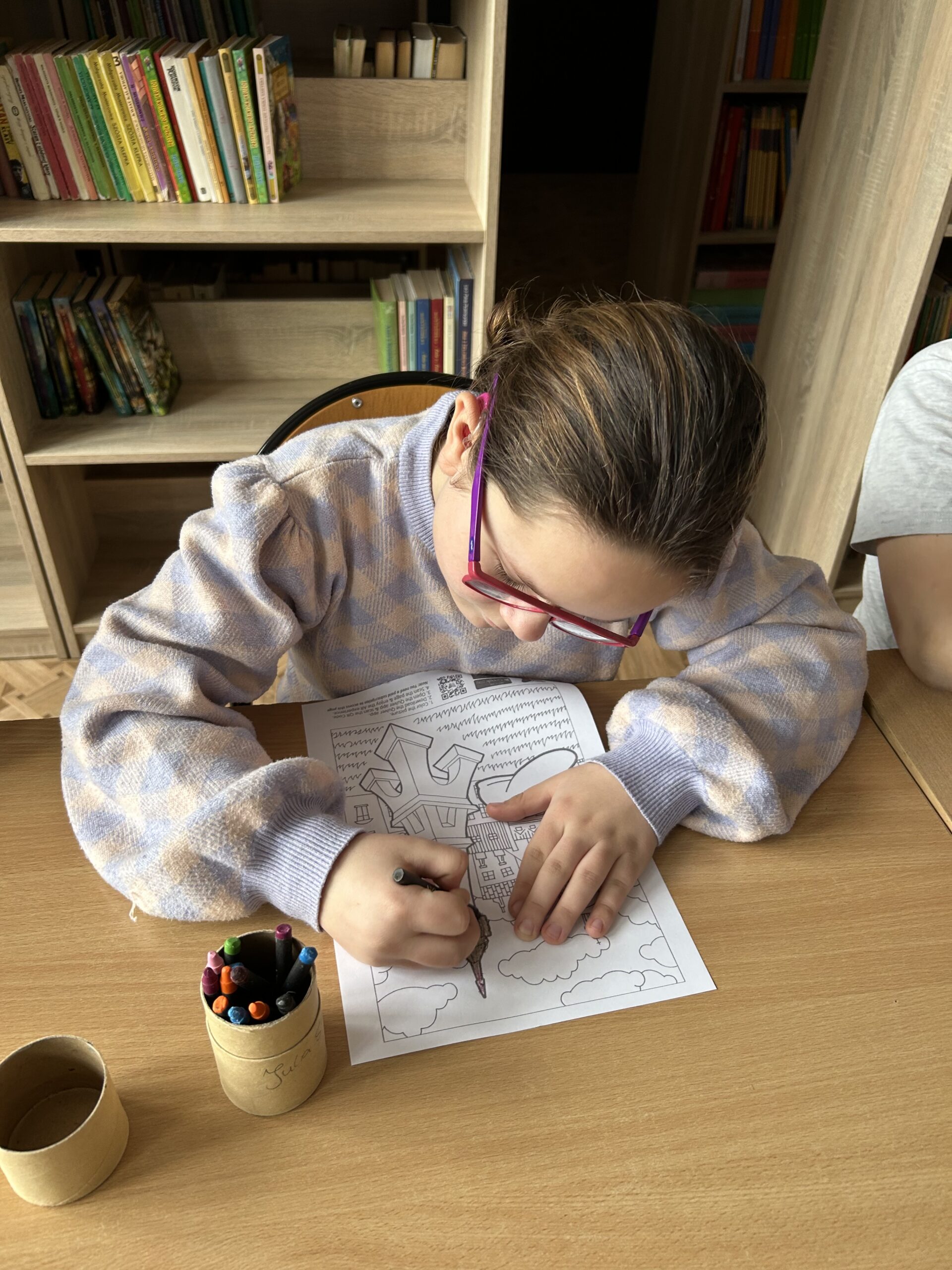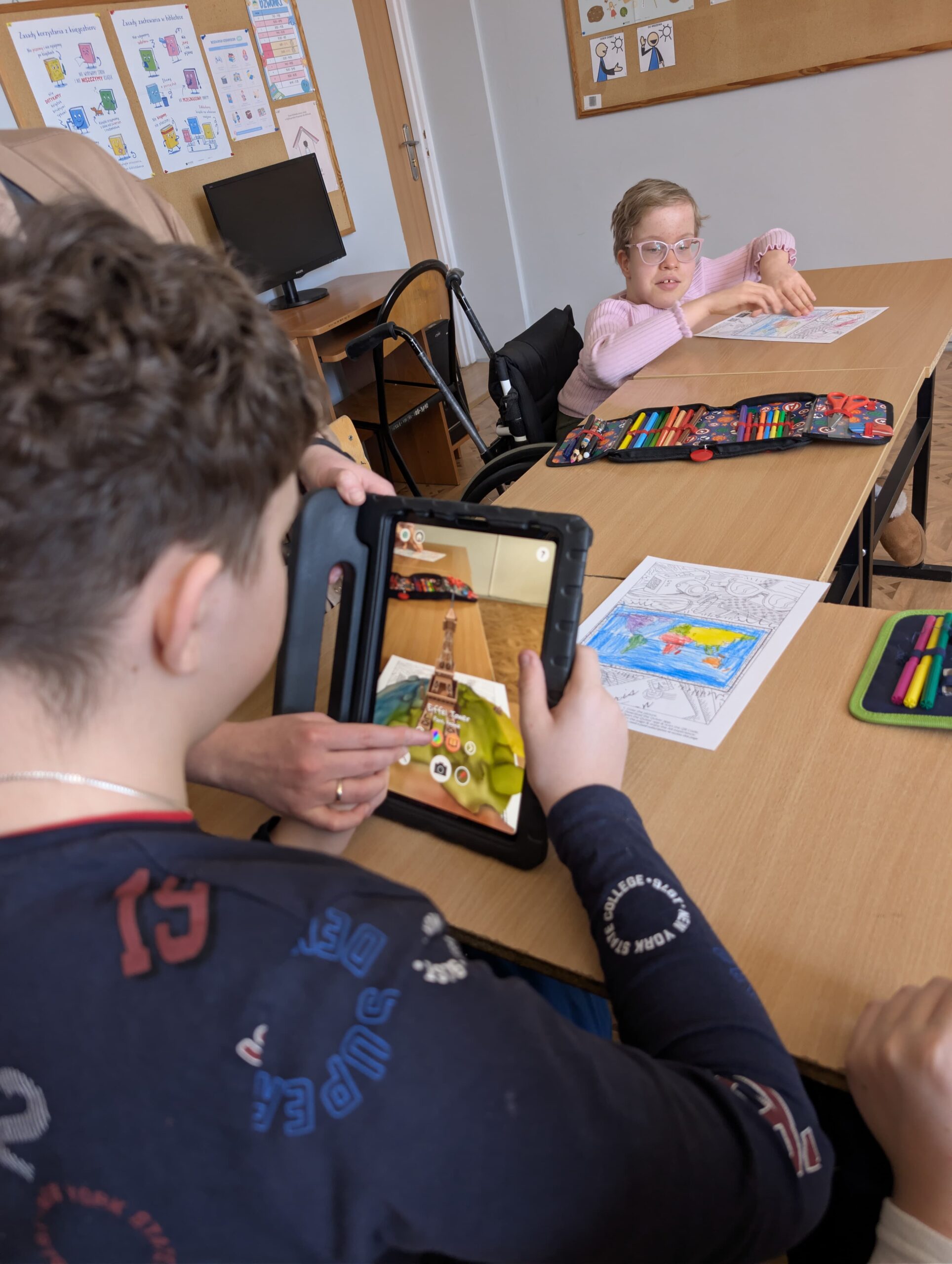 Po części wprowadzającej uczniowie wzięli udział w aktywności plastycznej z wykorzystaniem rozszerzonej rzeczywistości (AR). Kolorowali specjalną kartę przedstawiającą Wieżę Eiffla, a następnie – dzięki aplikacji Quiver – mogli zobaczyć, jak ich praca „ożywa” na ekranie urządzenia w formie trójwymiarowego modelu 3D.