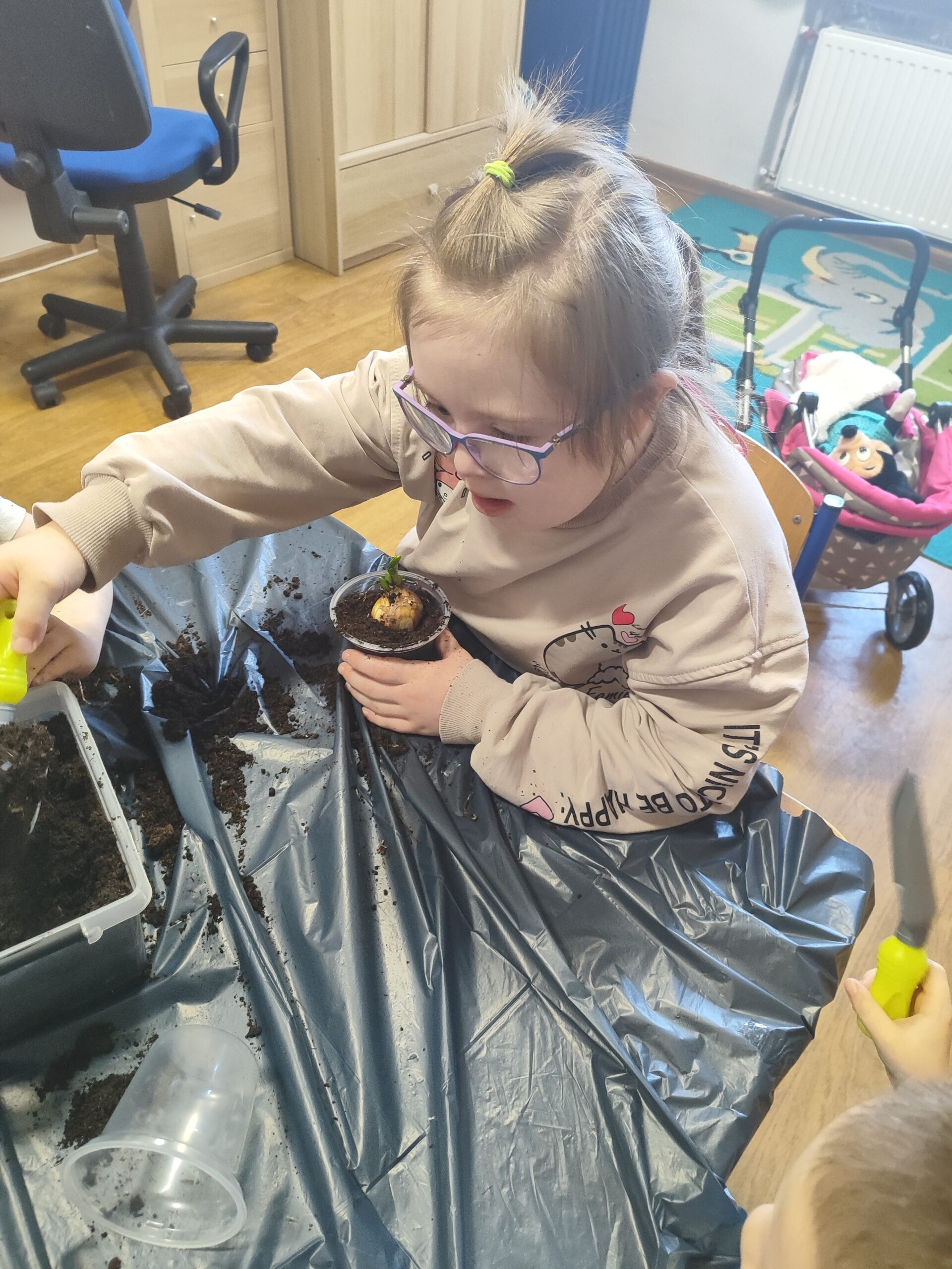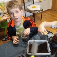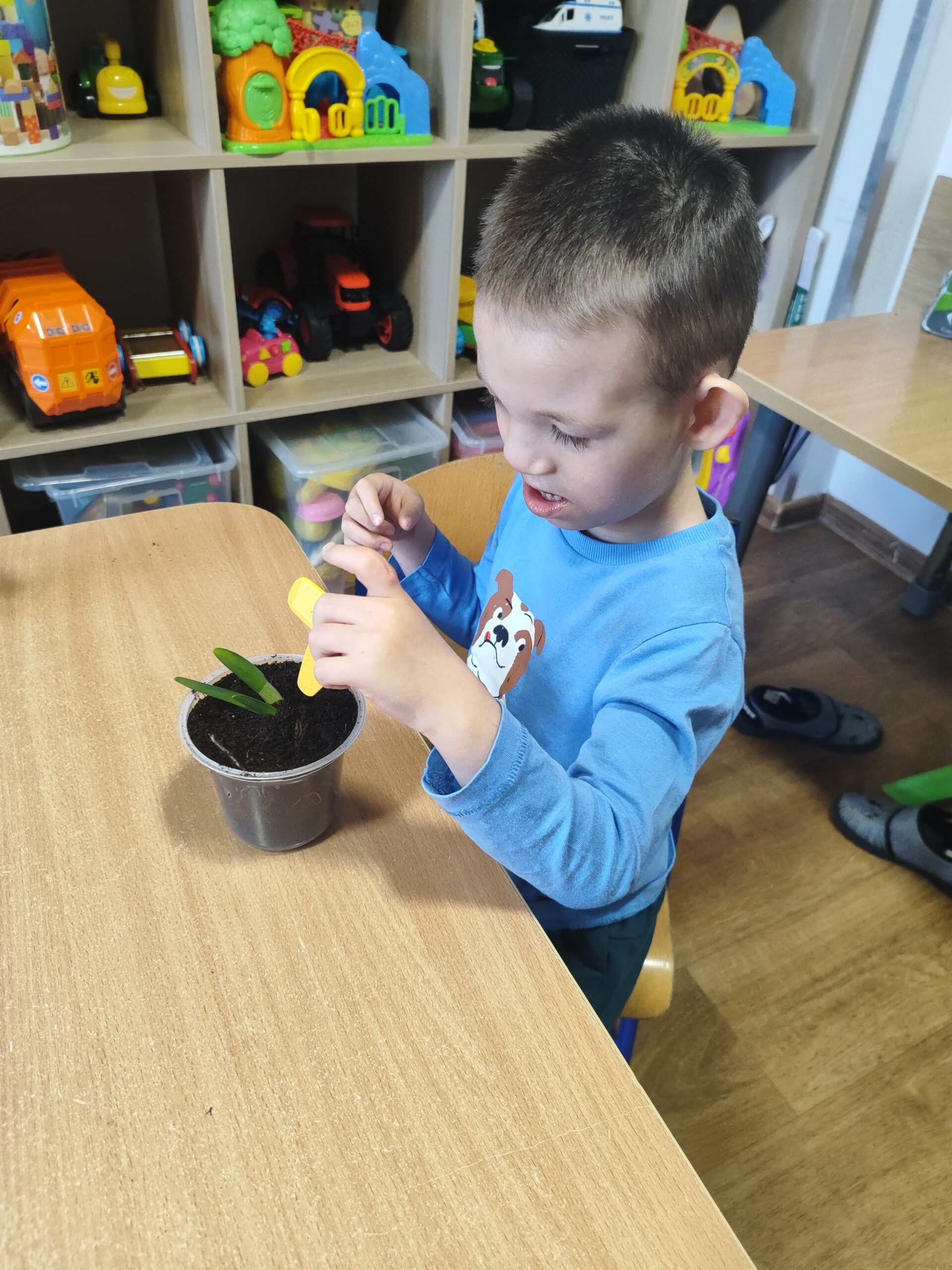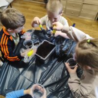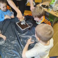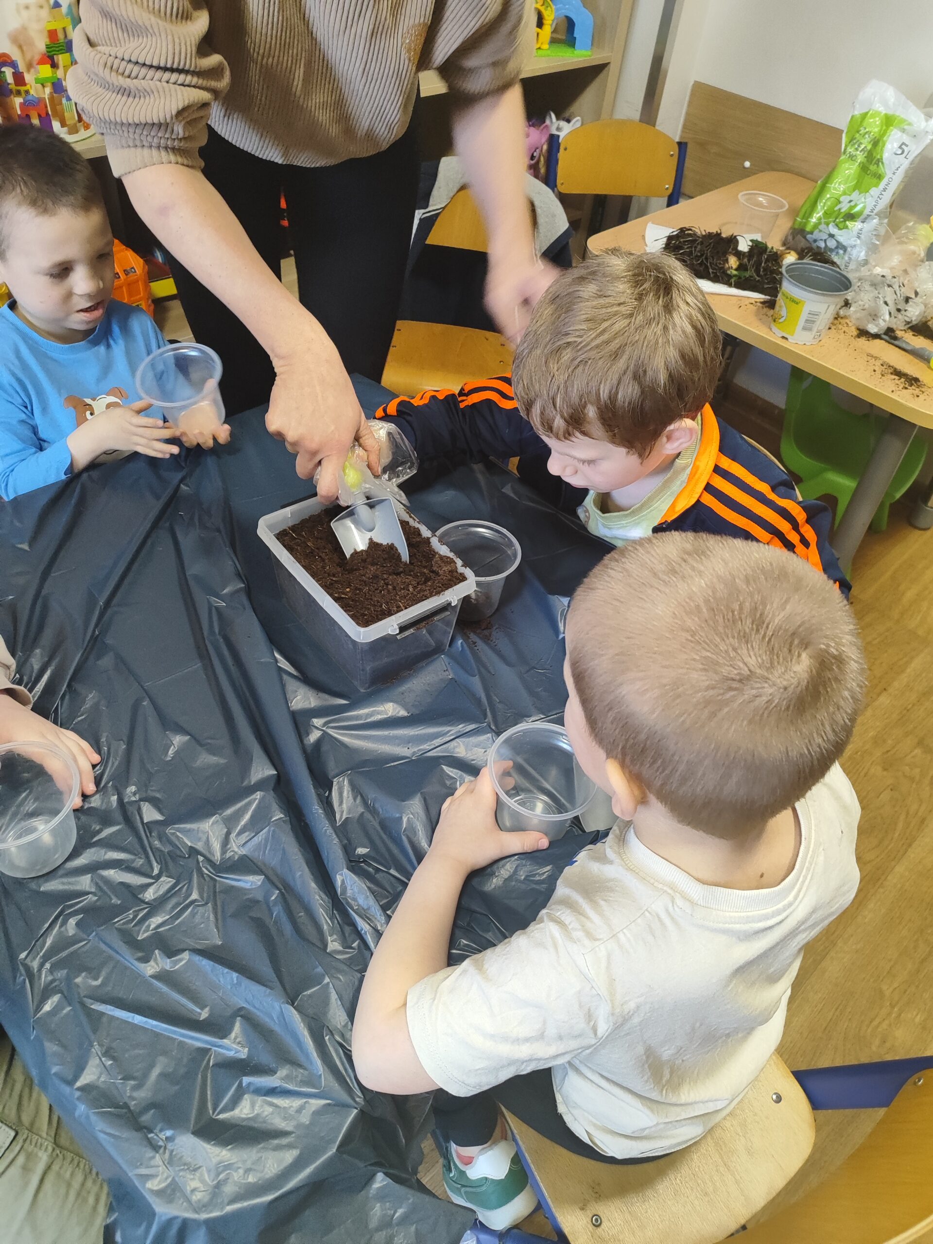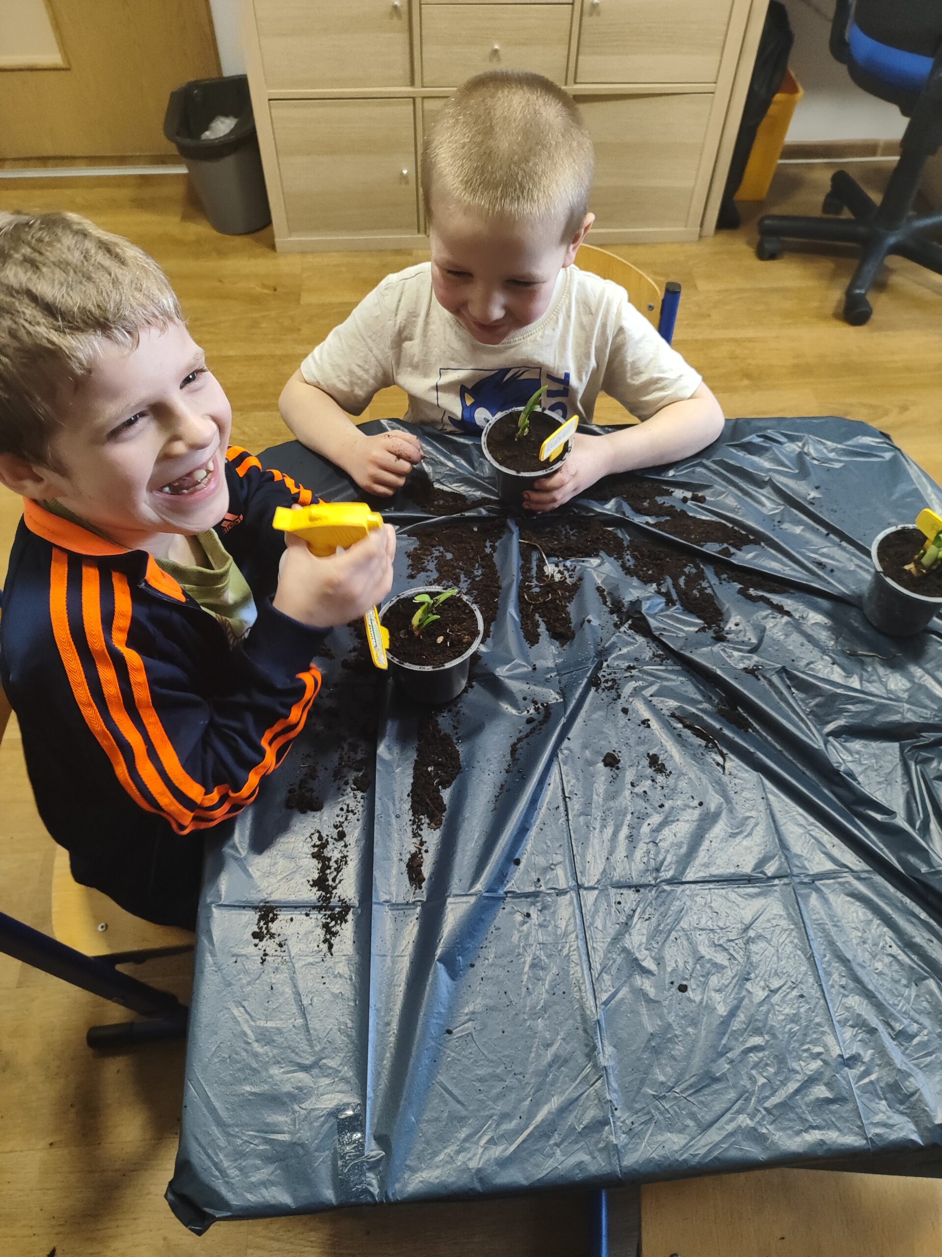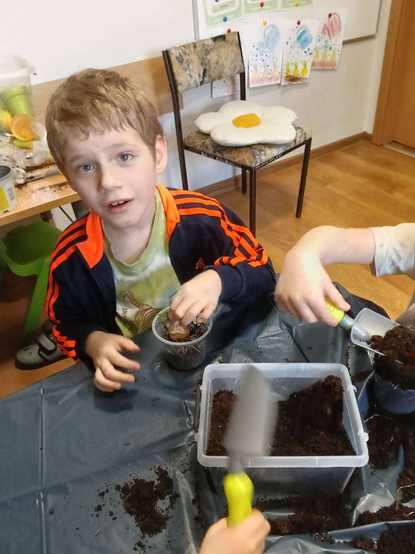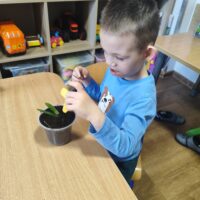 U Tygrysków wiosna zawitała na dobre! W ramach tematu tygodnia nasze przedszkolaki zamieniły się w prawdziwych ogrodników. Dzieci z wielkim zaangażowaniem przygotowały swoje doniczki, starannie nasypując do nich ziemi. Następnie każdy samodzielnie posadził cebulkę narcyza, dbając o to, by znalazła się na odpowiedniej głębokości. Po posadzeniu rośliny zostały spryskane wodą, a w każdej doniczce znalazła się tabliczka z imieniem właściciela. Nasza zielona uprawa dumnie prezentuje się na parapecie w szatni. Teraz przed Tygryskami ważne zadanie – będziemy codziennie podlewać nasze roślinki i z niecierpliwością wypatrywać ich wzrostu. Czekamy na kwiaty!