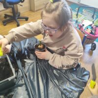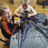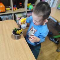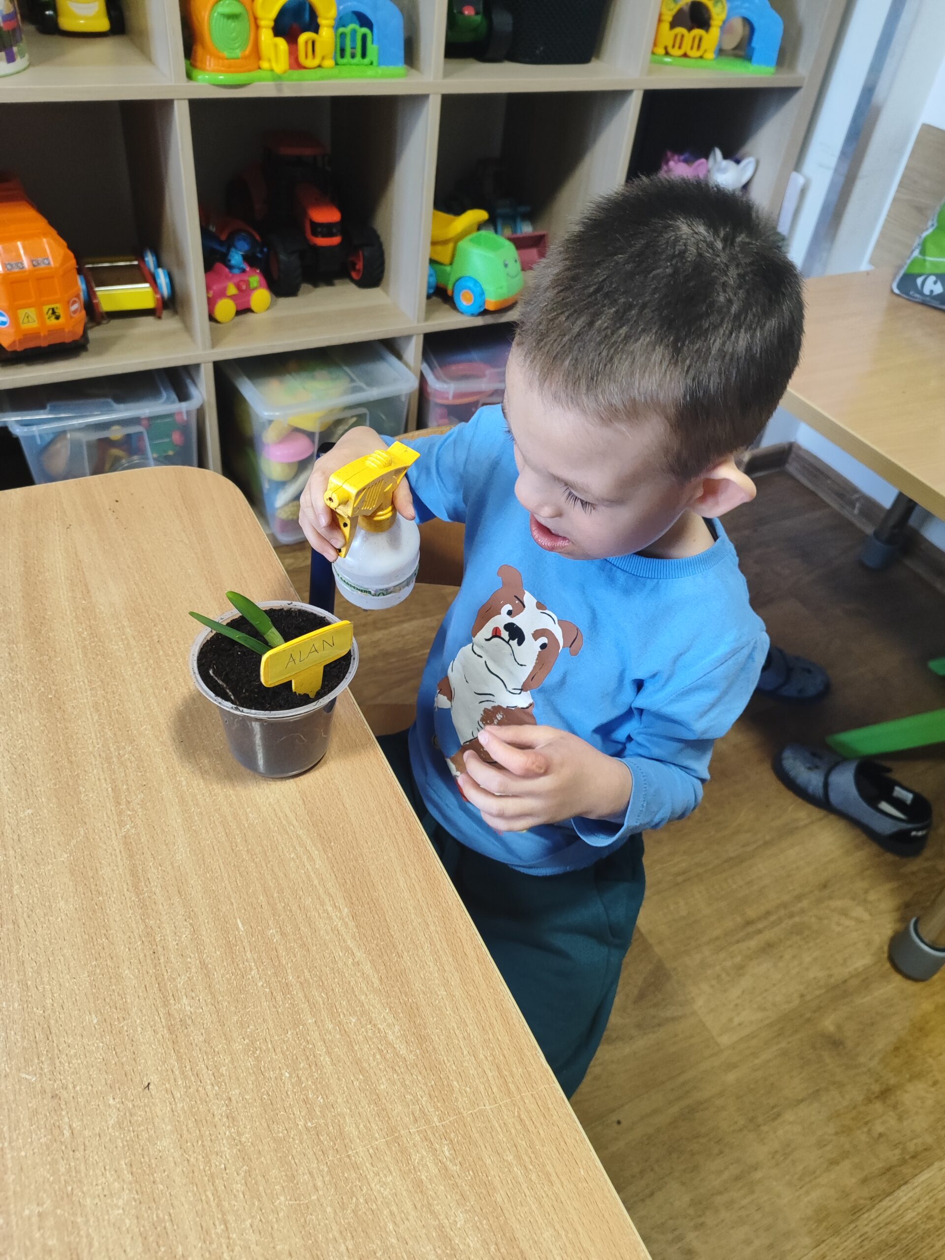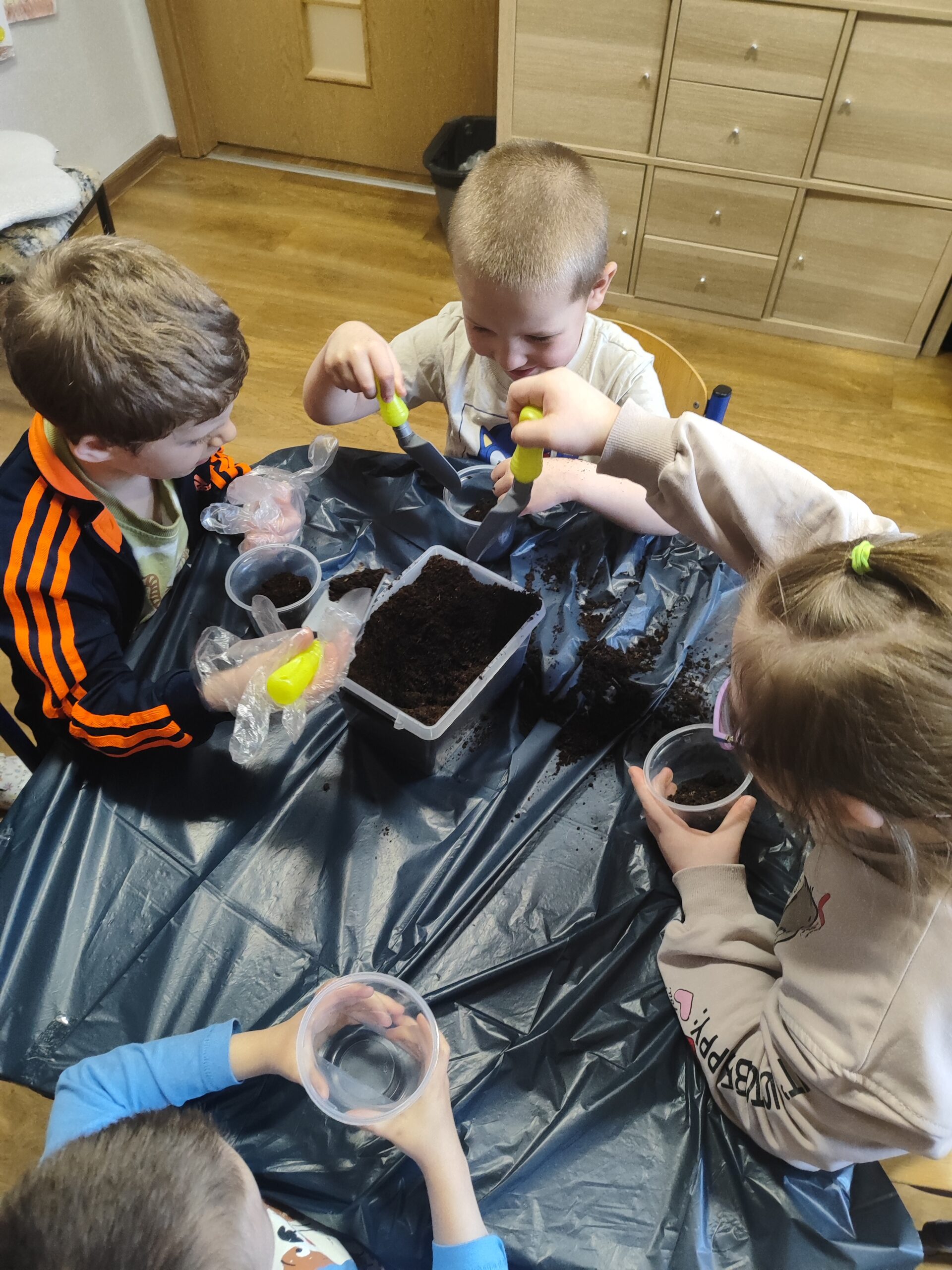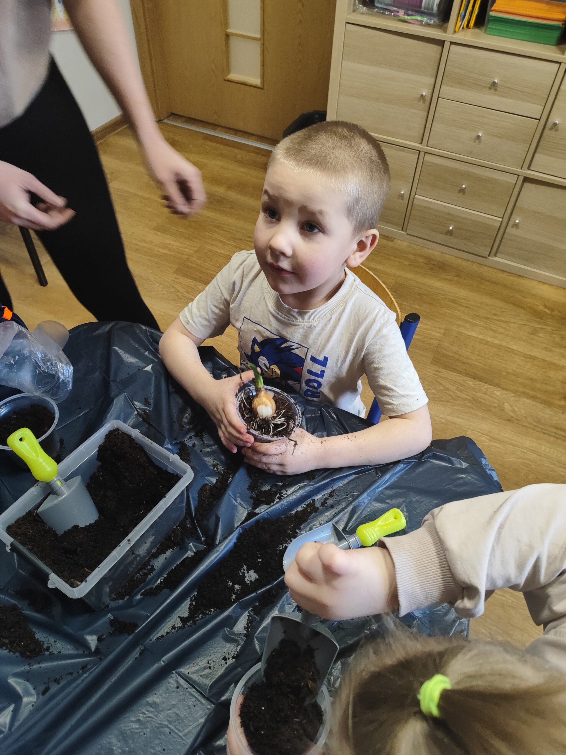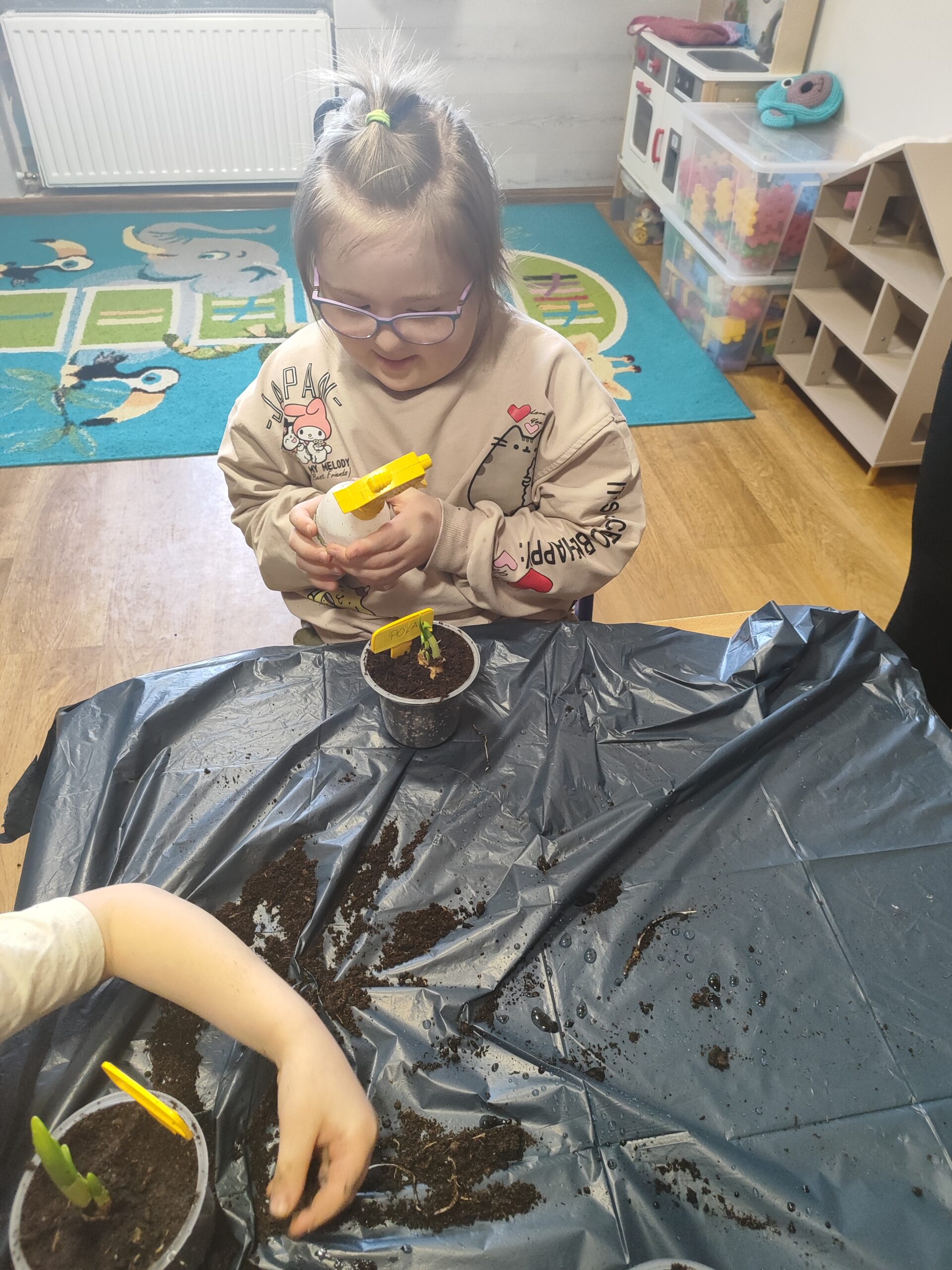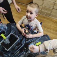 U Tygrysków wiosna zawitała na dobre! W ramach tematu tygodnia nasze przedszkolaki zamieniły się w prawdziwych ogrodników. Dzieci z wielkim zaangażowaniem przygotowały swoje doniczki, starannie nasypując do nich ziemi. Następnie każdy samodzielnie posadził cebulkę narcyza, dbając o to, by znalazła się na odpowiedniej głębokości. Po posadzeniu rośliny zostały spryskane wodą, a w każdej doniczce znalazła się tabliczka z imieniem właściciela. Nasza zielona uprawa dumnie prezentuje się na parapecie w szatni. Teraz przed Tygryskami ważne zadanie – będziemy codziennie podlewać nasze roślinki i z niecierpliwością wypatrywać ich wzrostu. Czekamy na kwiaty!