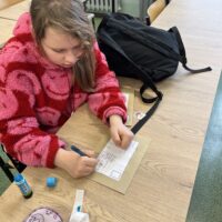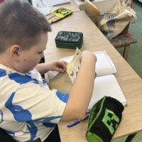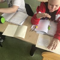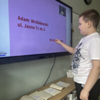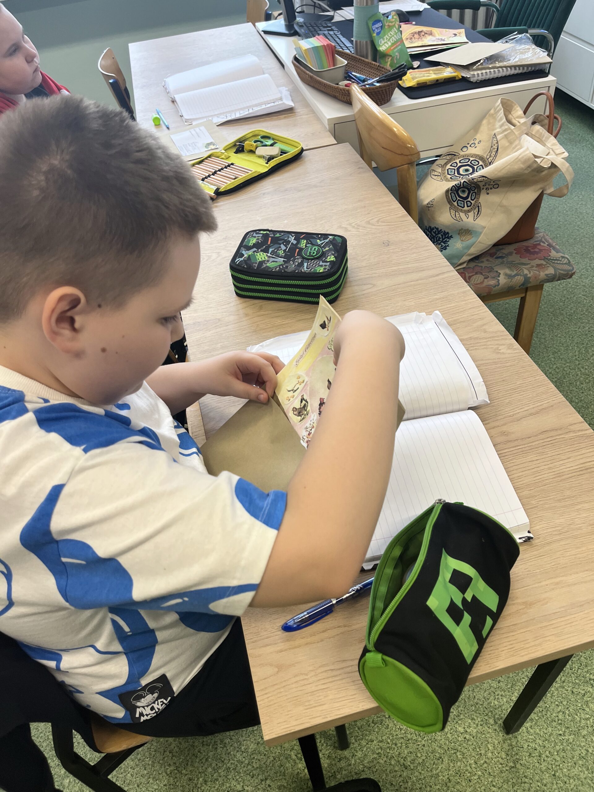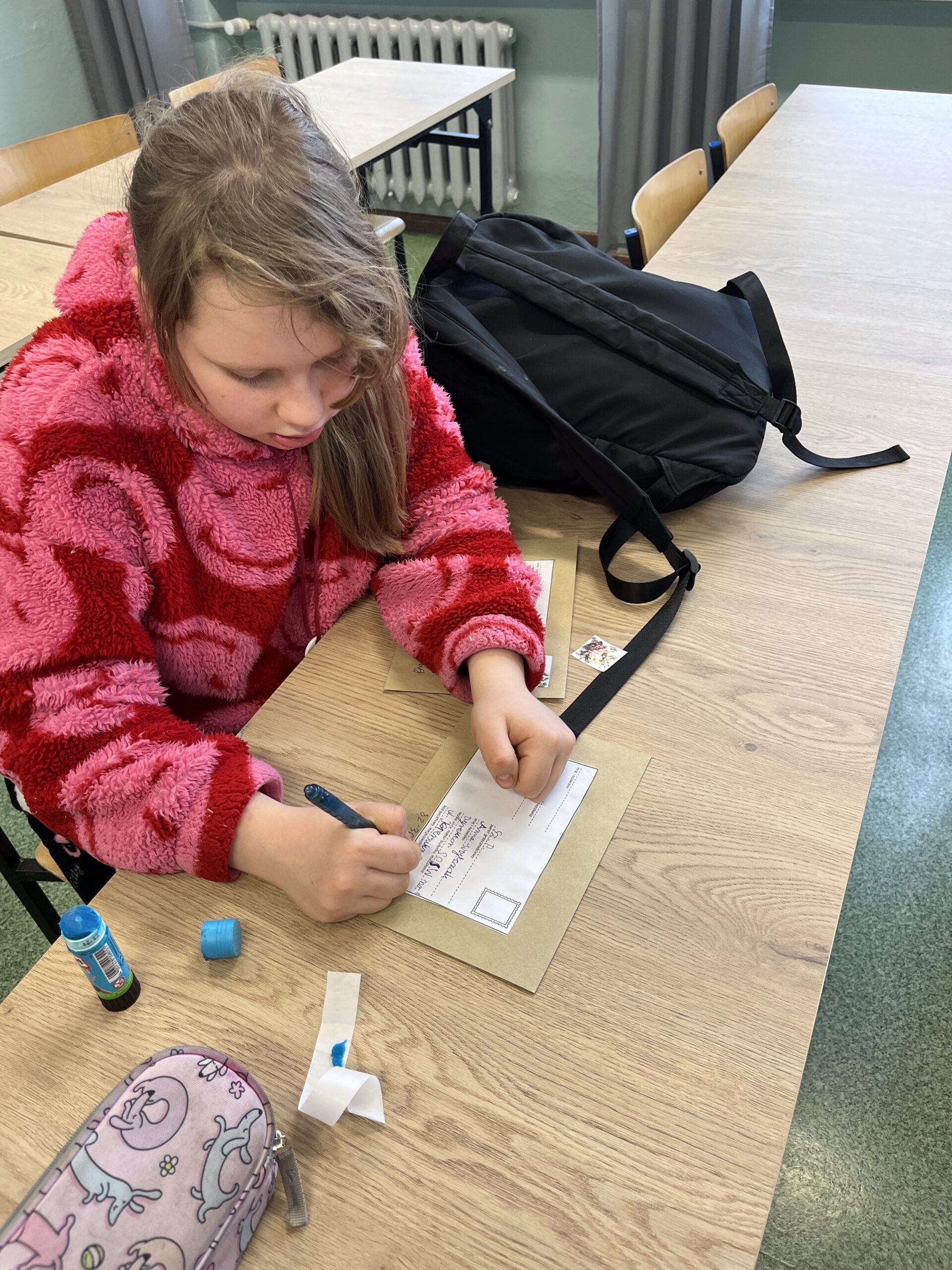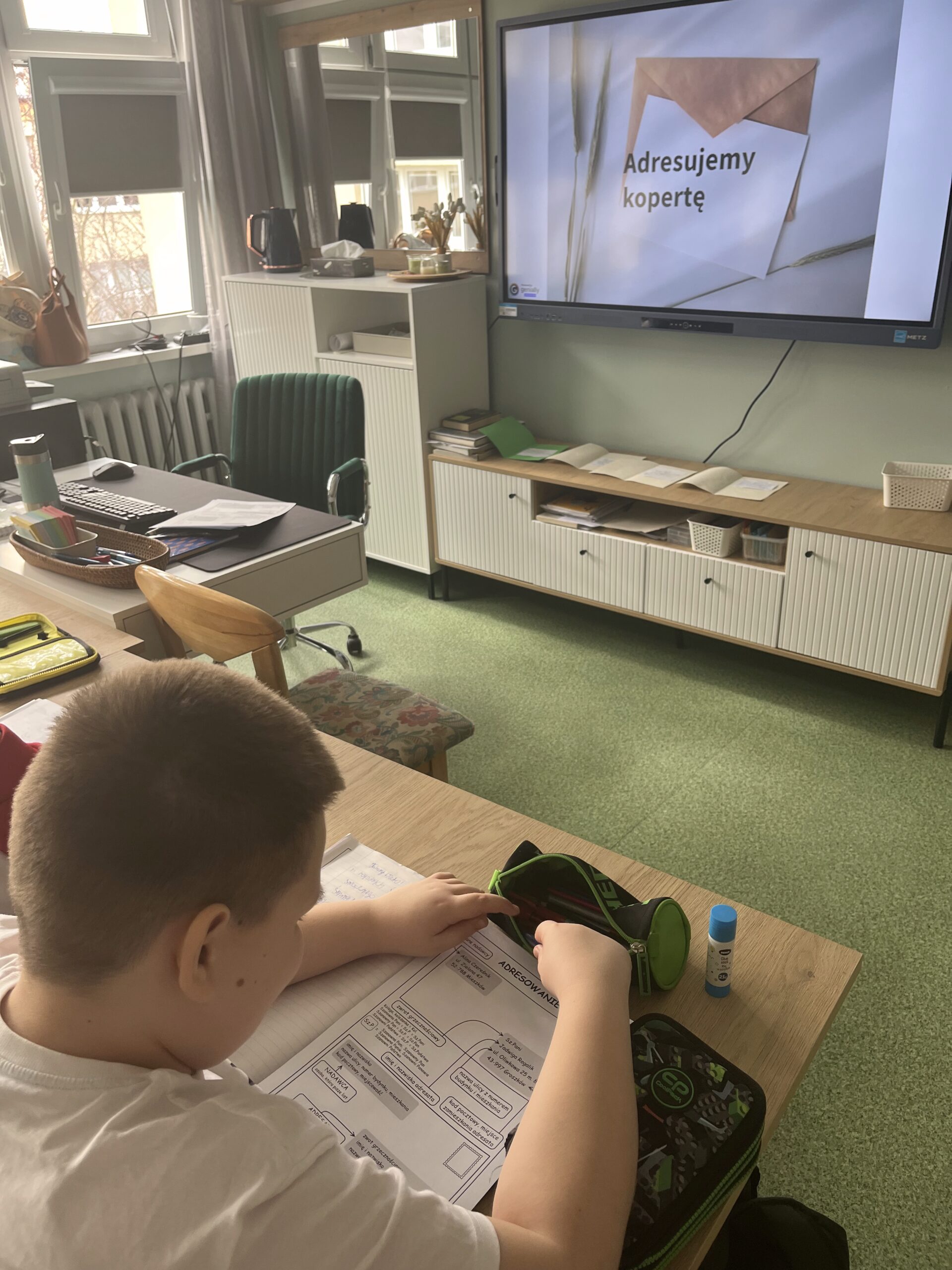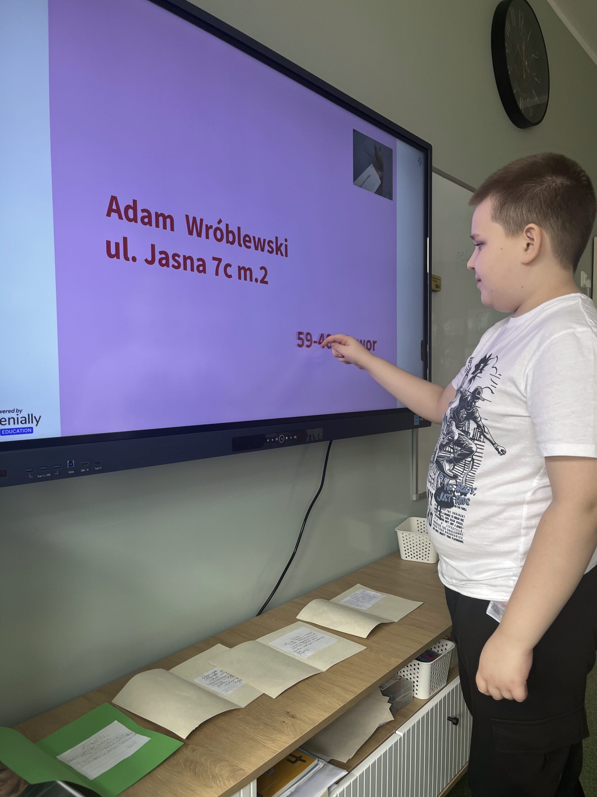 Kolejnym etapem zajęć była nauka poprawnego adresowania kopert. Uczniowie dowiedzieli się, w jaki sposób należy zapisać dane adresata oraz gdzie umieścić poszczególne elementy adresu.