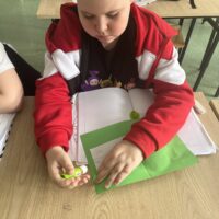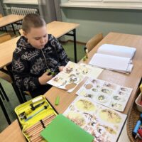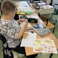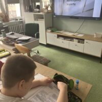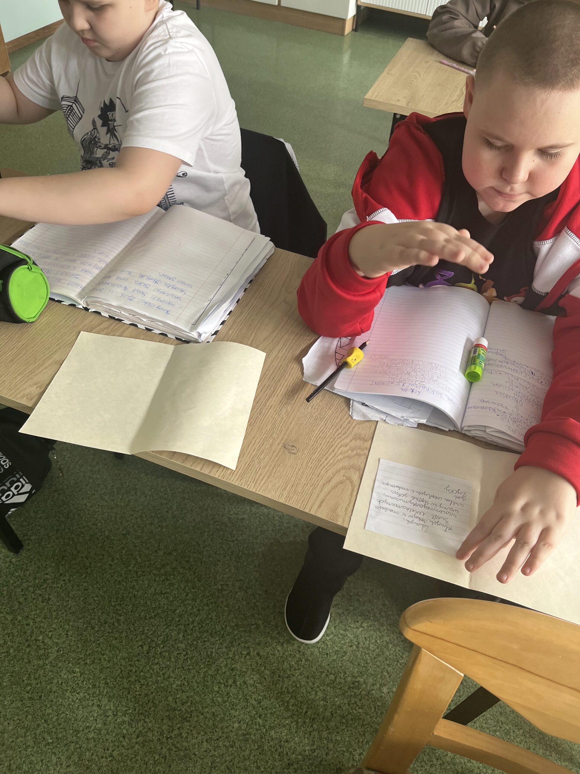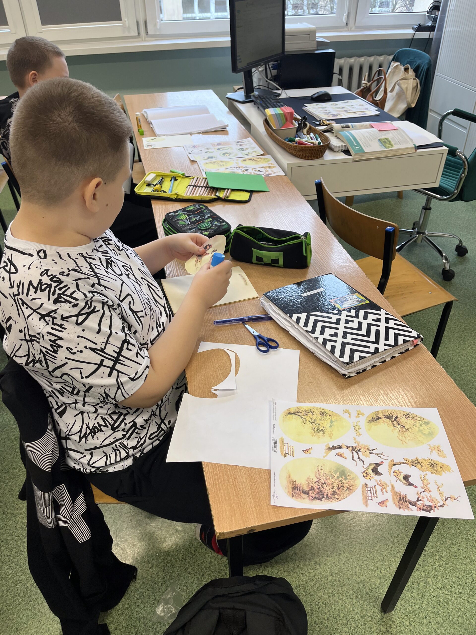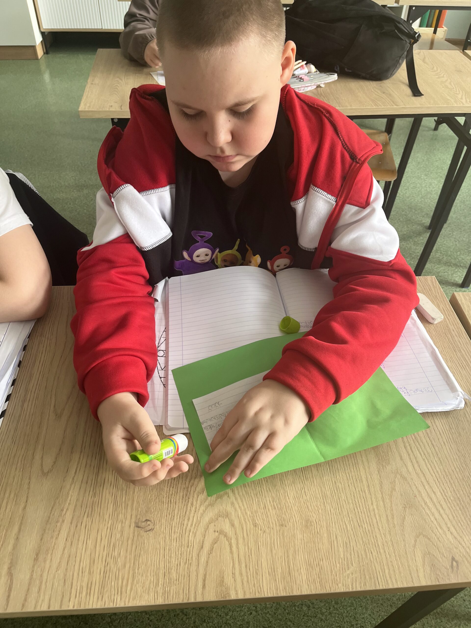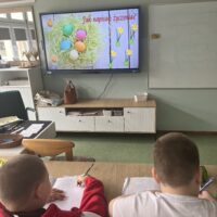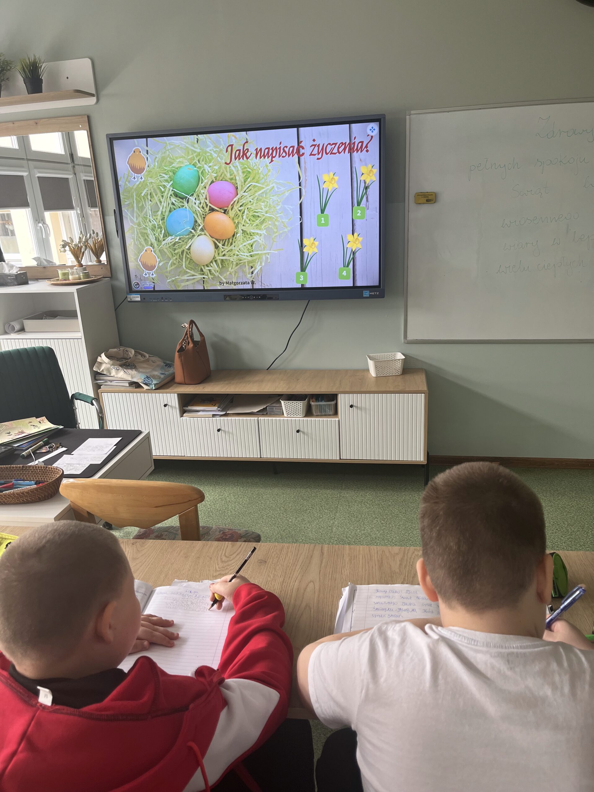 Na lekcji języka polskiego uczniowie klasy 4 a ćwiczyli układanie życzeń świątecznych, zwracając uwagę na ich formę oraz uprzejmy i serdeczny charakter. Każdy uczeń przygotował własną kartkę wielkanocną – samodzielnie zaprojektowaną i ozdobioną. Na kartkach znalazły się ułożone przez uczniów życzenia.