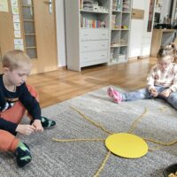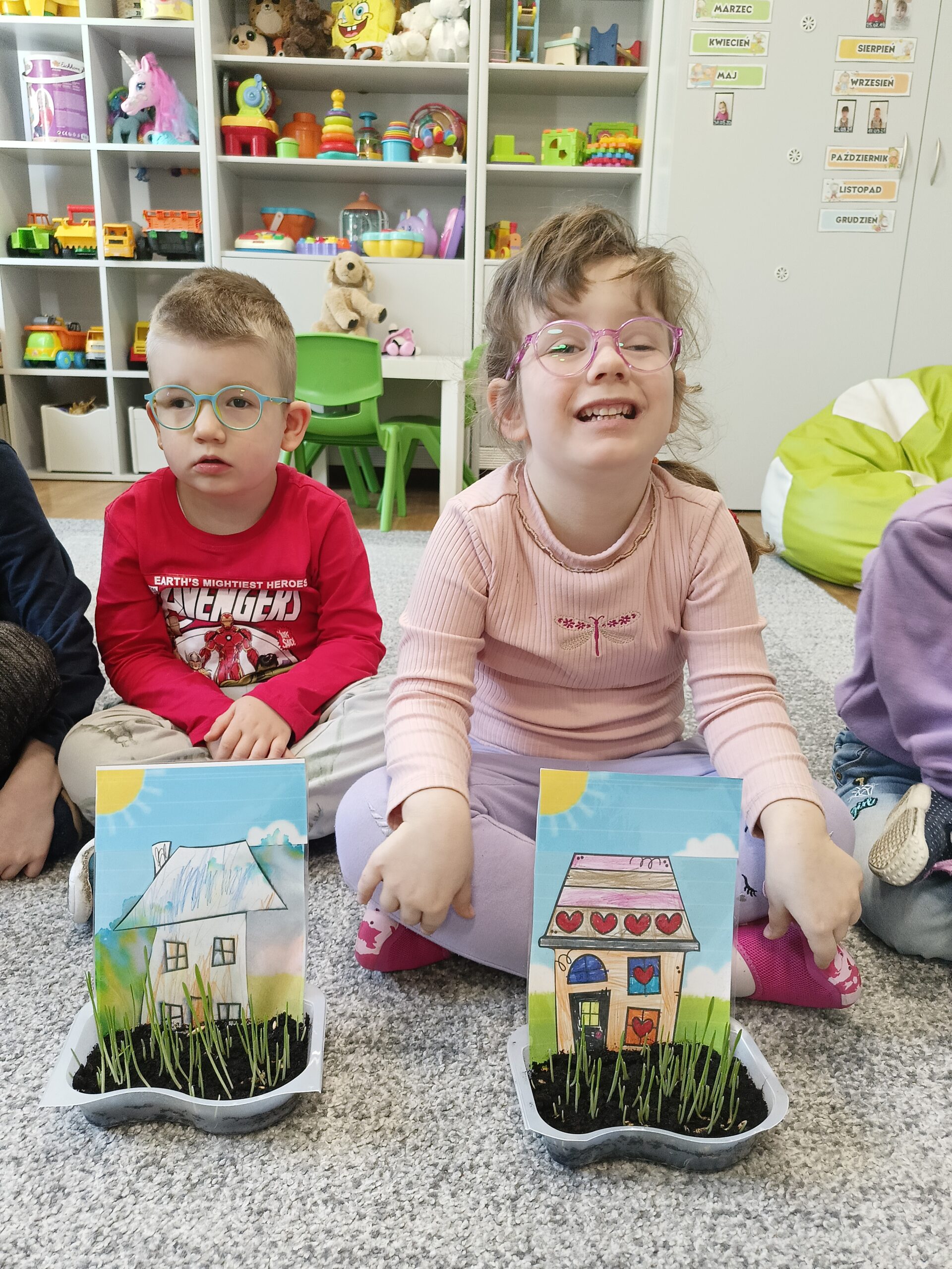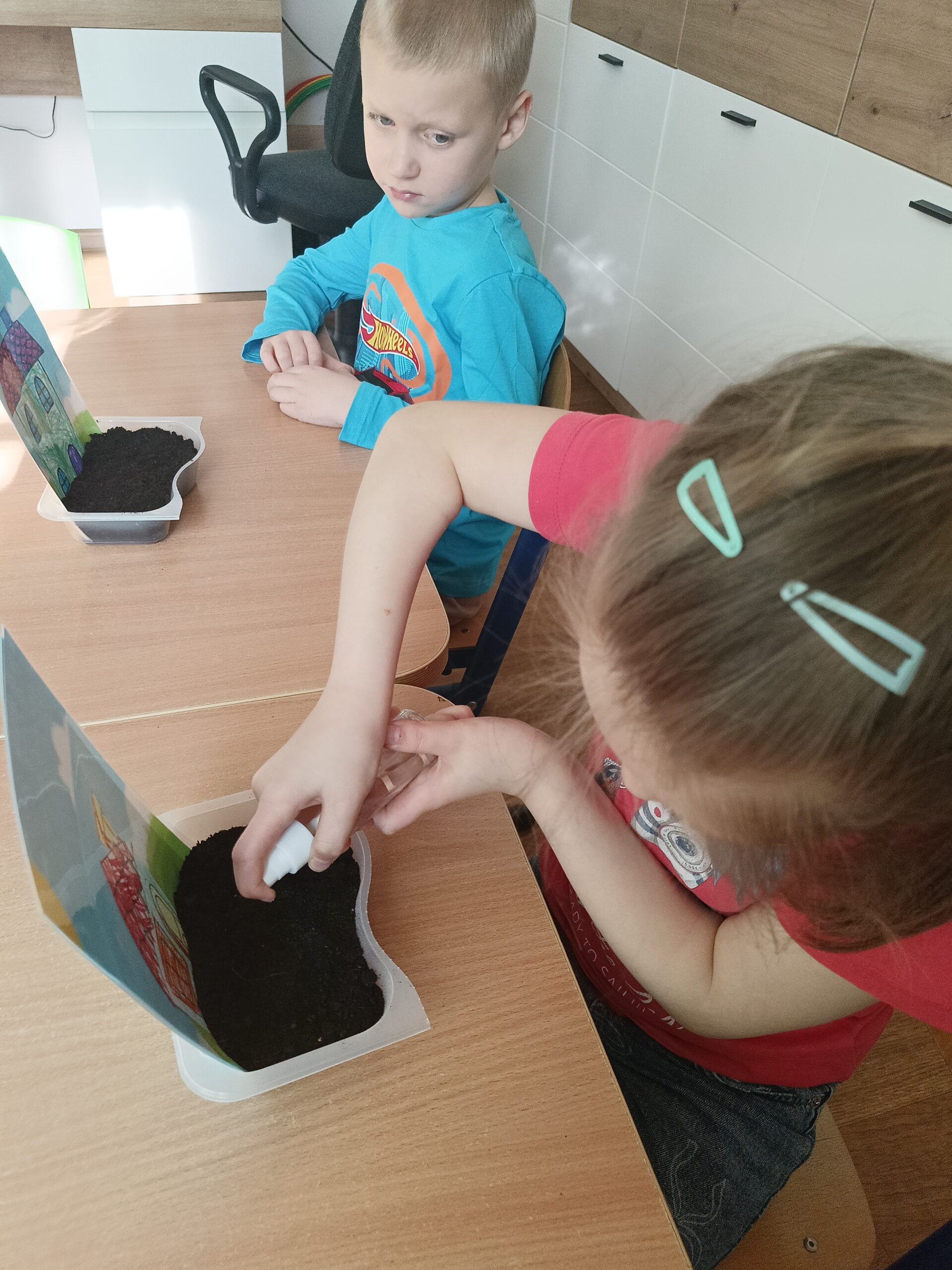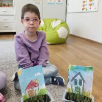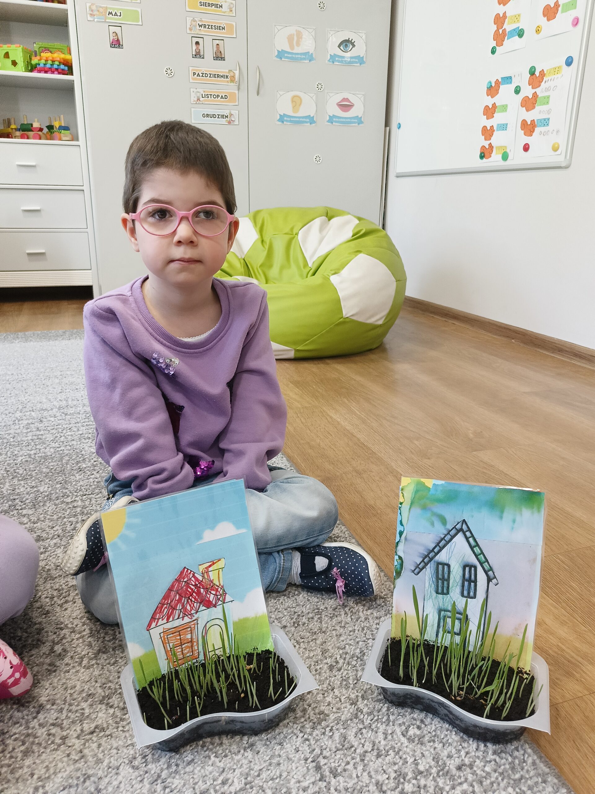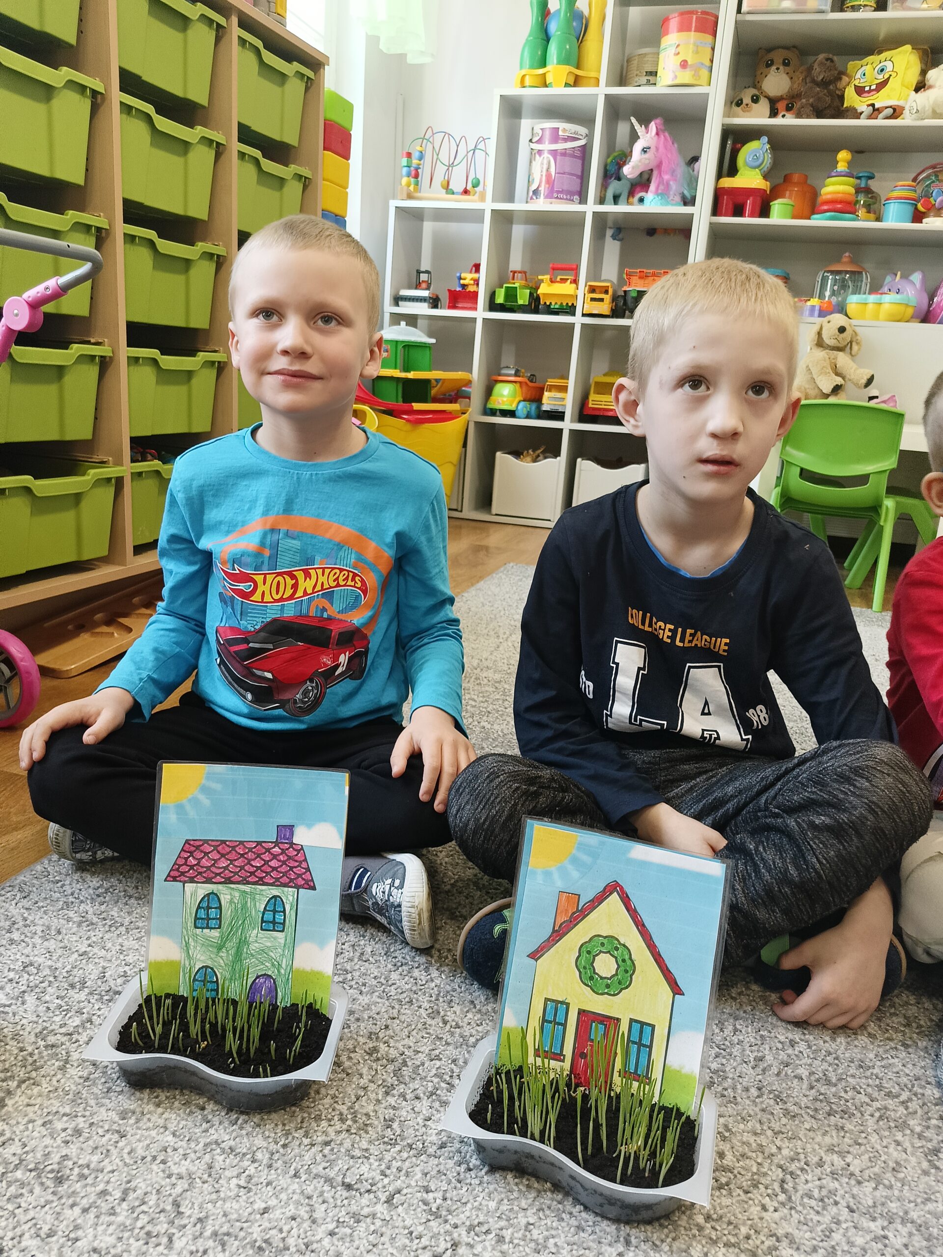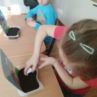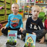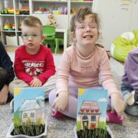 Dzieci z grupy Waleczne Pszczółki założyły w sali zielony kącik. Najpierw przygotowały doniczki- wysłały do niej ziemię, nasiona. Pomalowały domki, którymi ozdobiły kącik przyrodniczy. Przez cały tydzień dzieci dbały o swoje ” ogródki”, obserwowały jak rośnie trawa. Zielony kącik przyniósł dzieciom wiele radości.