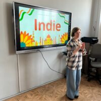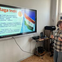 Następnie uczestnicy obejrzeli prezentację multimedialną przygotowaną w ramach projektu, dzięki której poznali podstawowe informacje o Indiach – ich położenie, przyrodę oraz wybrane elementy kultury. Uzupełnieniem zajęć był krótki film edukacyjny przedstawiający historię powstania Tadż Mahal.