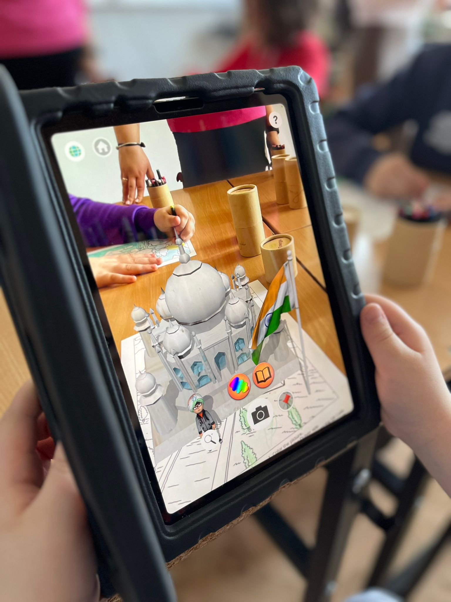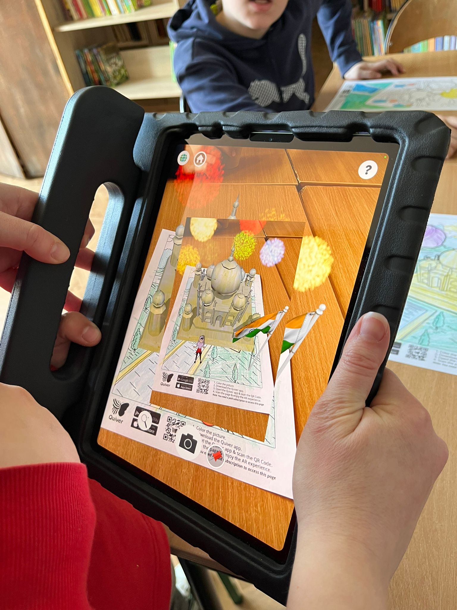 W części praktycznej uczniowie kolorowali ilustrację przedstawiającą Tadż Mahal – jeden z najbardziej znanych zabytków świata. Następnie, z wykorzystaniem aplikacji Quiver, obserwowali efekt swojej pracy w rozszerzonej rzeczywistości – model zabytku pojawiał się w wersji trójwymiarowej.