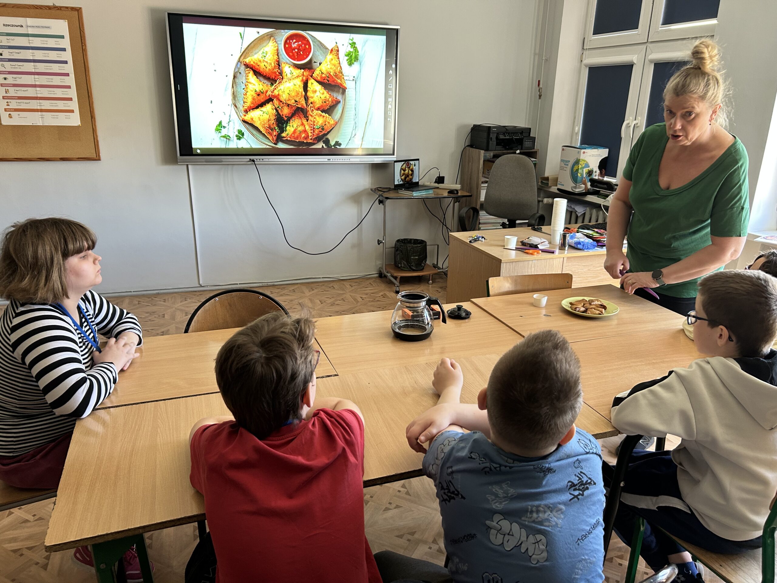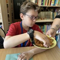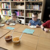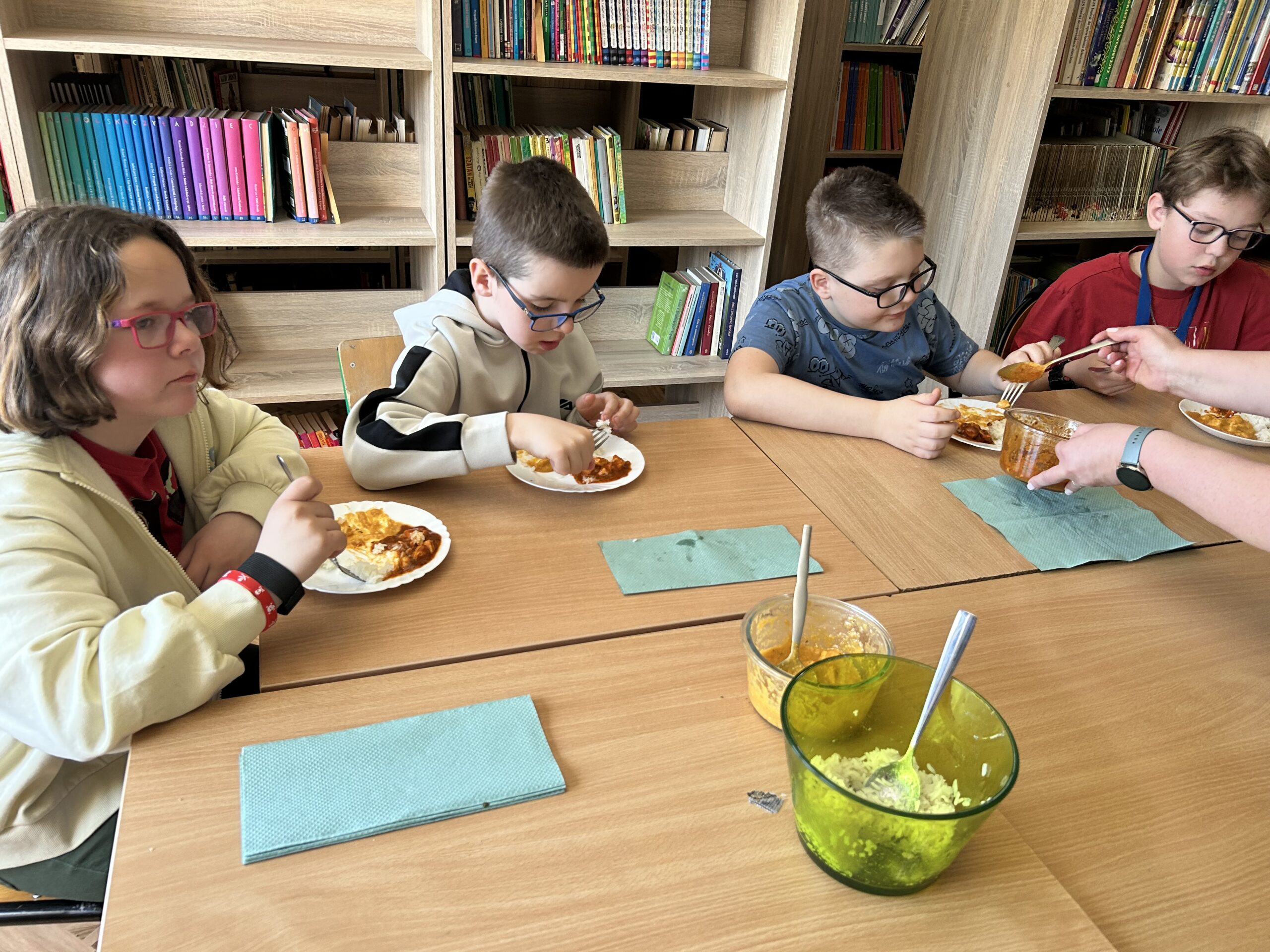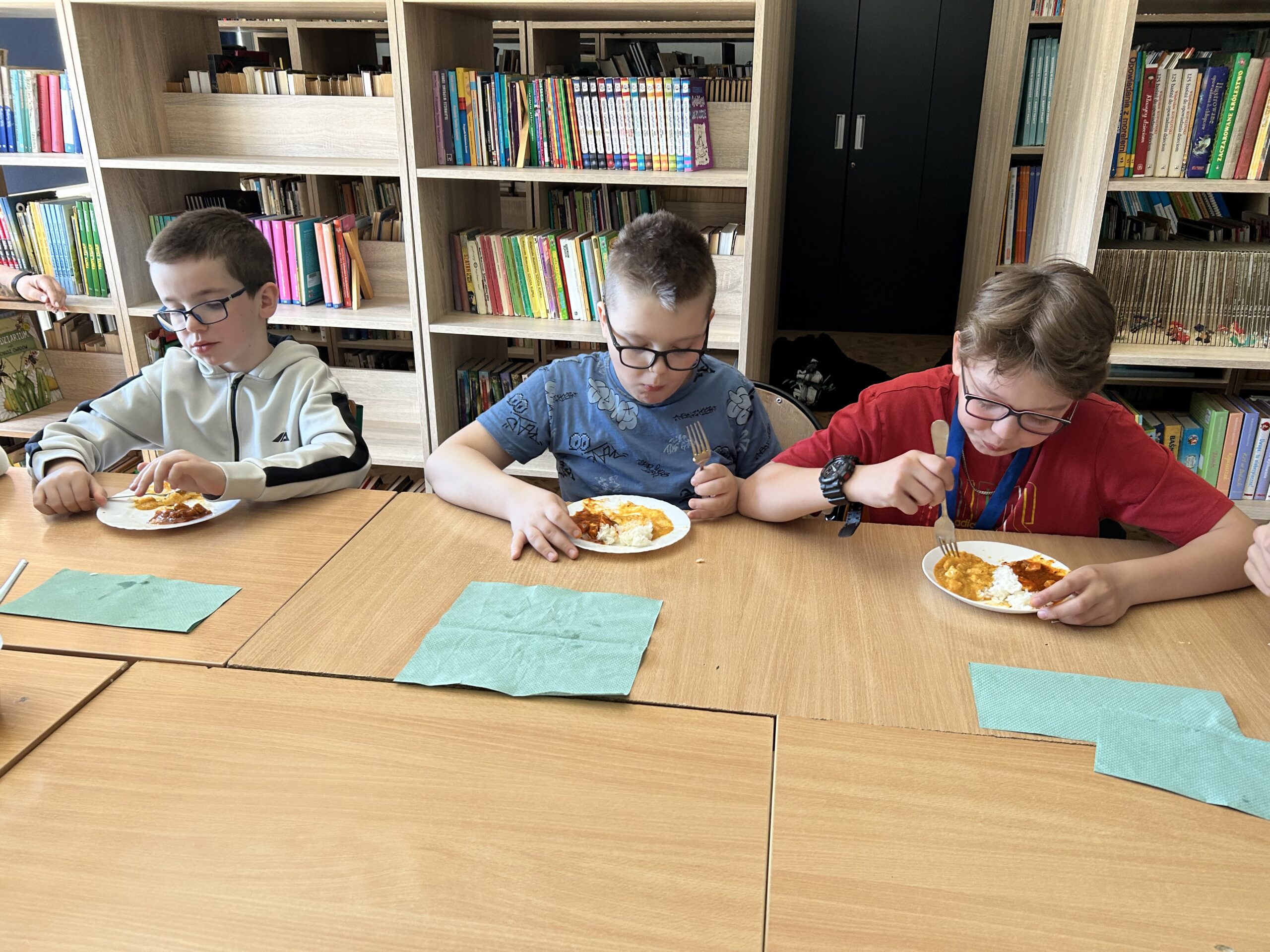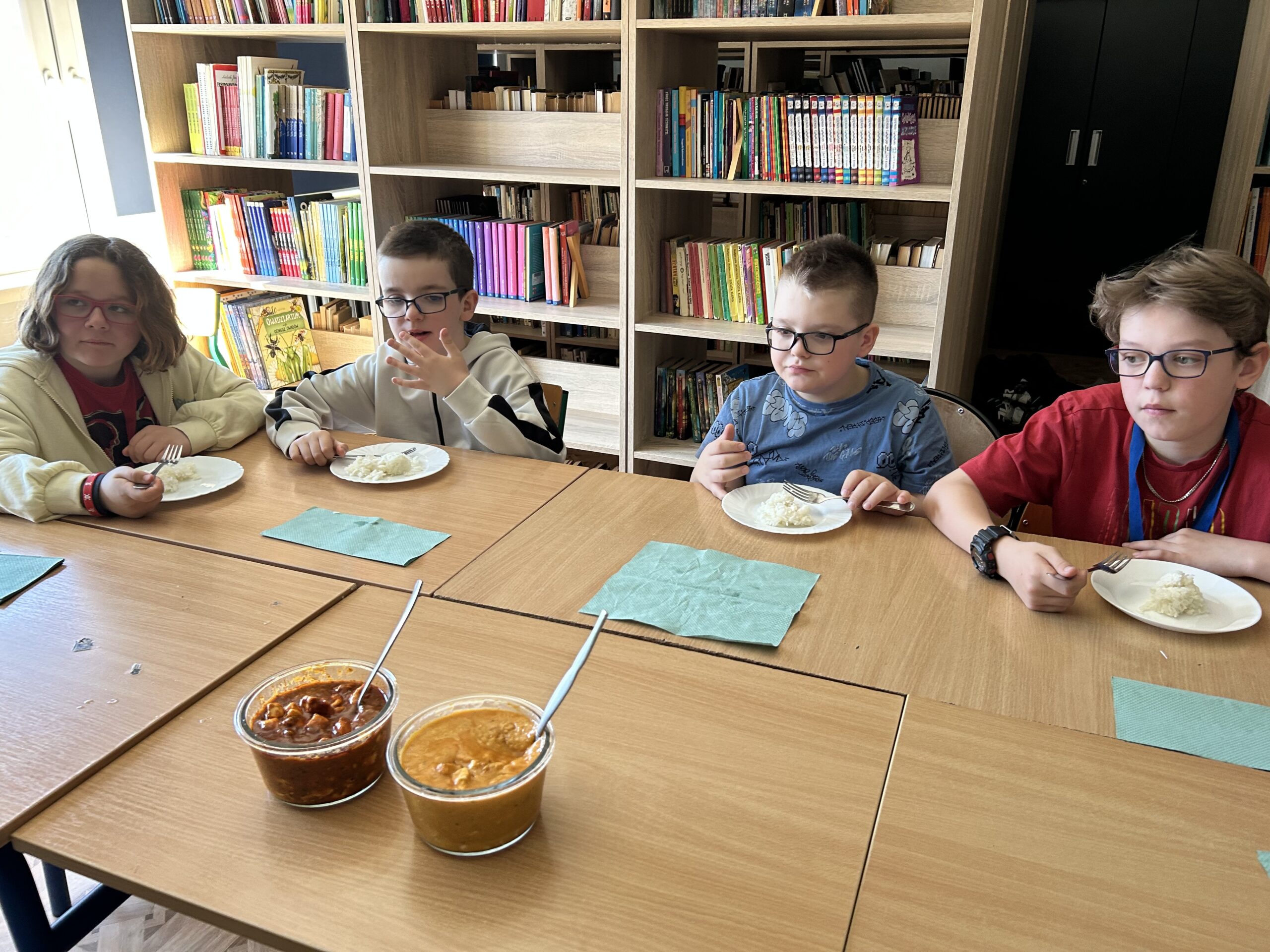 Nie zabrakło także degustacji. Uczniowie spróbowali dań inspirowanych kuchnią indyjską, takich jak ryż jaśminowy, kurczak curry (chicken curry) oraz chicken tikka masala. Poznali również samosy – trójkątne, chrupiące pierożki z nadzieniem, będące jedną z najpopularniejszych przekąsek kuchni indyjskiej.