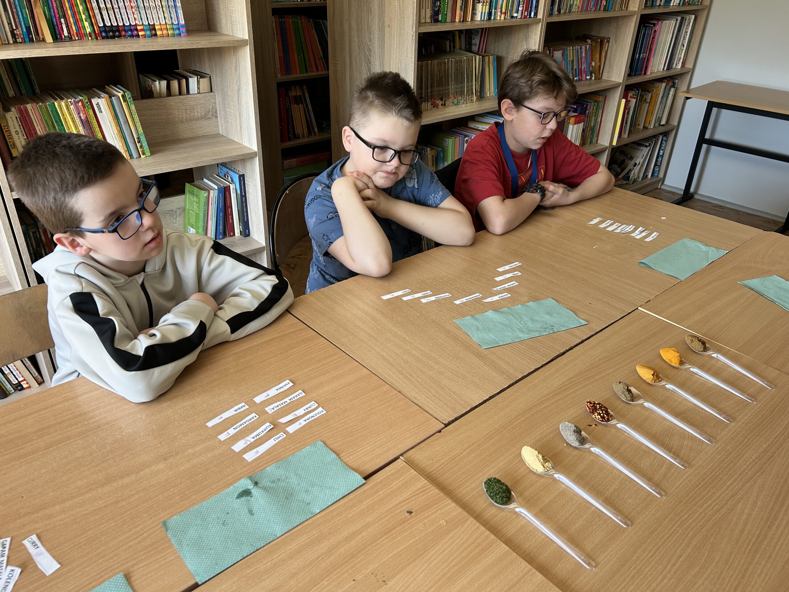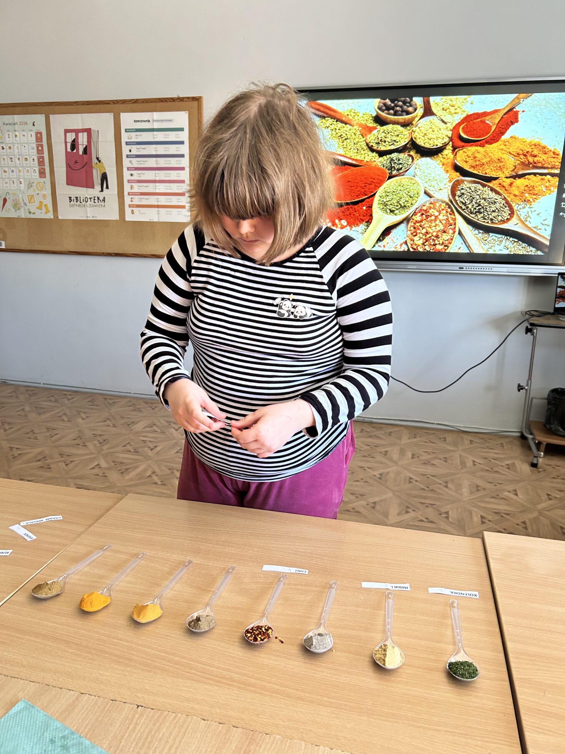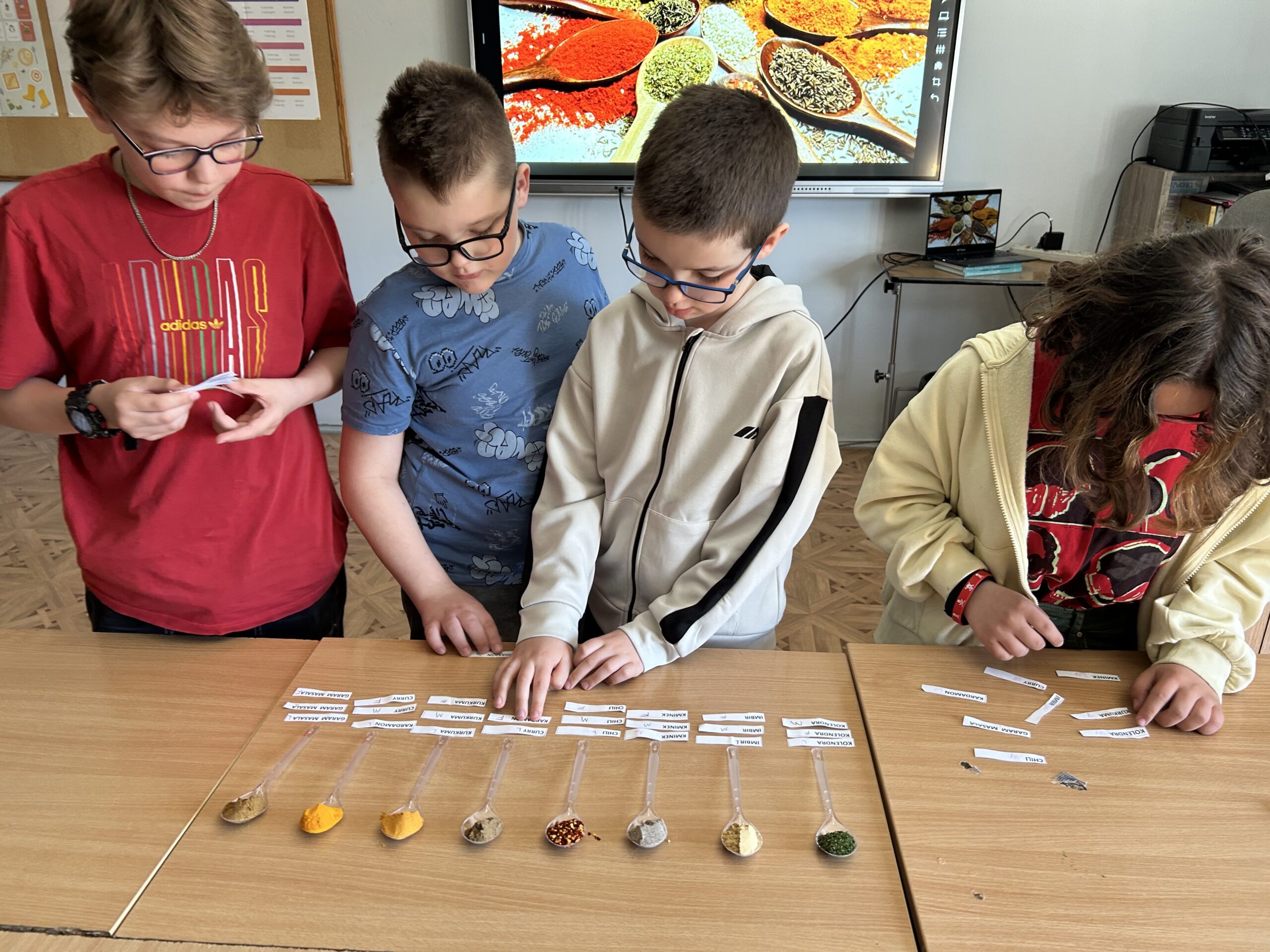 Centralnym punktem spotkania była kuchnia indyjska – intensywna, aromatyczna i różnorodna. Uczniowie pracowali z przyprawami, które stanowią jej podstawę. Rozpoznawali zapachy i dopasowywali nazwy do konkretnych próbek przygotowanych na łyżeczkach. Wśród nich znalazły się m.in.: kurkuma, kumin (kmin rzymski), kolendra, papryka chili, imbir, kardamon oraz mieszanka garam masala. Zadanie angażowało zmysł węchu, rozwijało uważność i sprzyjało zapamiętywaniu nowych pojęć.