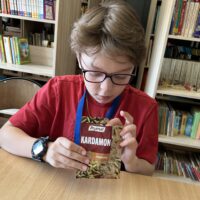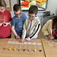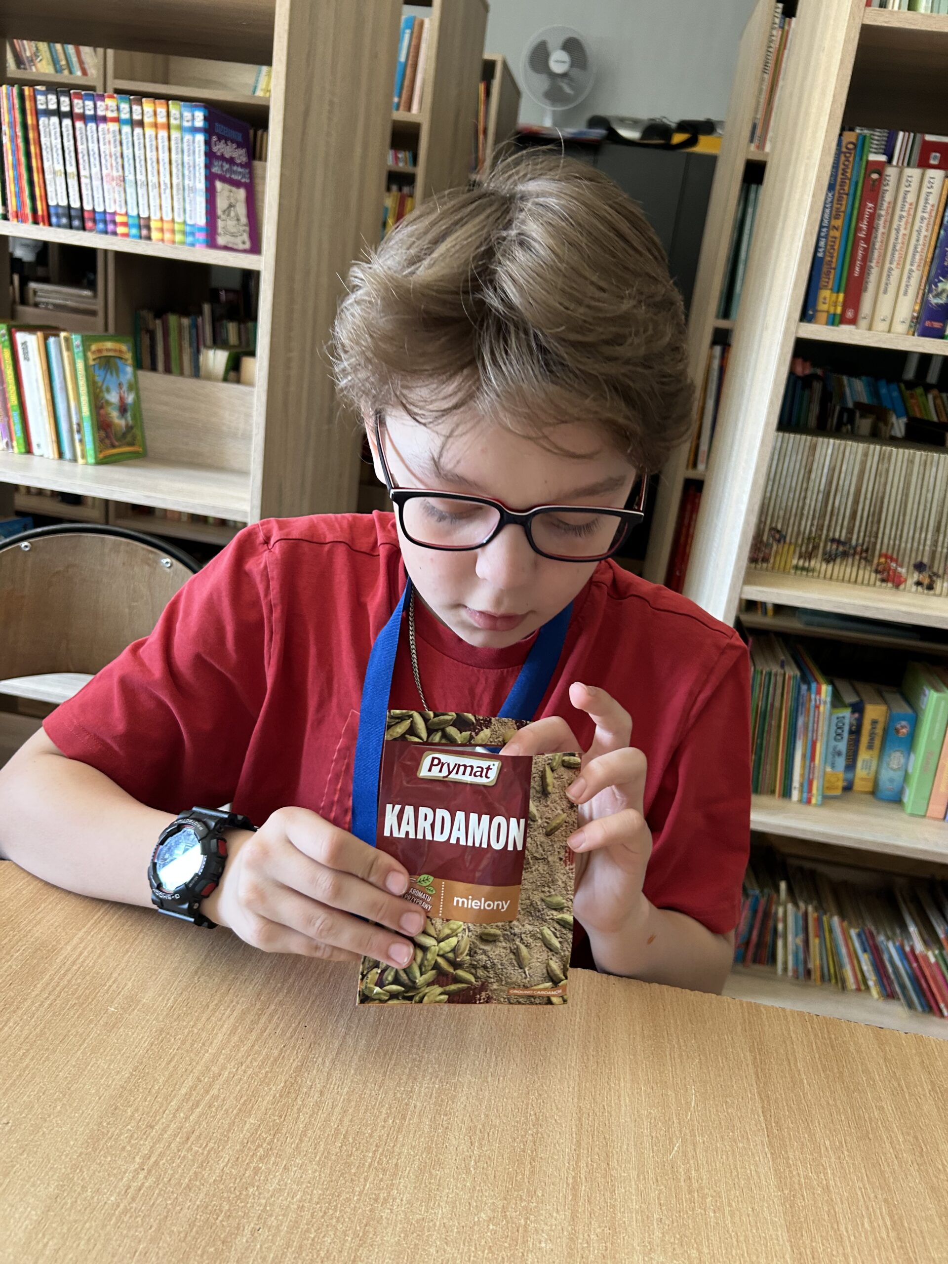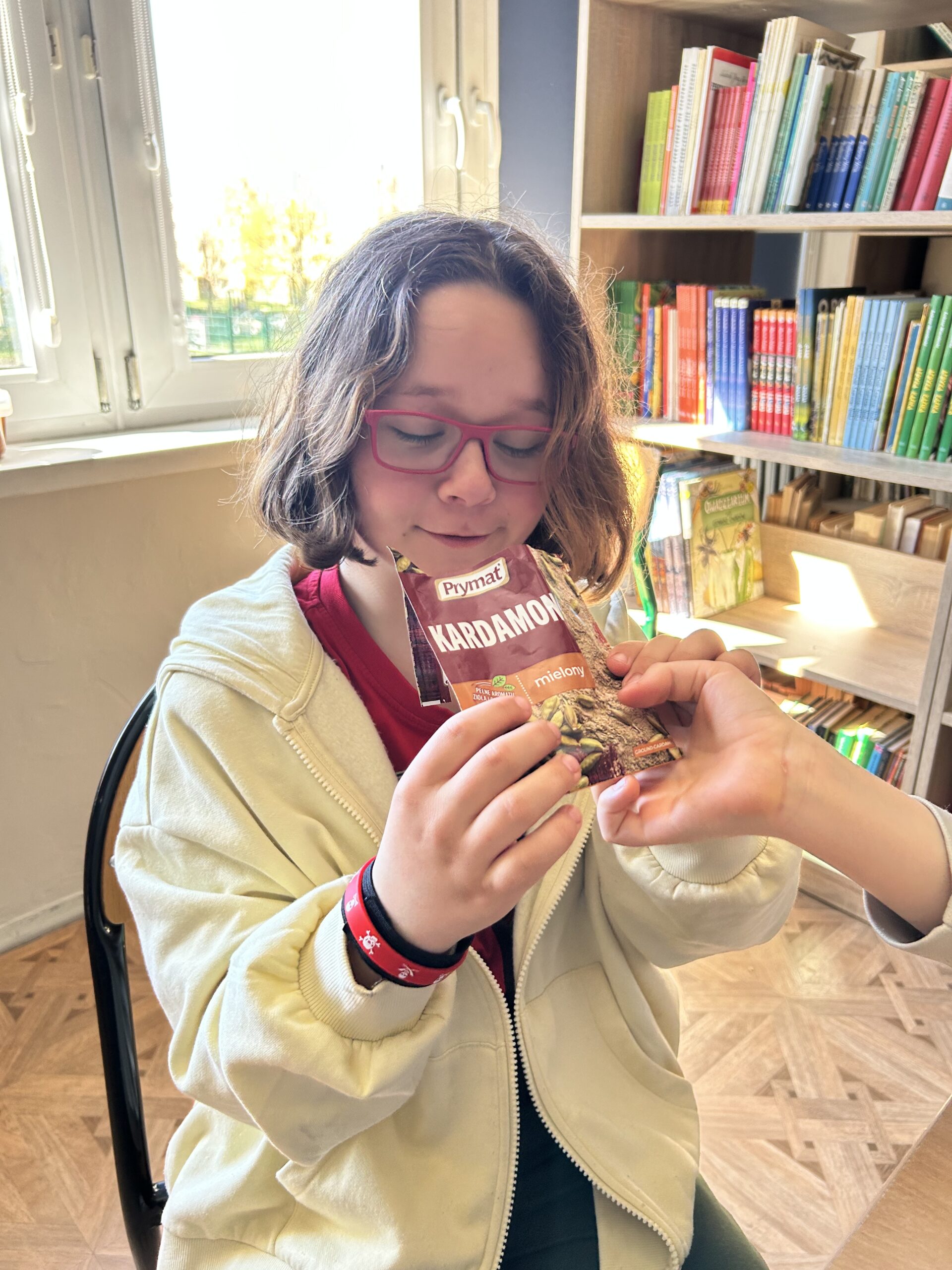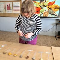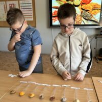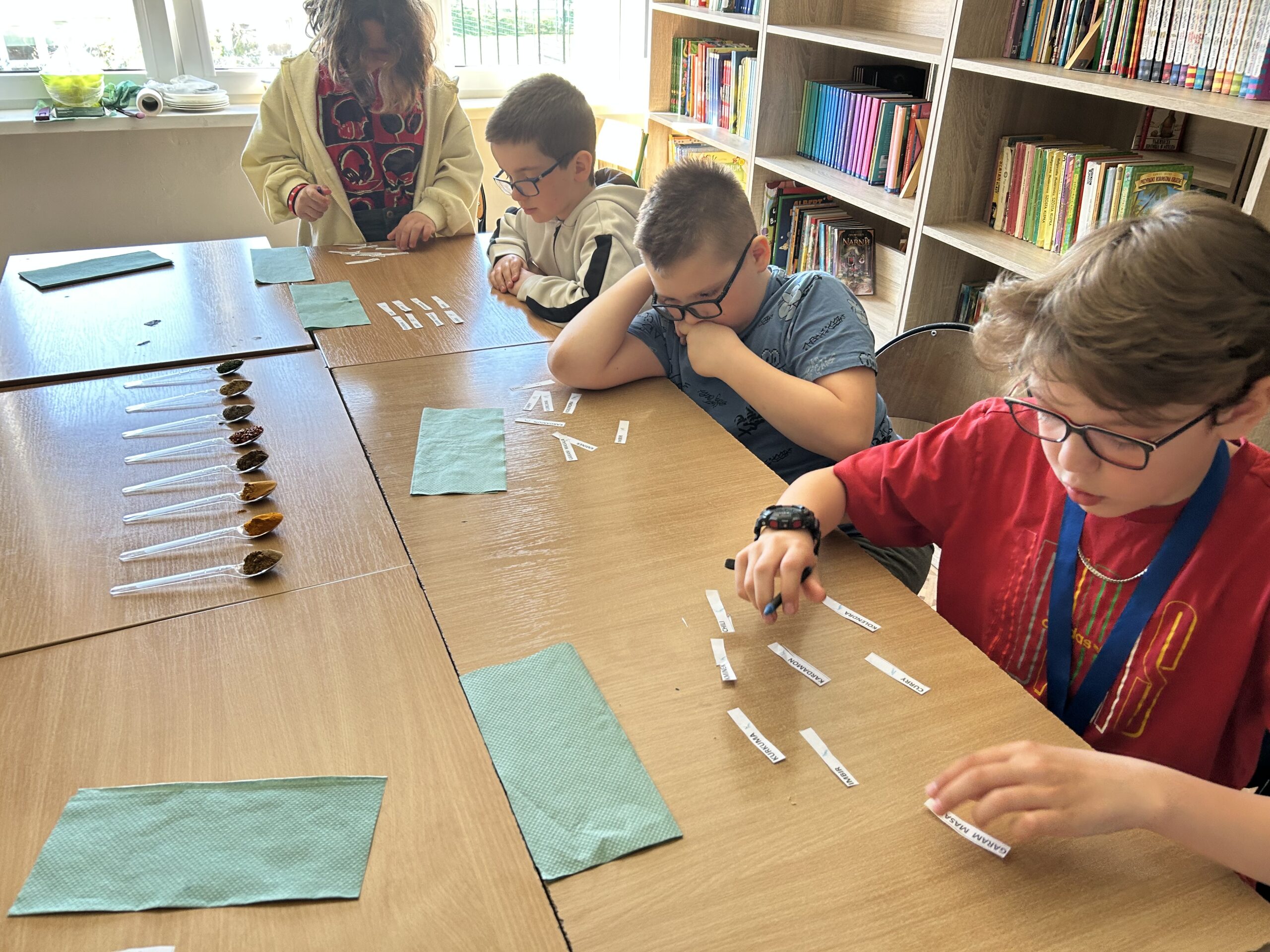 Centralnym punktem spotkania była kuchnia indyjska – intensywna, aromatyczna i różnorodna. Uczniowie pracowali z przyprawami, które stanowią jej podstawę. Rozpoznawali zapachy i dopasowywali nazwy do konkretnych próbek przygotowanych na łyżeczkach. Wśród nich znalazły się m.in.: kurkuma, kumin (kmin rzymski), kolendra, papryka chili, imbir, kardamon oraz mieszanka garam masala. Zadanie angażowało zmysł węchu, rozwijało uważność i sprzyjało zapamiętywaniu nowych pojęć.